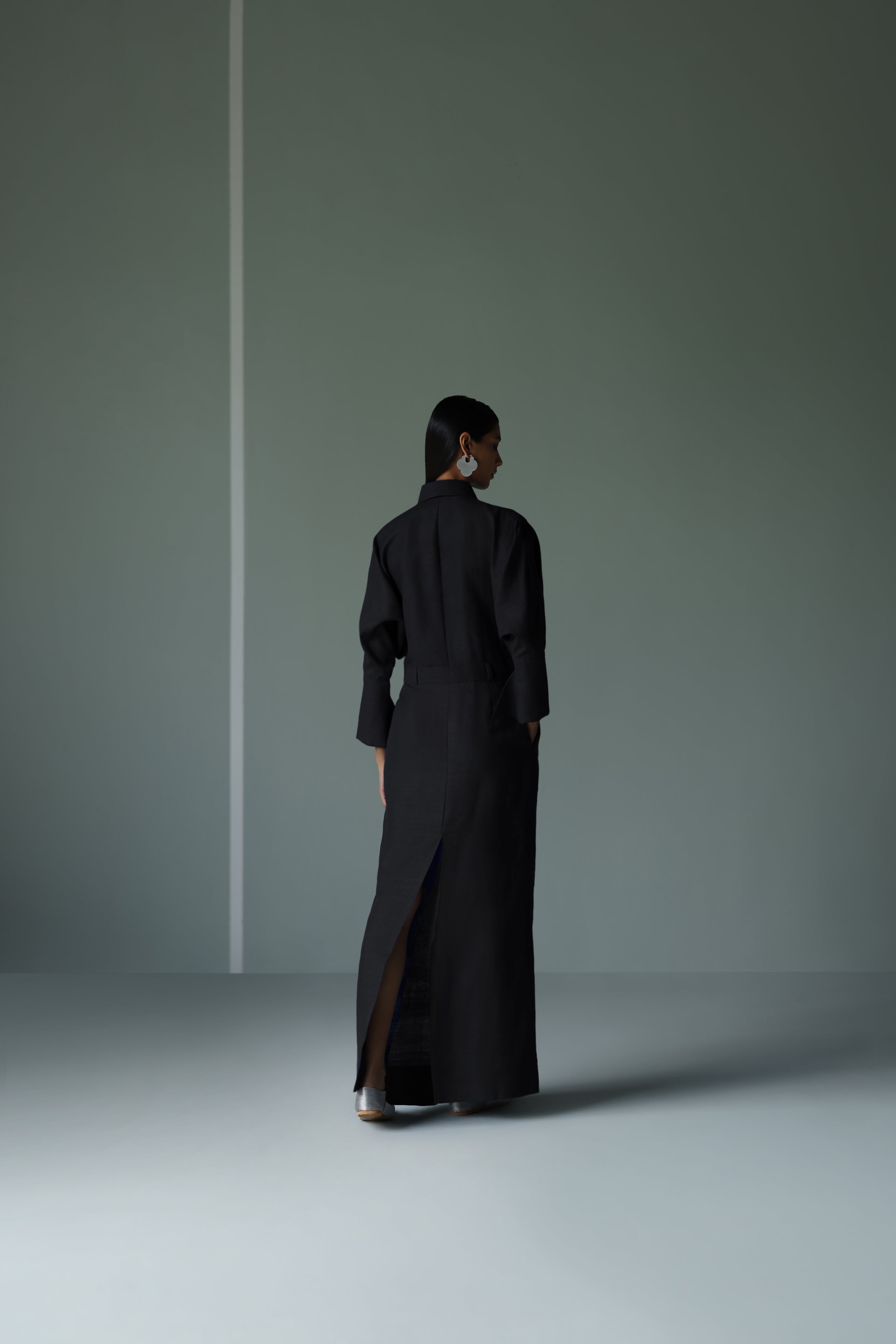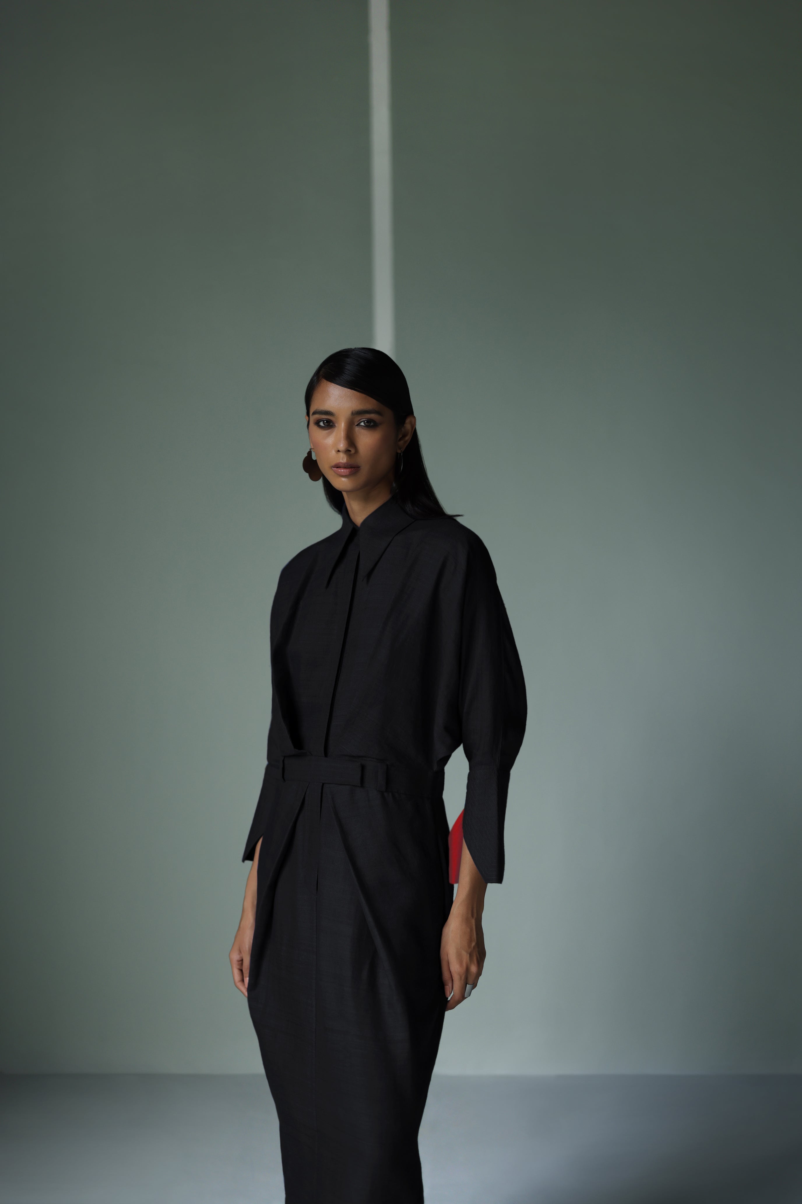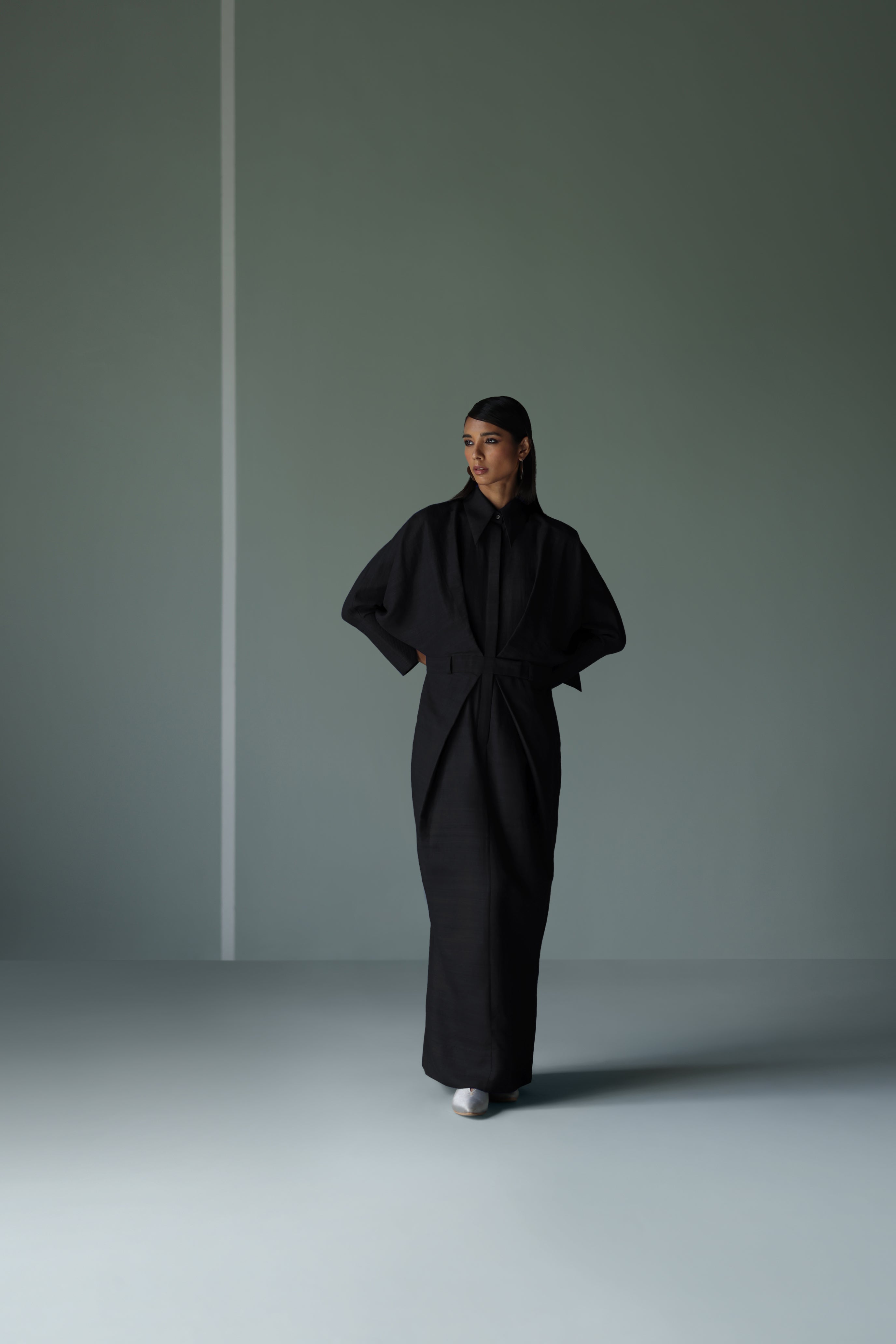 This maxi is woven from matte lightweight silk, featuring an angled pleat detailing that adds a modern edge and a back slit for ease of movement.