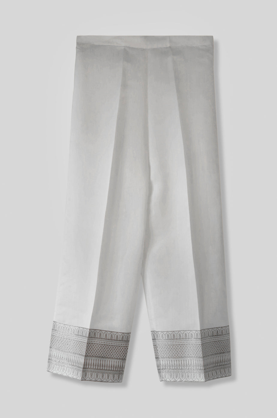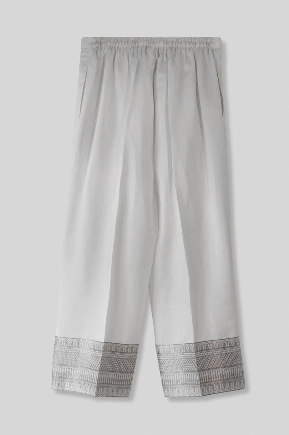 It is paired with our lounge pant, featuring brocade details at the hem.