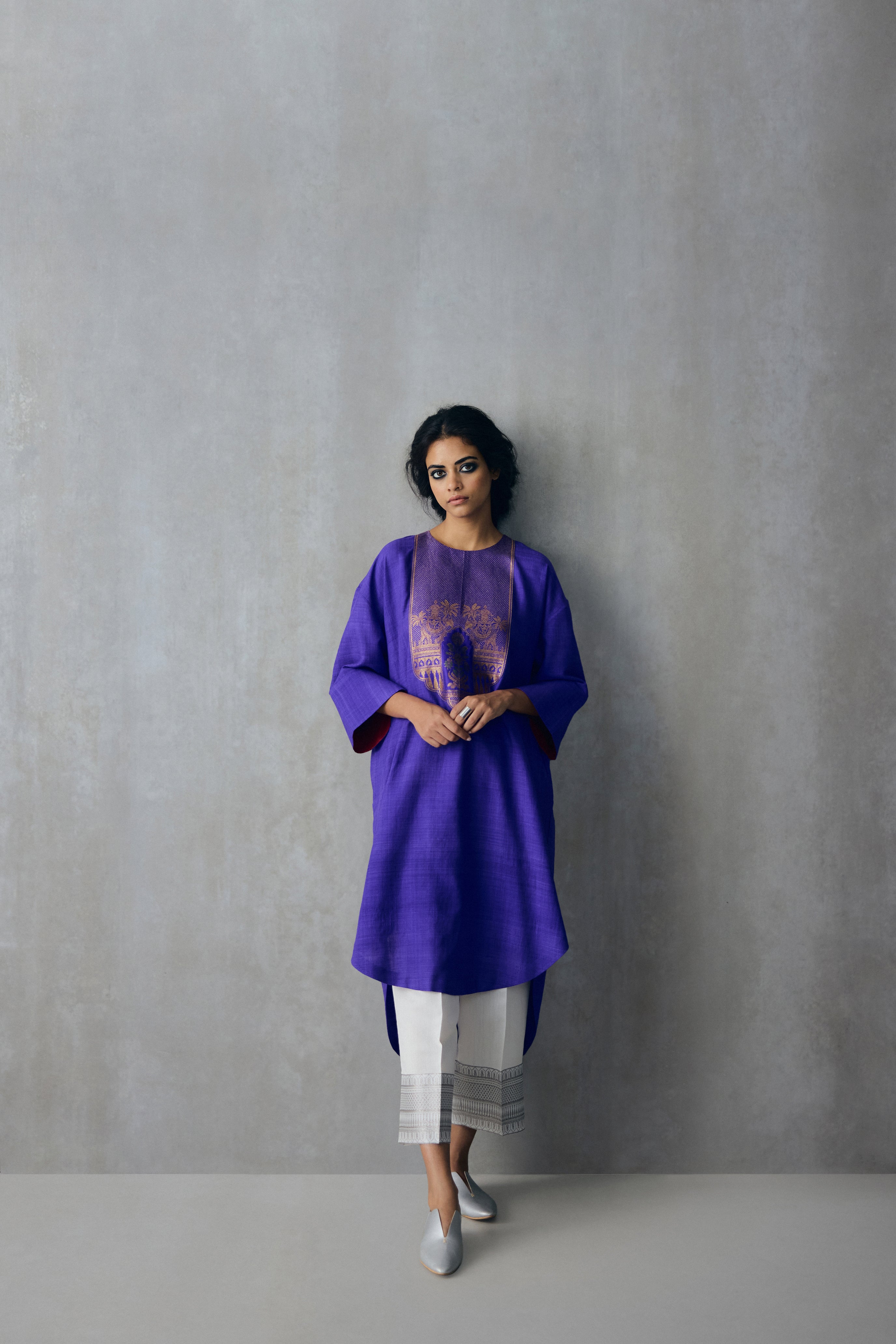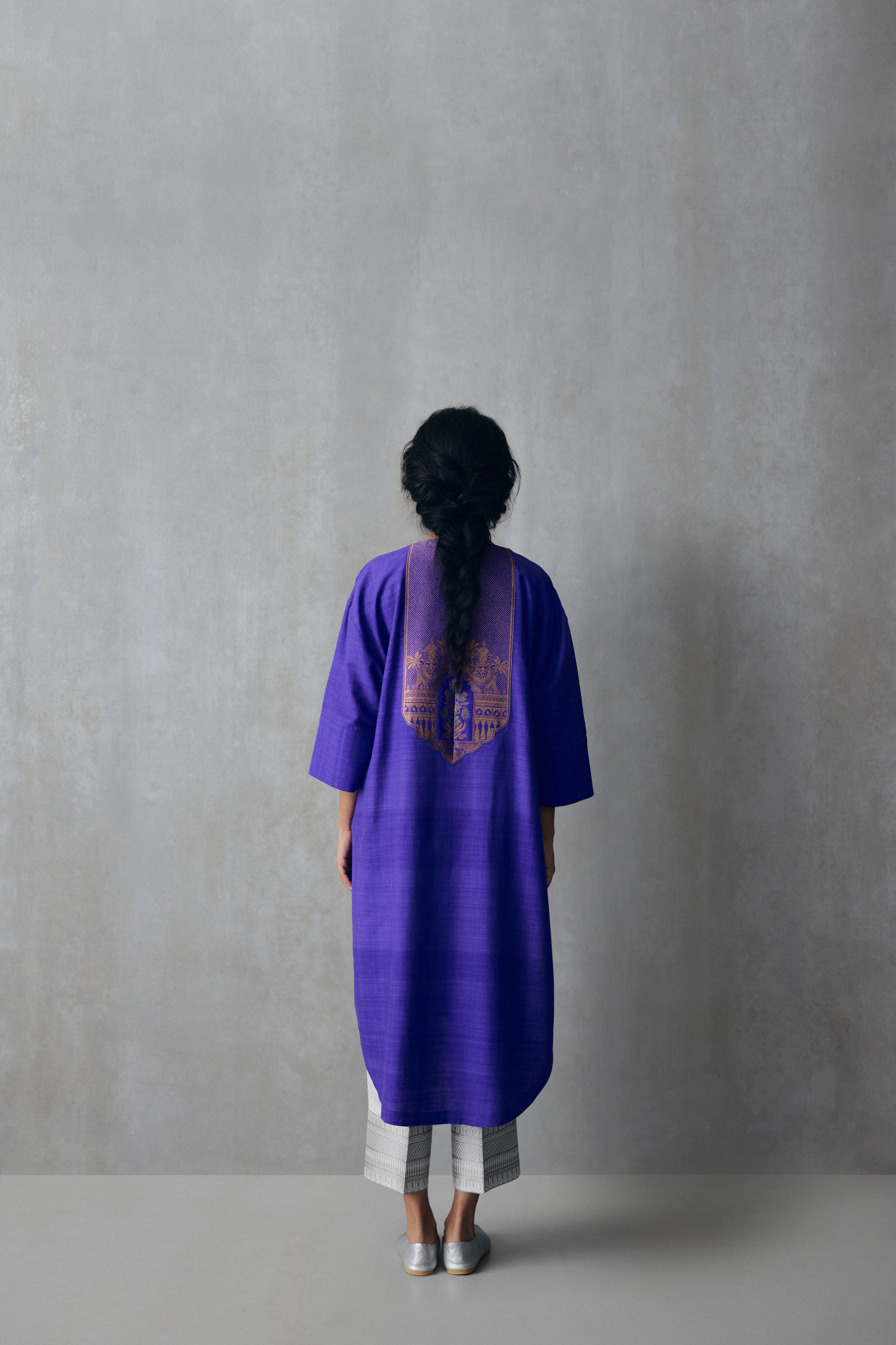 A handwoven silk tunic with an engineered brocade yoke at the front and back. Its high-low hemline lends an effortless twist to this classic silhouette, while the deep pockets offer comfort.