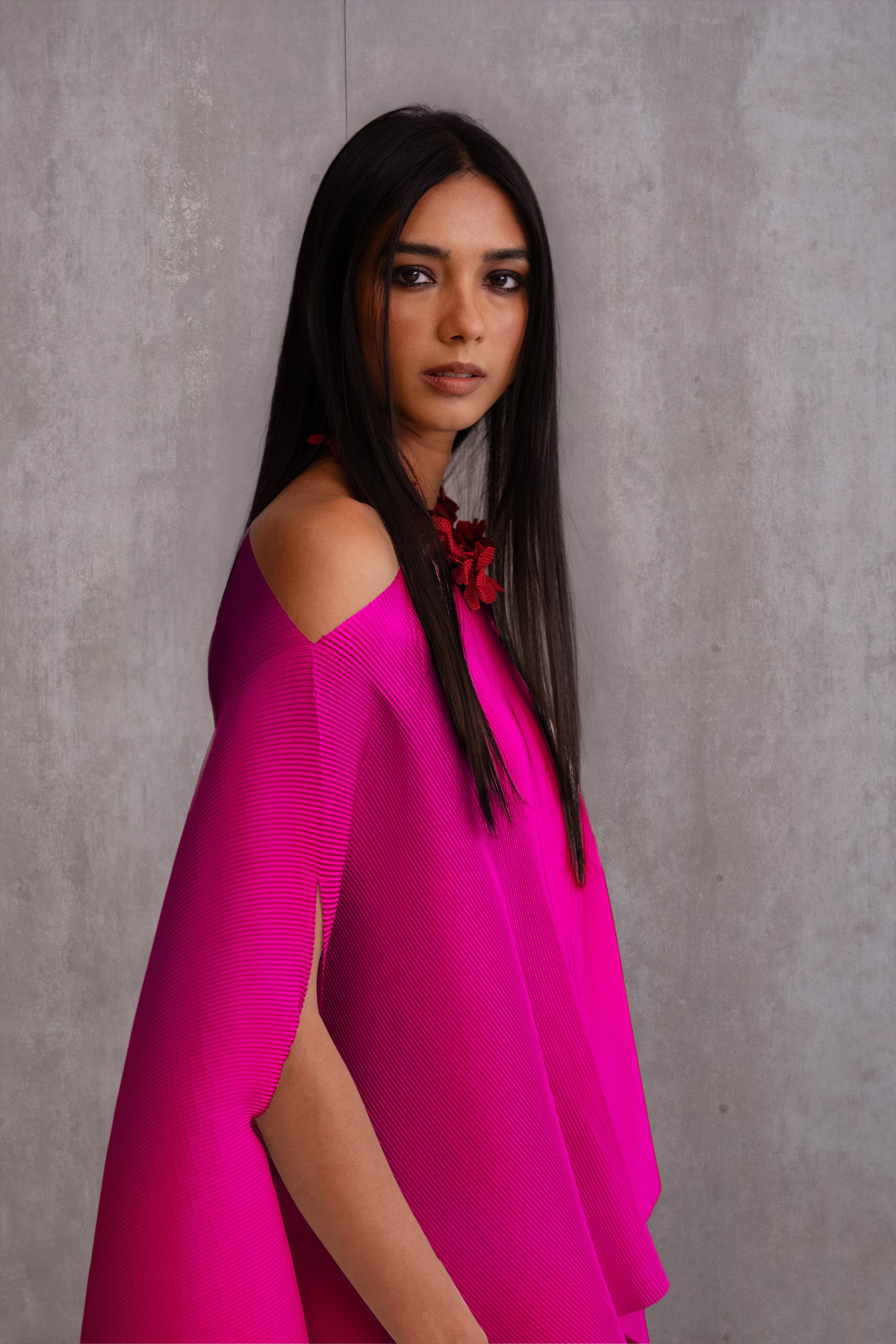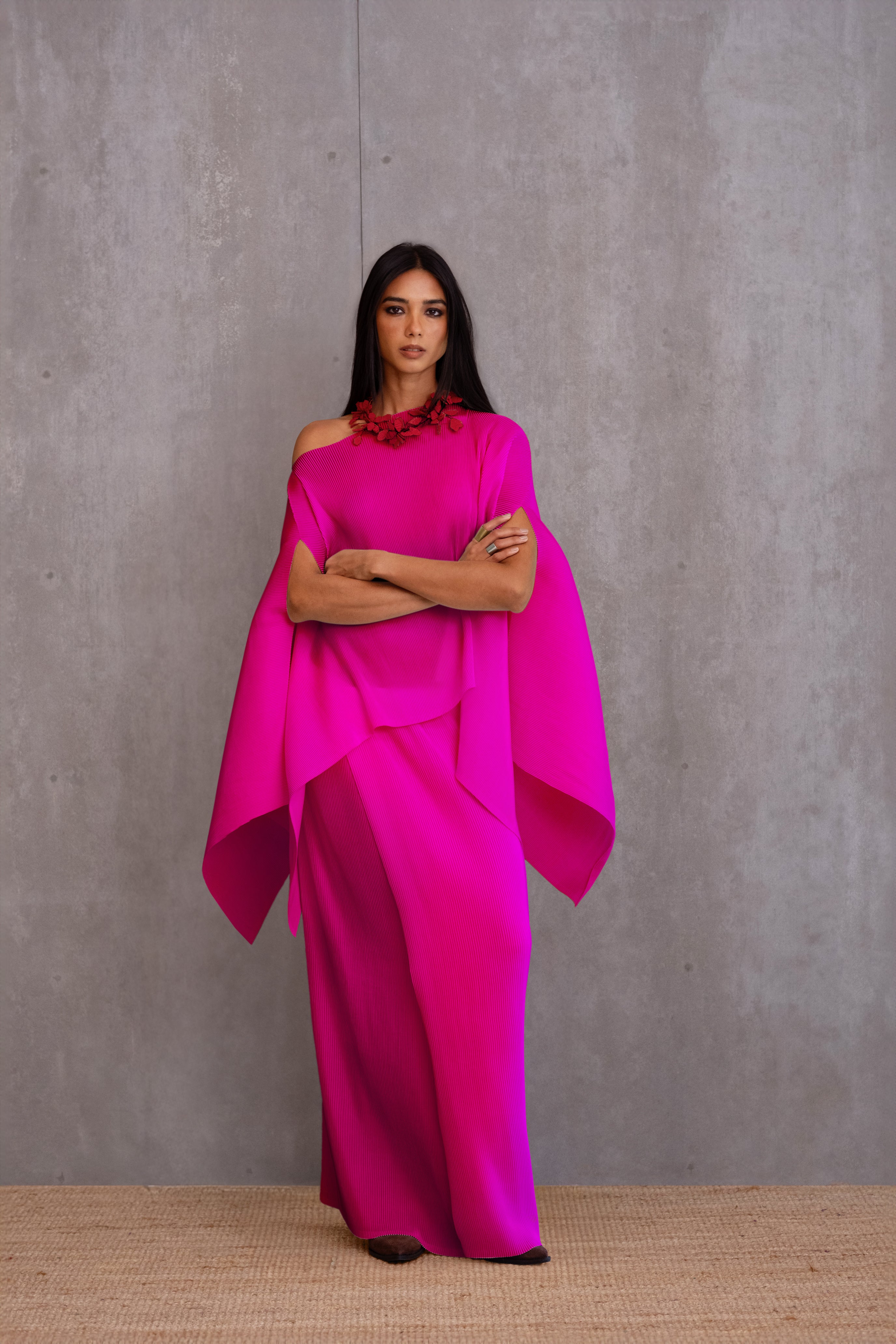 A brand signature, our pleated short poncho is a versatile piece that can be effortlessly dressed up or down. It is designed in a one-size fit, crafted to complement varied body types.