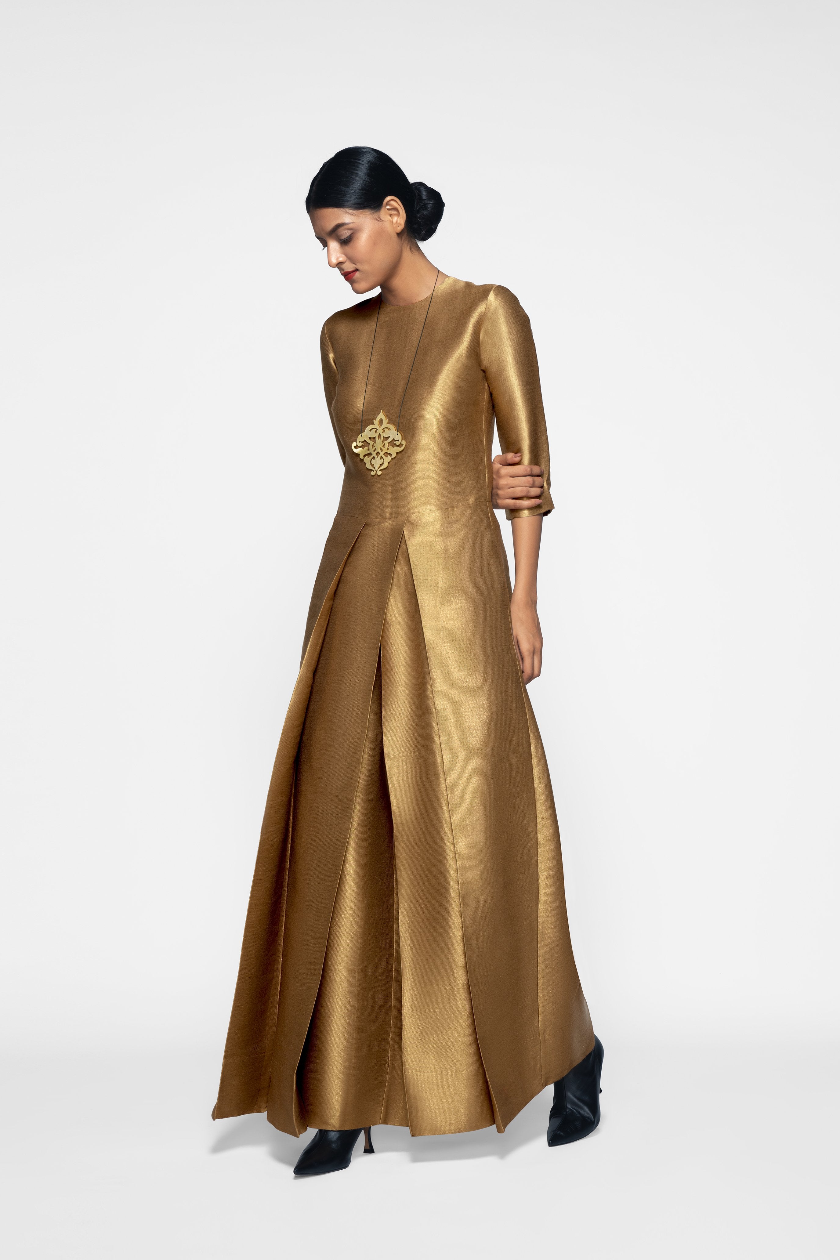 Clean lines and minimal construction come together in this handwoven silk brocade jumpsuit. The carefully constructed and angled pleats add ease of movement while still maintaining the strict structure of the design.