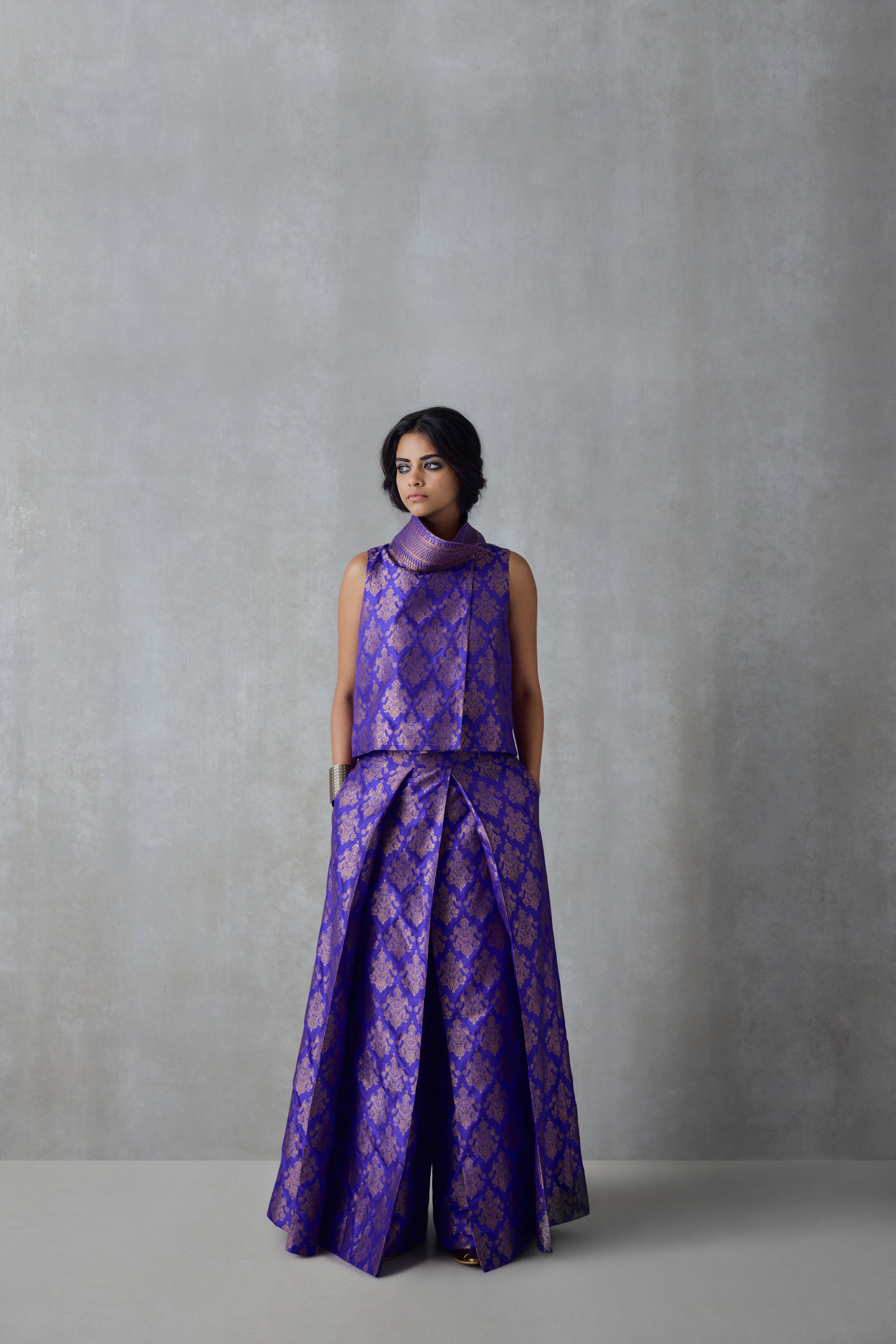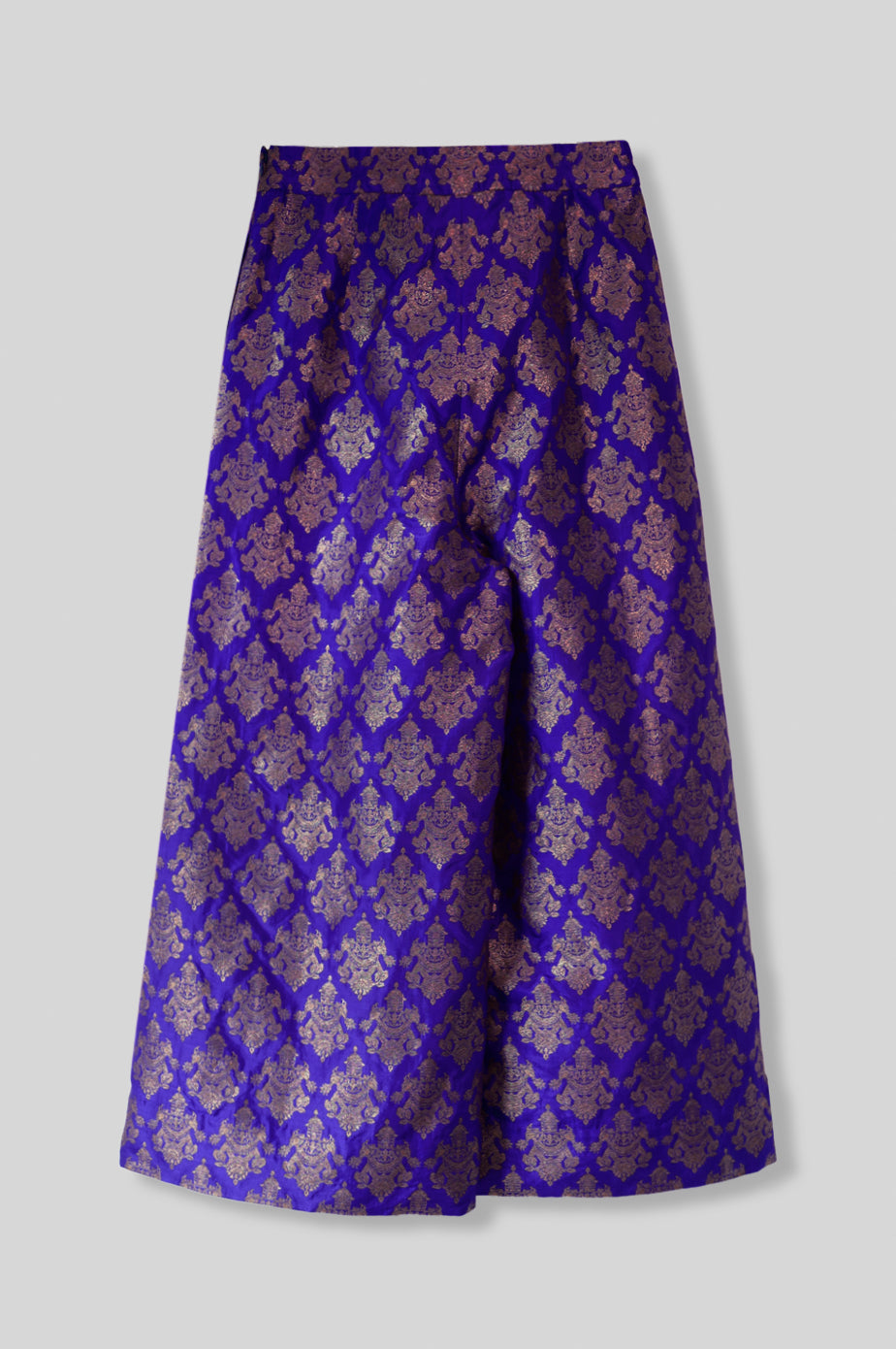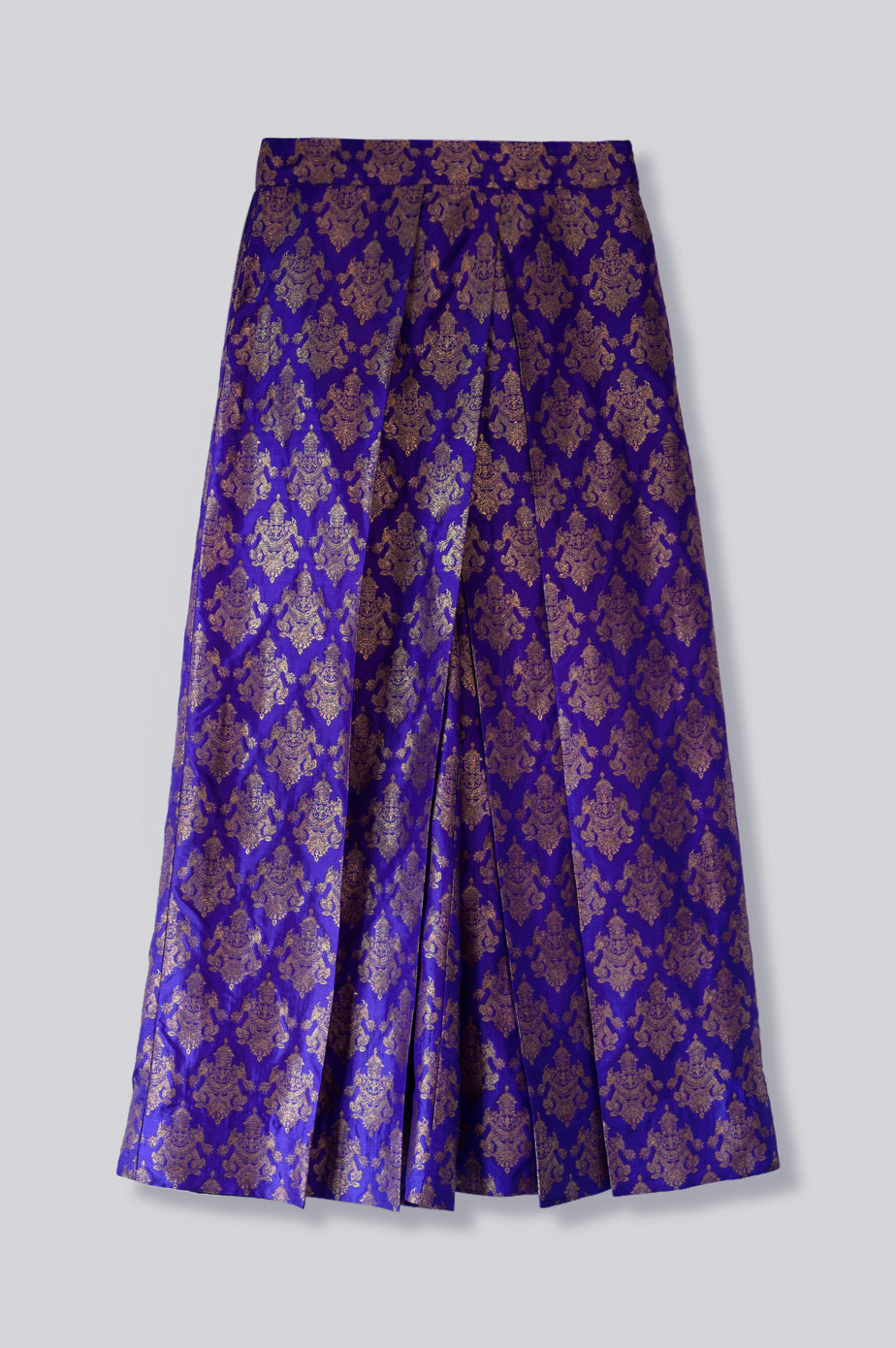 A lightweight palazzo, designed with angled pleats to balance ease of movement with structure. It is handwoven in silk brocade and finished with a contrast lining plus pockets for functionality.