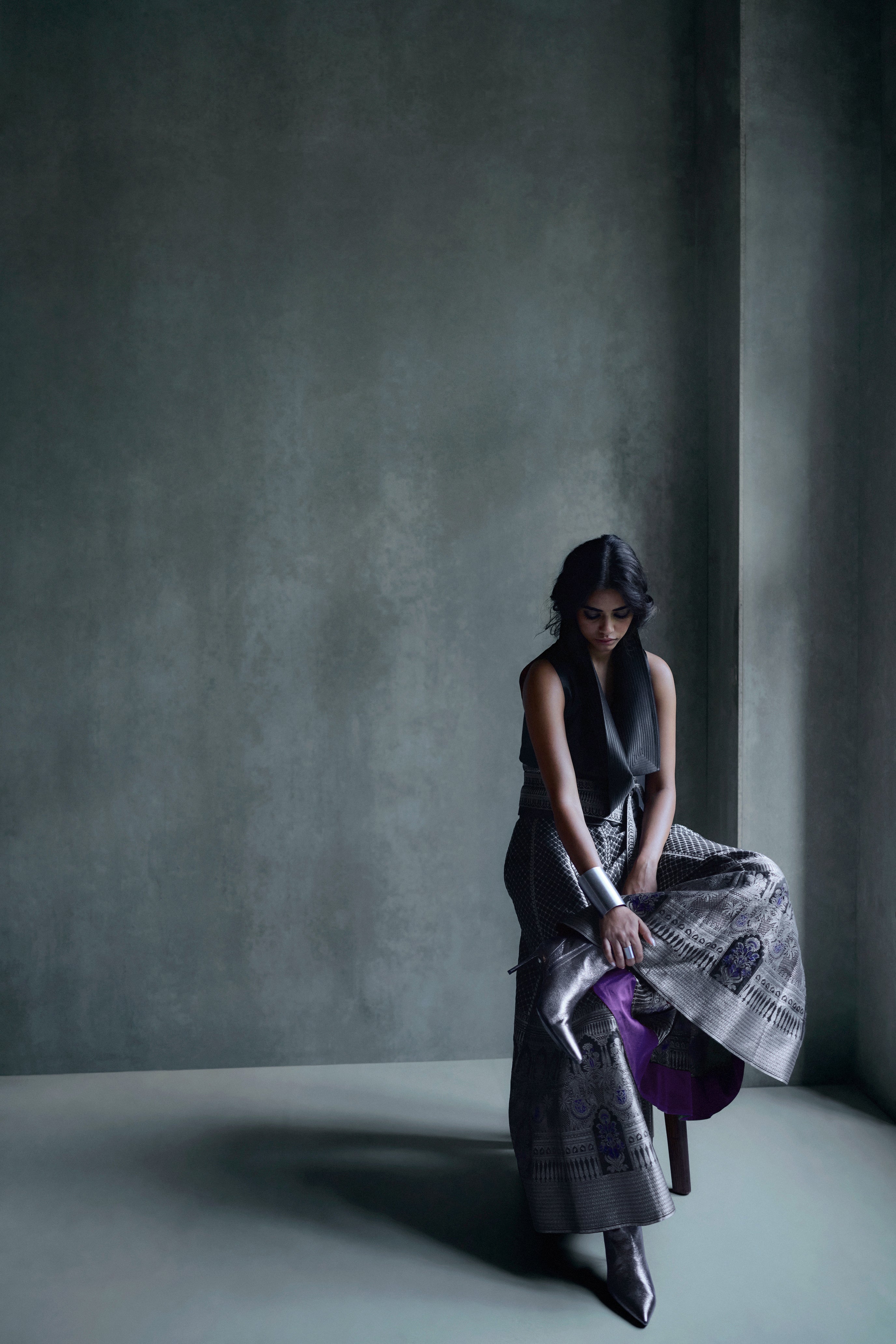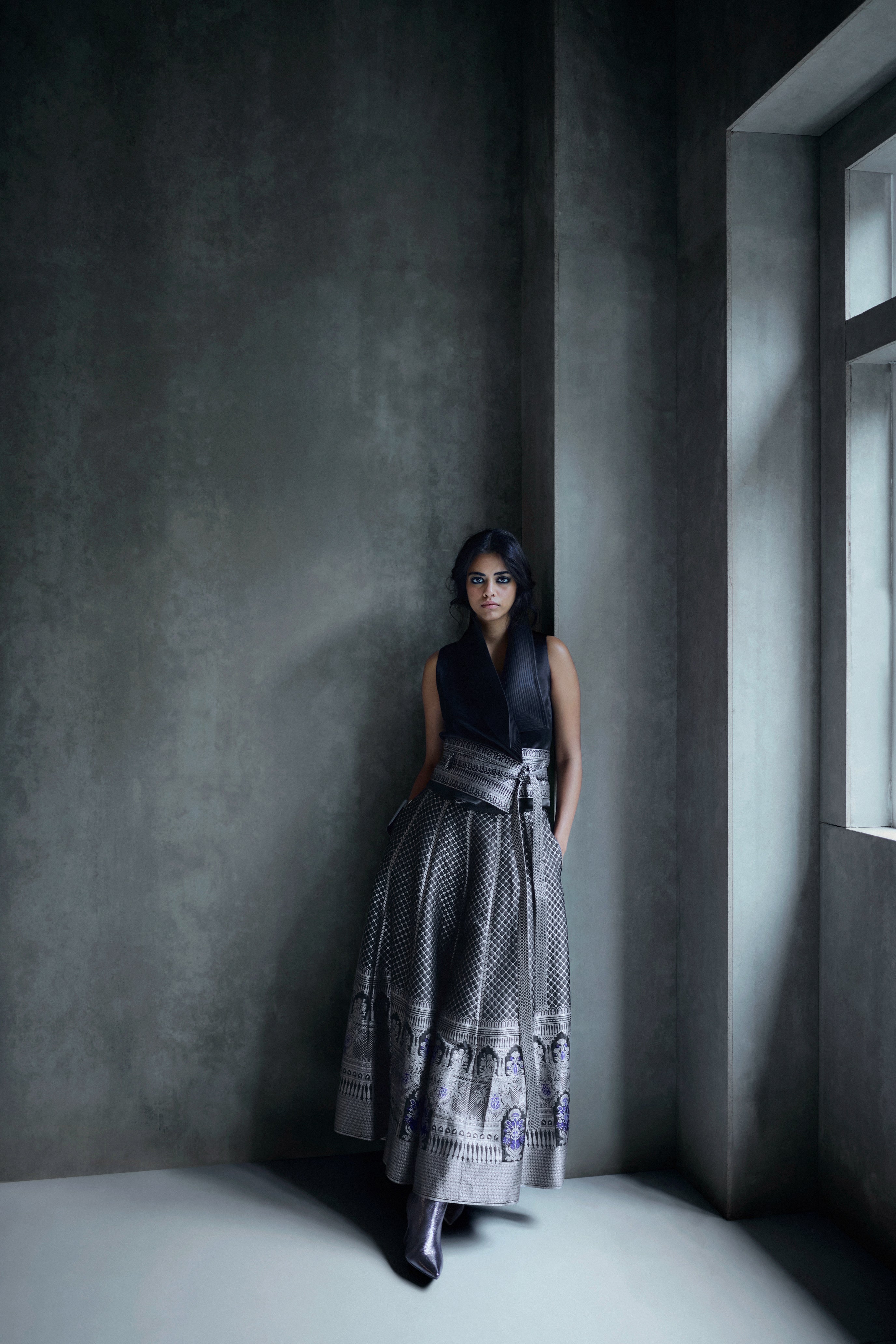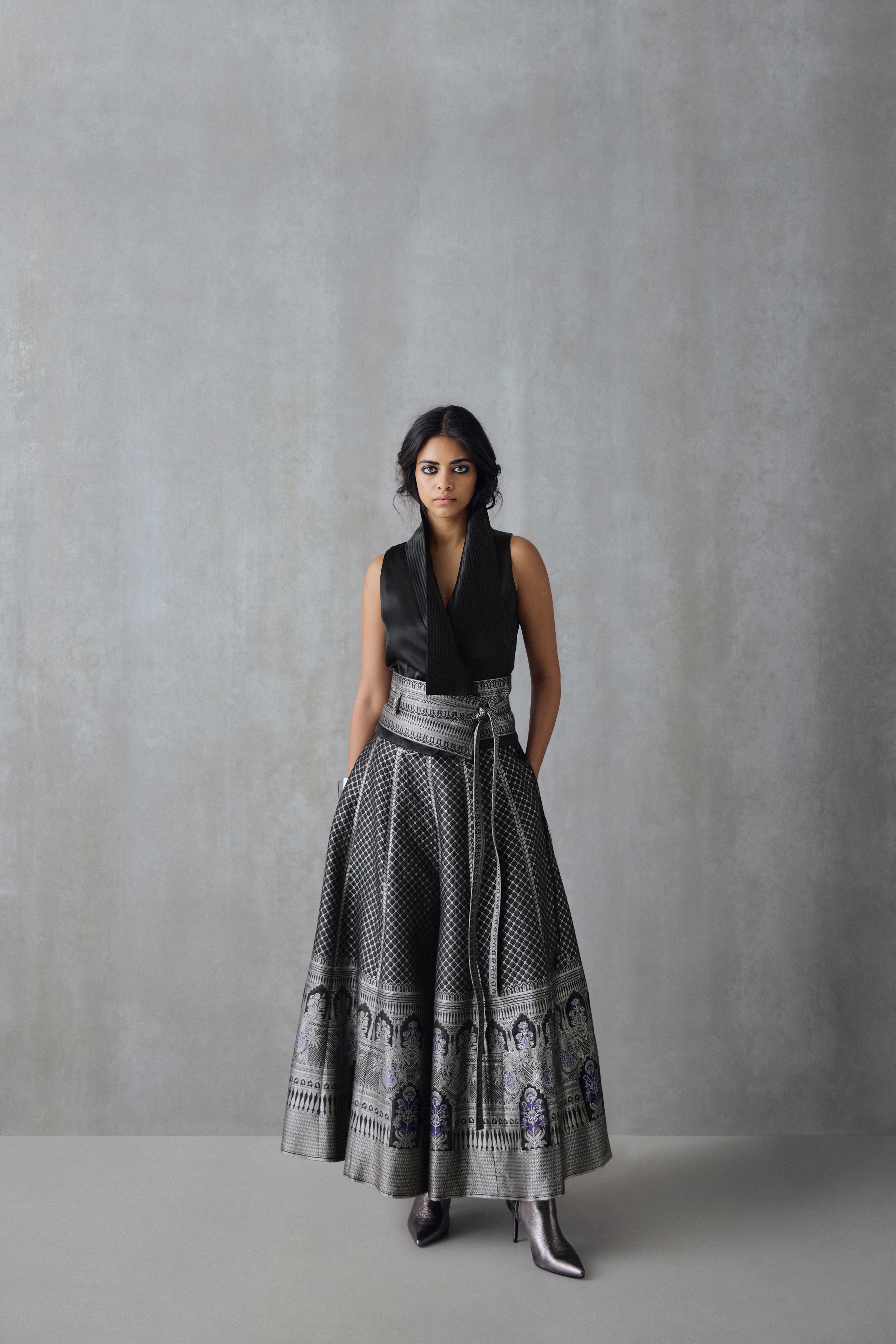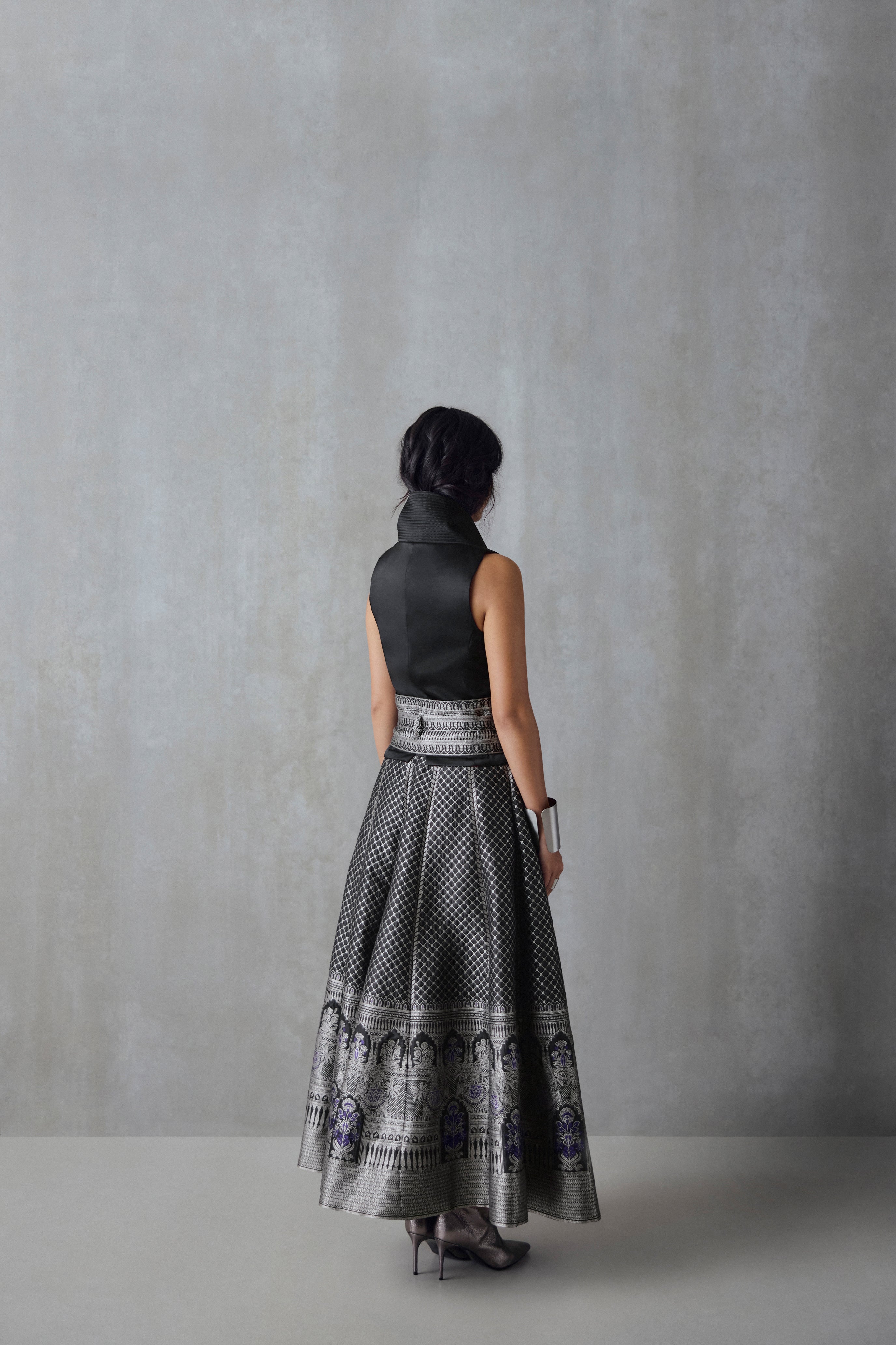 Our engineered brocade palazzo, crafted from handwoven silk, features a contrast lining and pockets for utility. It combines the comfort of trousers with the finesse of a skirt.