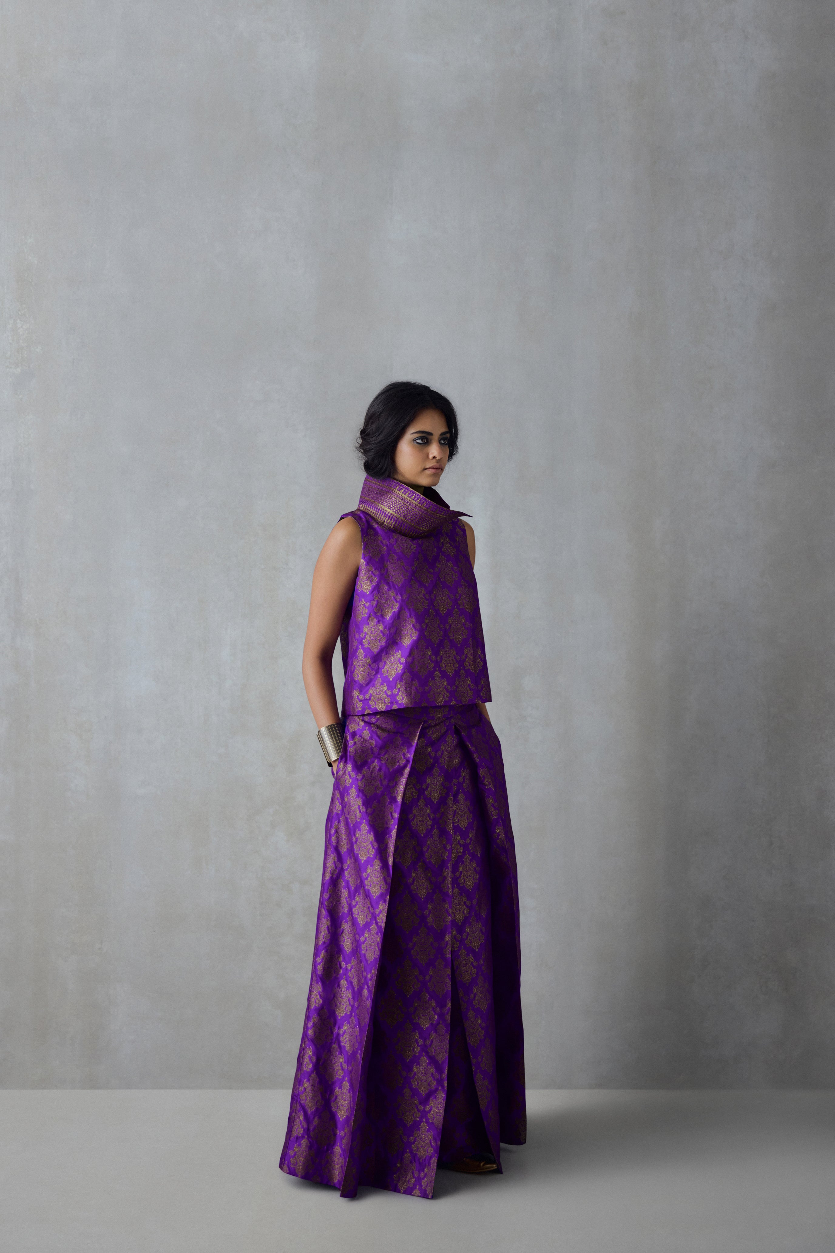 Featuring an architectural collar, this silk brocade waistcoat offers a modern take on a classic silhouette, and is finished with a contrast lining.