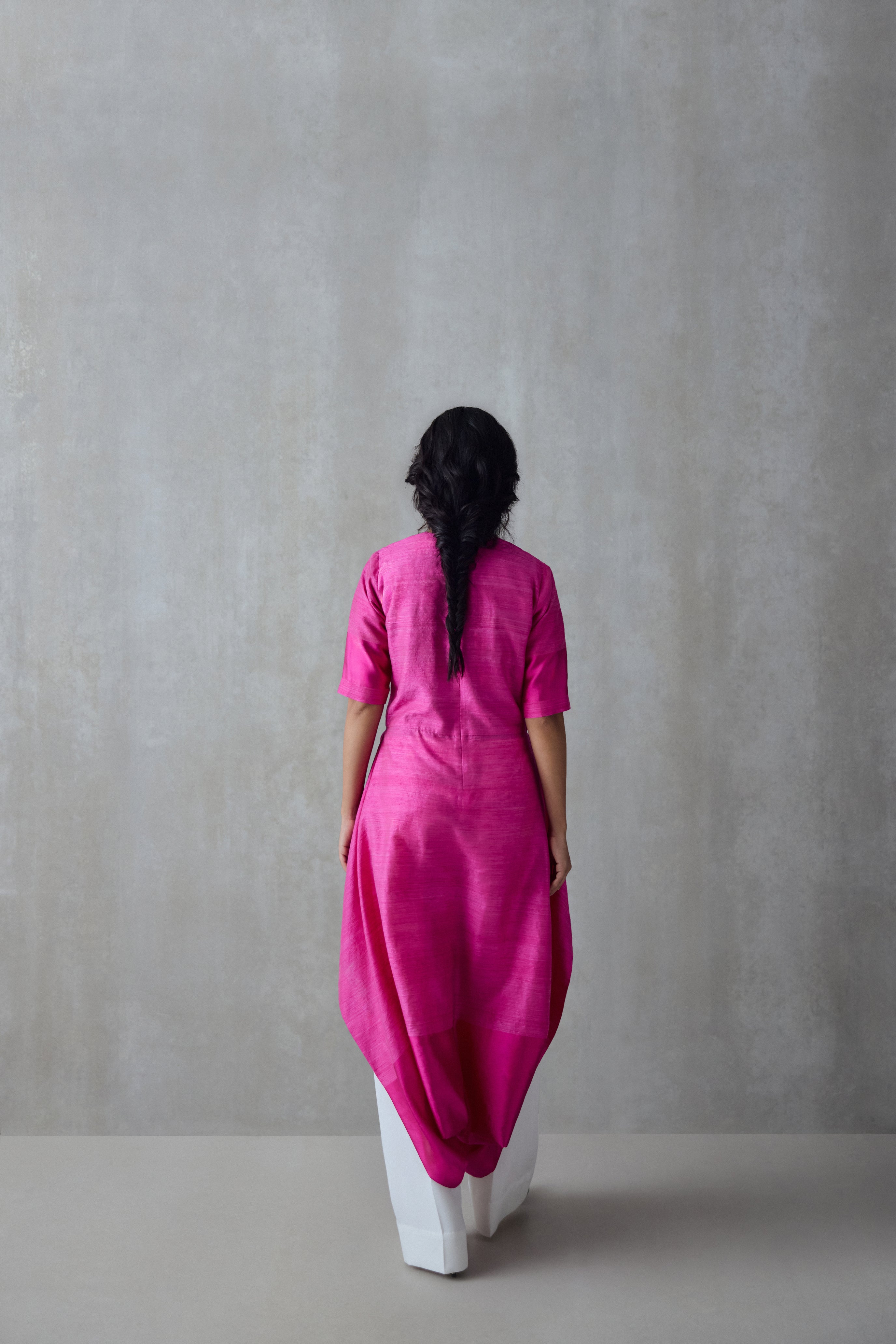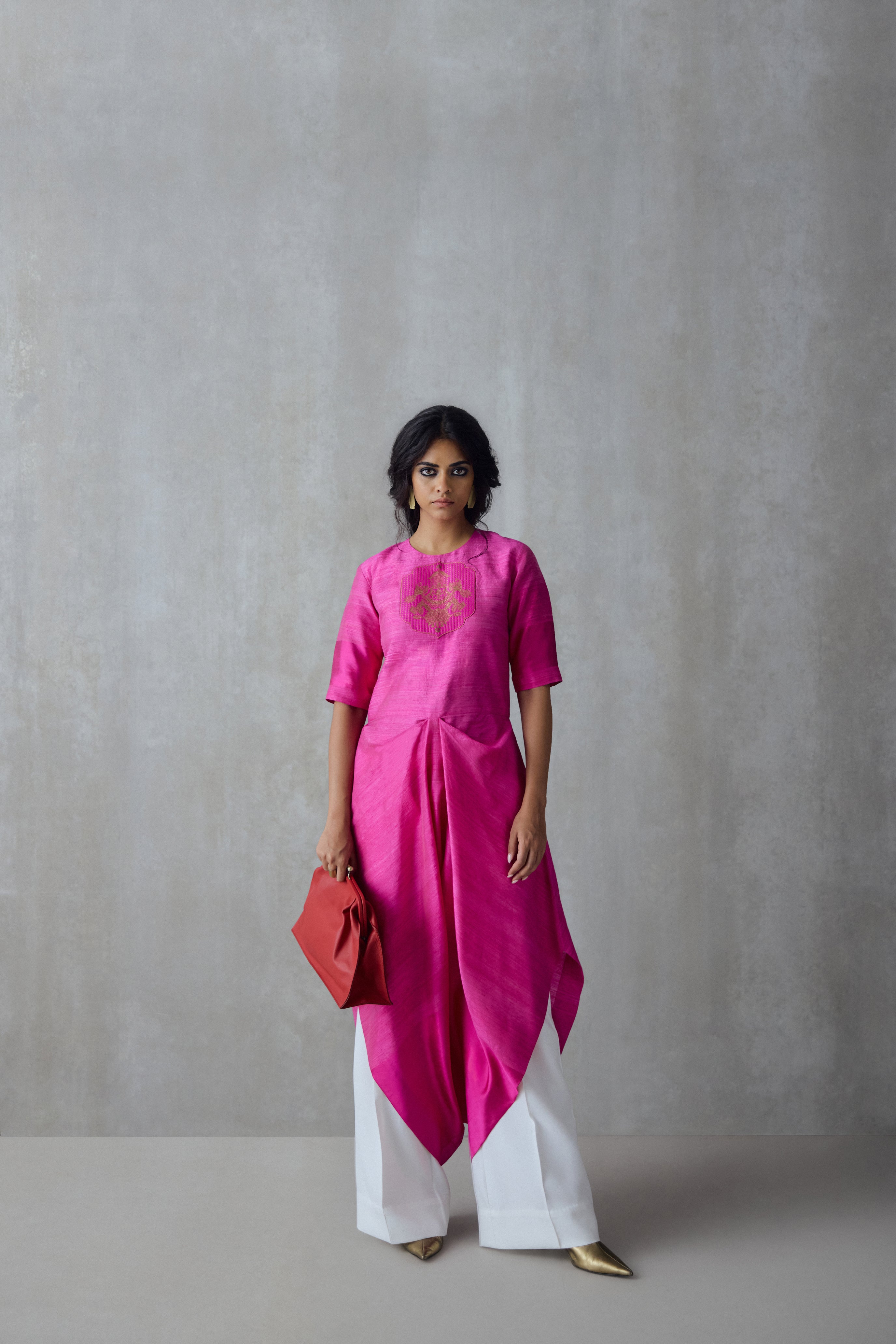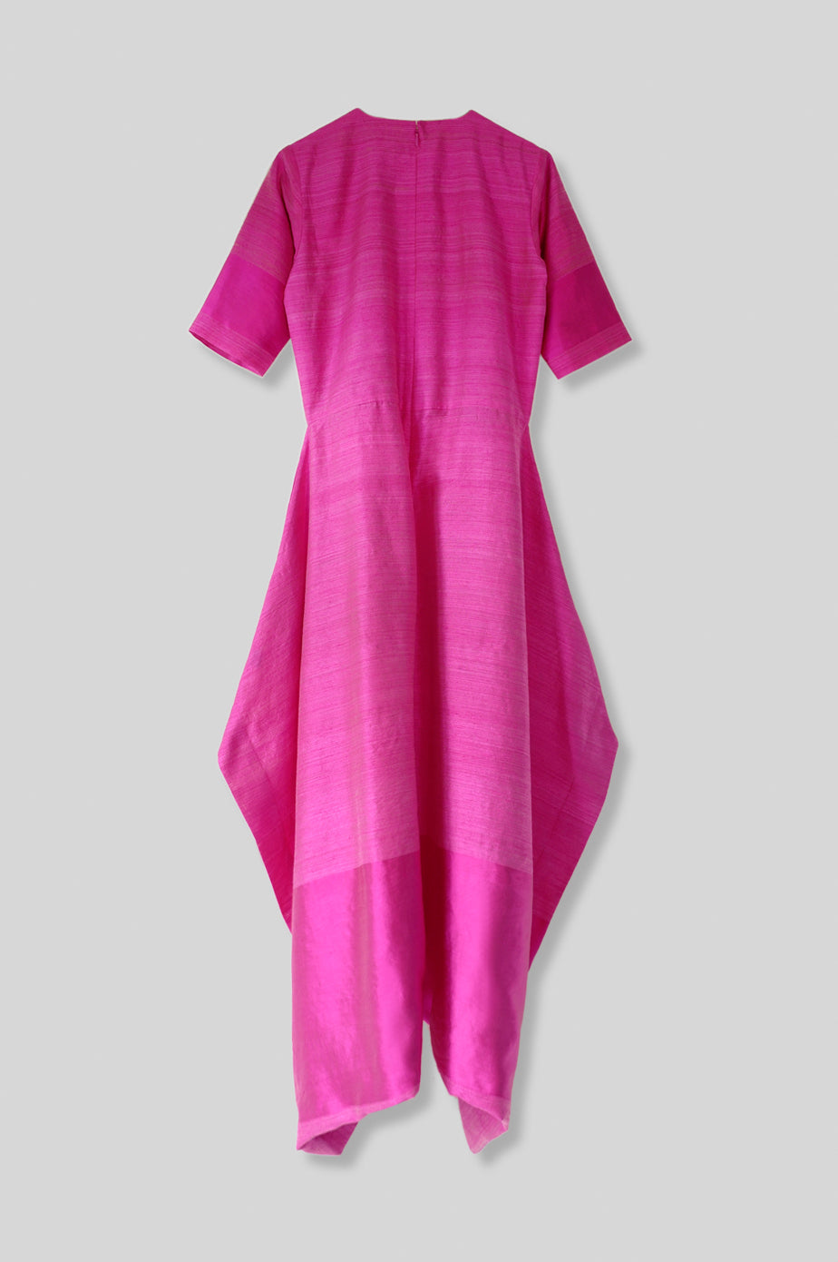 This jumpsuit balances structure with fluidity in a contemporary silhouette. The draped detail enhances ease of movement, while the pockets add comfort. Handwoven to create subtle shifts in texture, it is finished with brocade details at the yoke and a concealed zipper at the back.