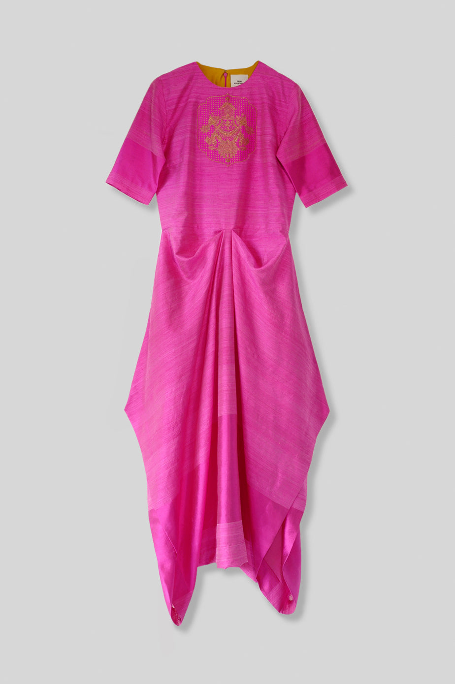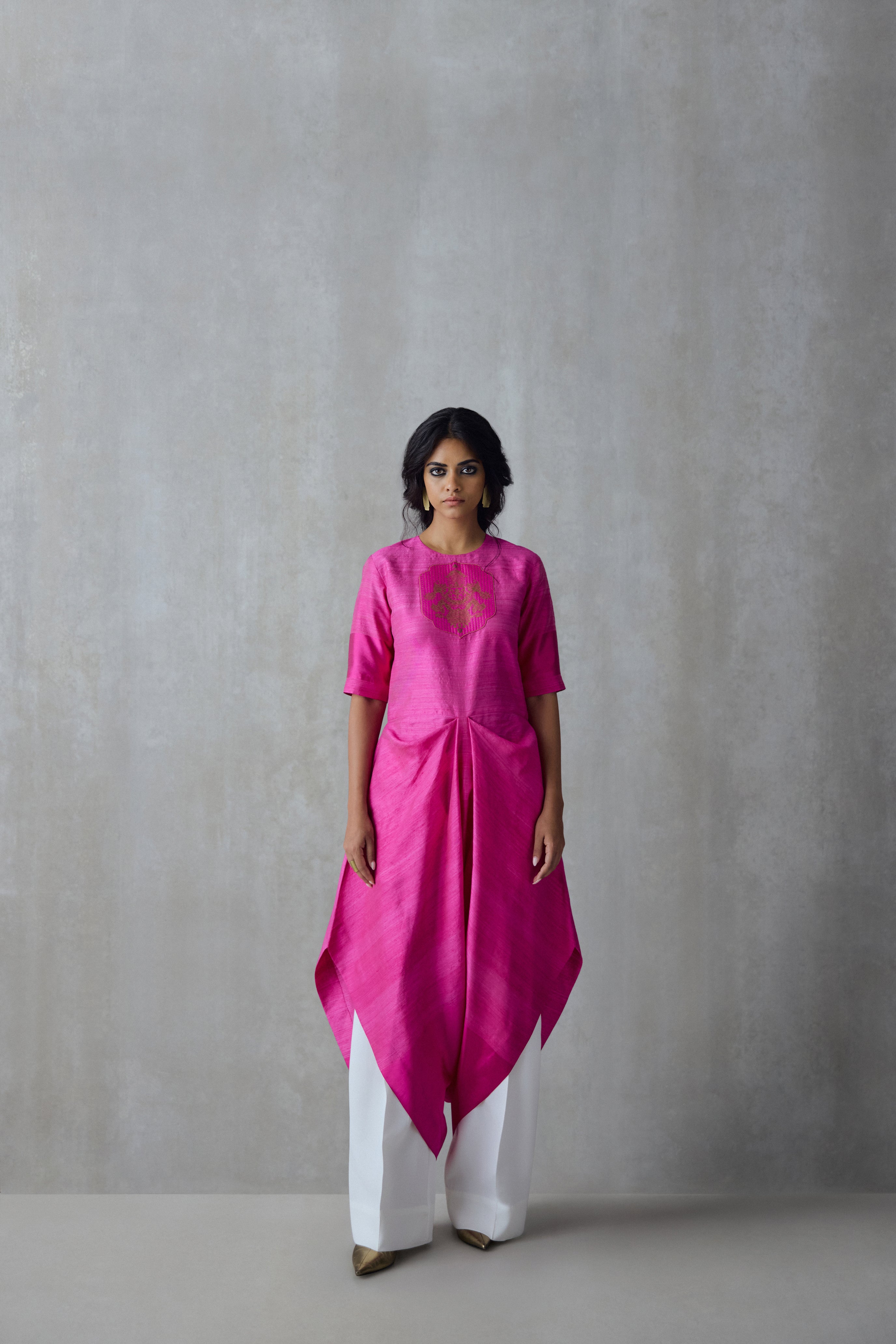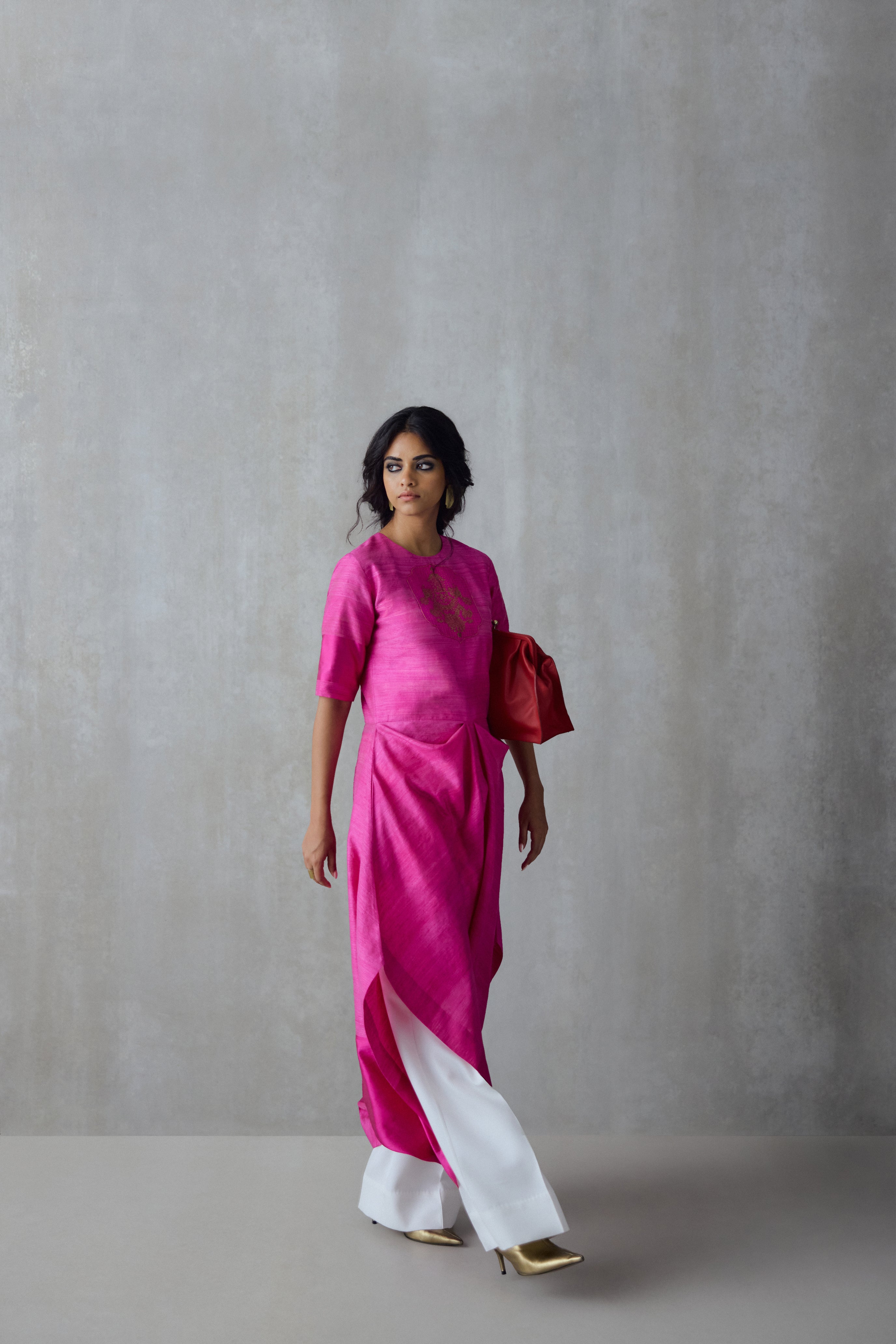 This jumpsuit balances structure with fluidity in a contemporary silhouette. The draped detail enhances ease of movement, while the pockets add comfort. Handwoven to create subtle shifts in texture, it is finished with brocade details at the yoke and a concealed zipper at the back.