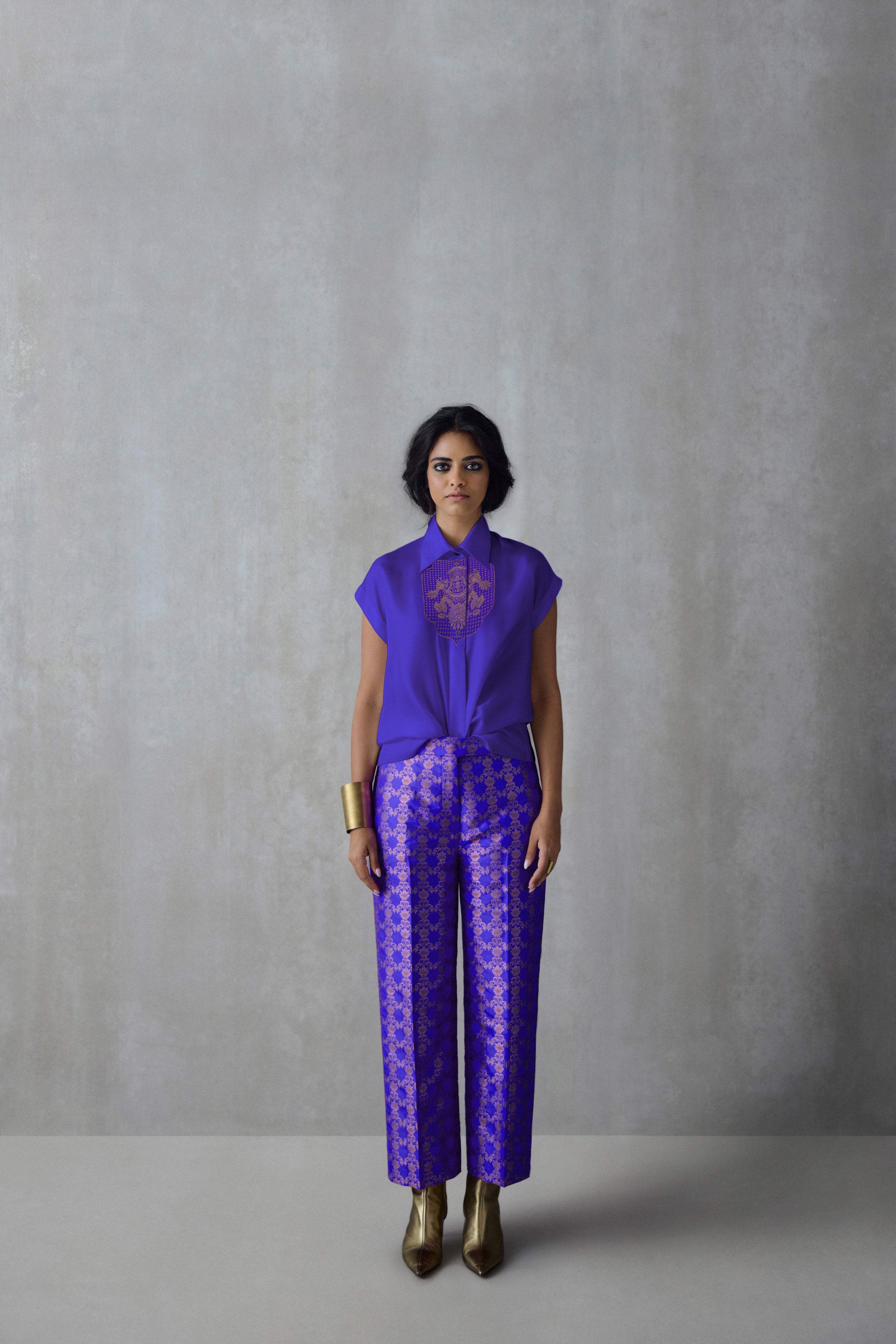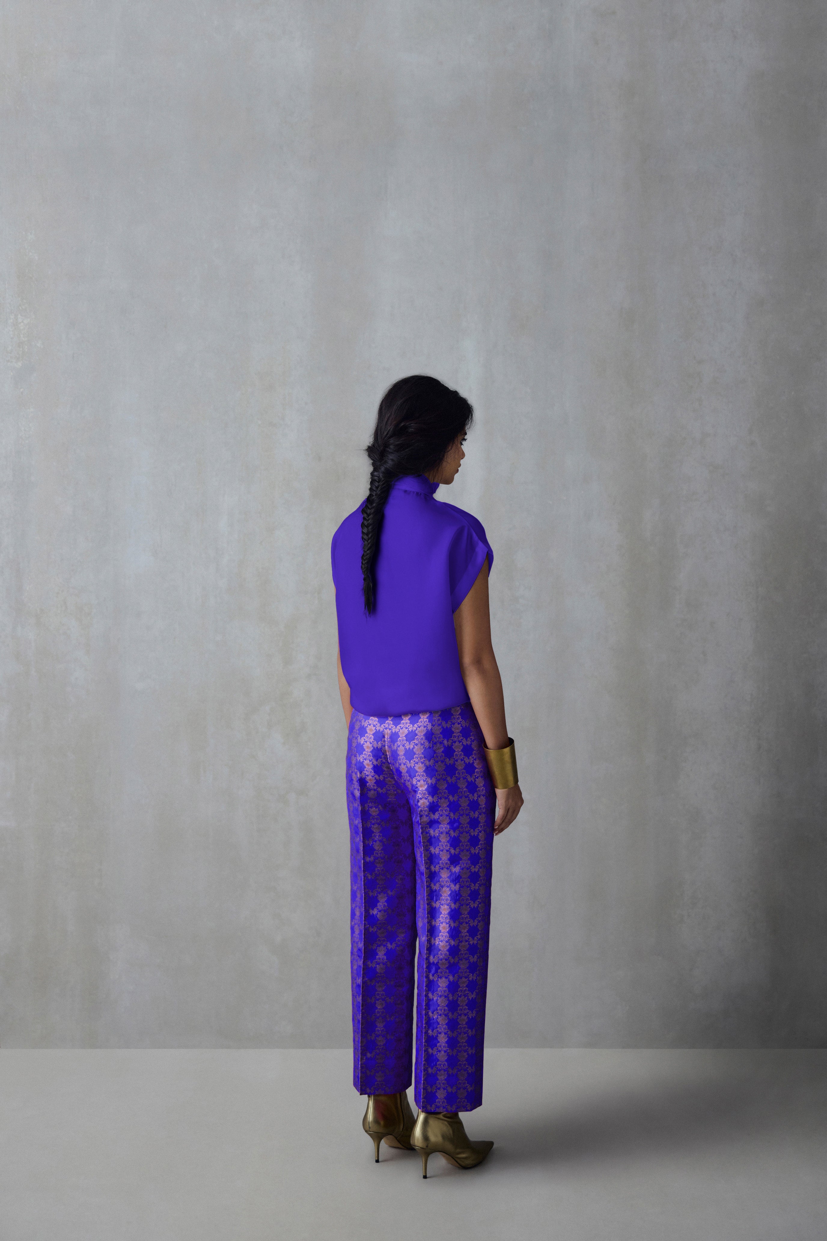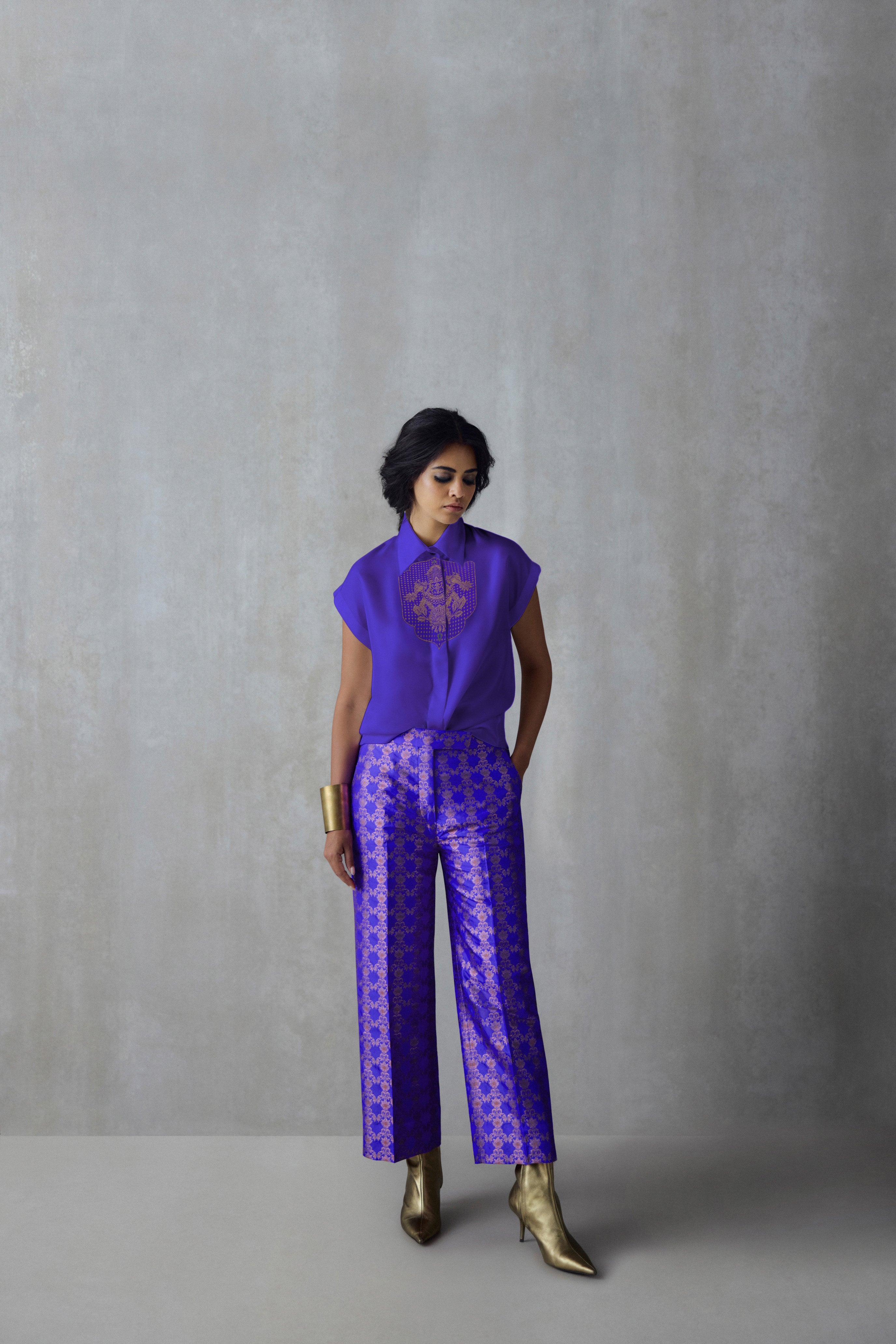 A versatile silk shirt that can be effortlessly paired with separates from your existing wardrobe. It features brocade details at the neckline, a drop-shoulder and a concealed button placket.