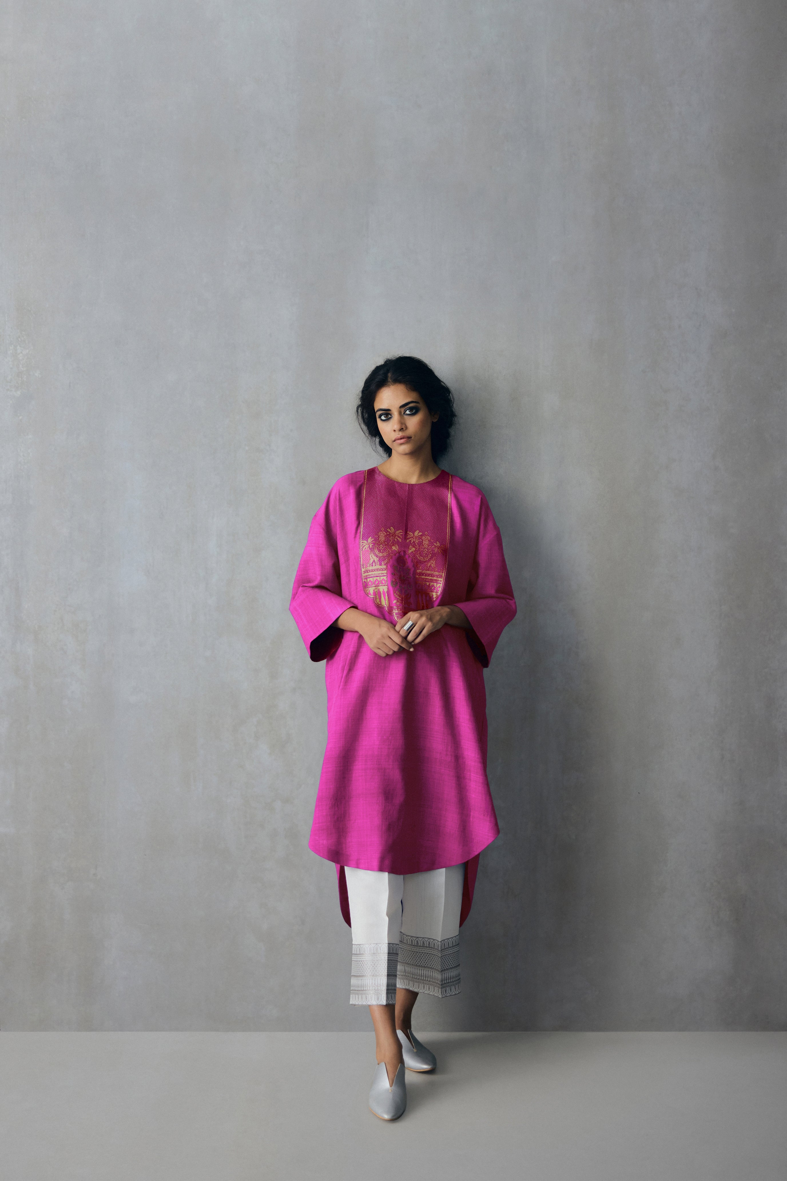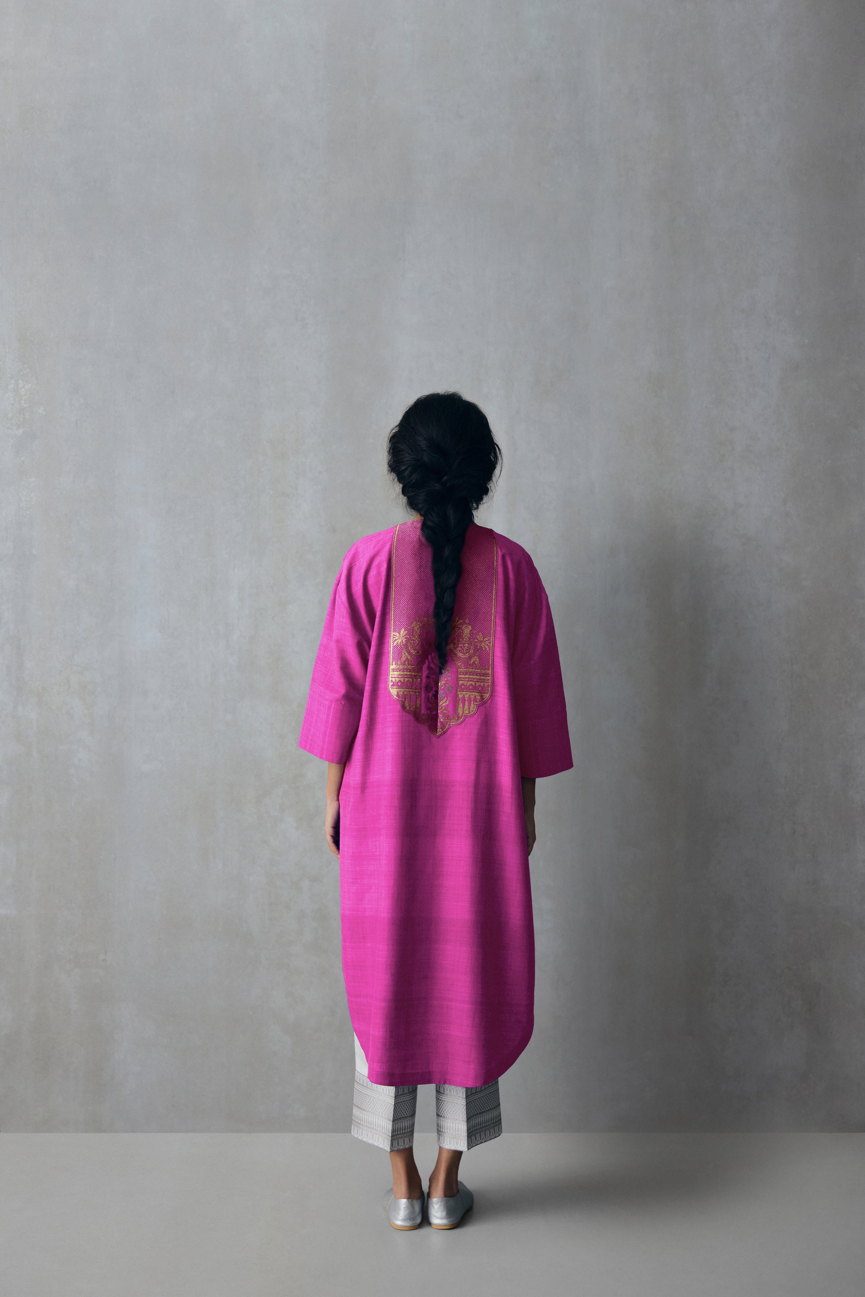 A handwoven silk tunic with an engineered brocade yoke at the front and back. Its high-low hemline lends an effortless twist to this classic silhouette, while the deep pockets offer comfort.