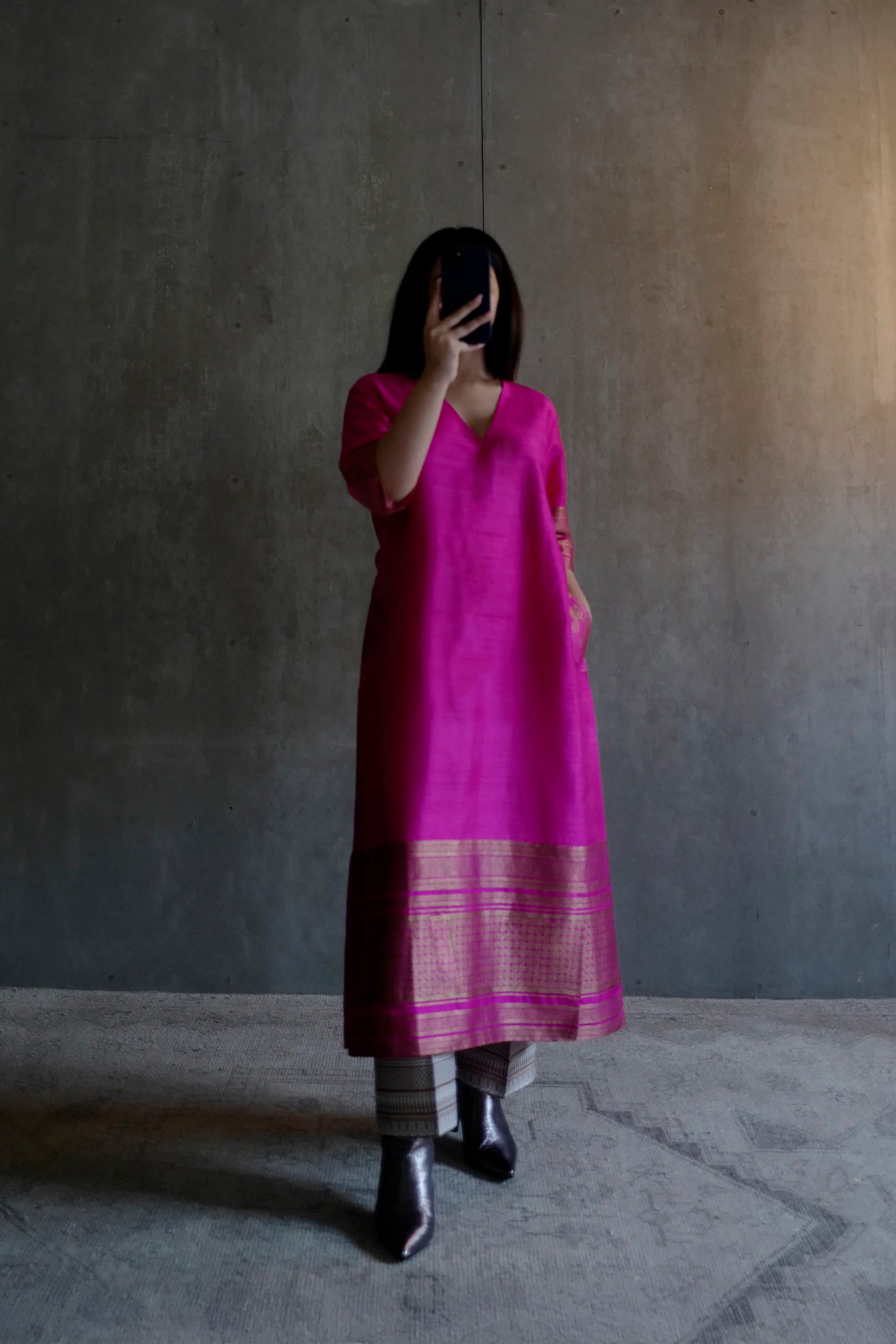 Sizing: The model is 5'4” (163 cms) and is wearing a small size tunic and free size lounge pant. The garment available for purchase is designed for a height of 5’4”.