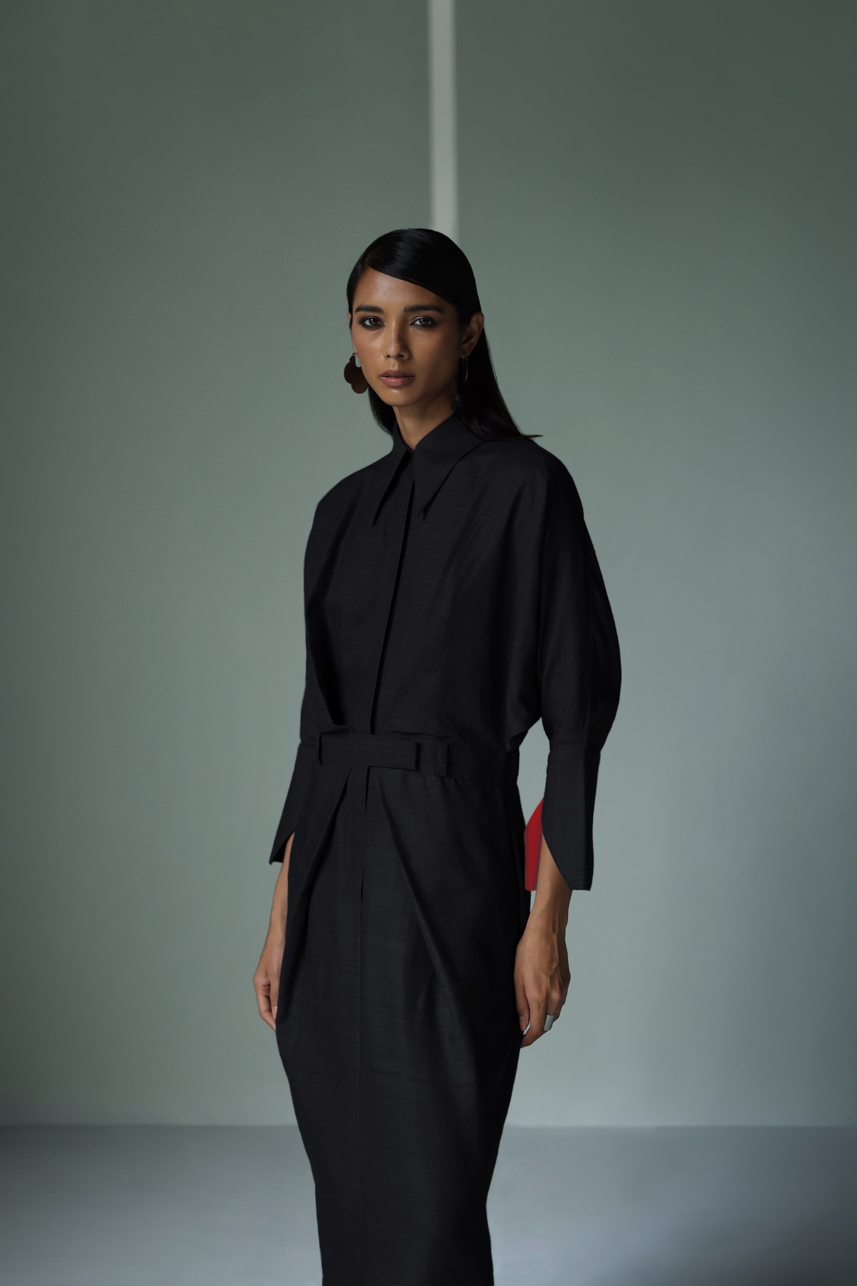 This maxi is woven from matte lightweight silk, featuring an angled pleat detailing that adds a modern edge and a back slit for ease of movement.
