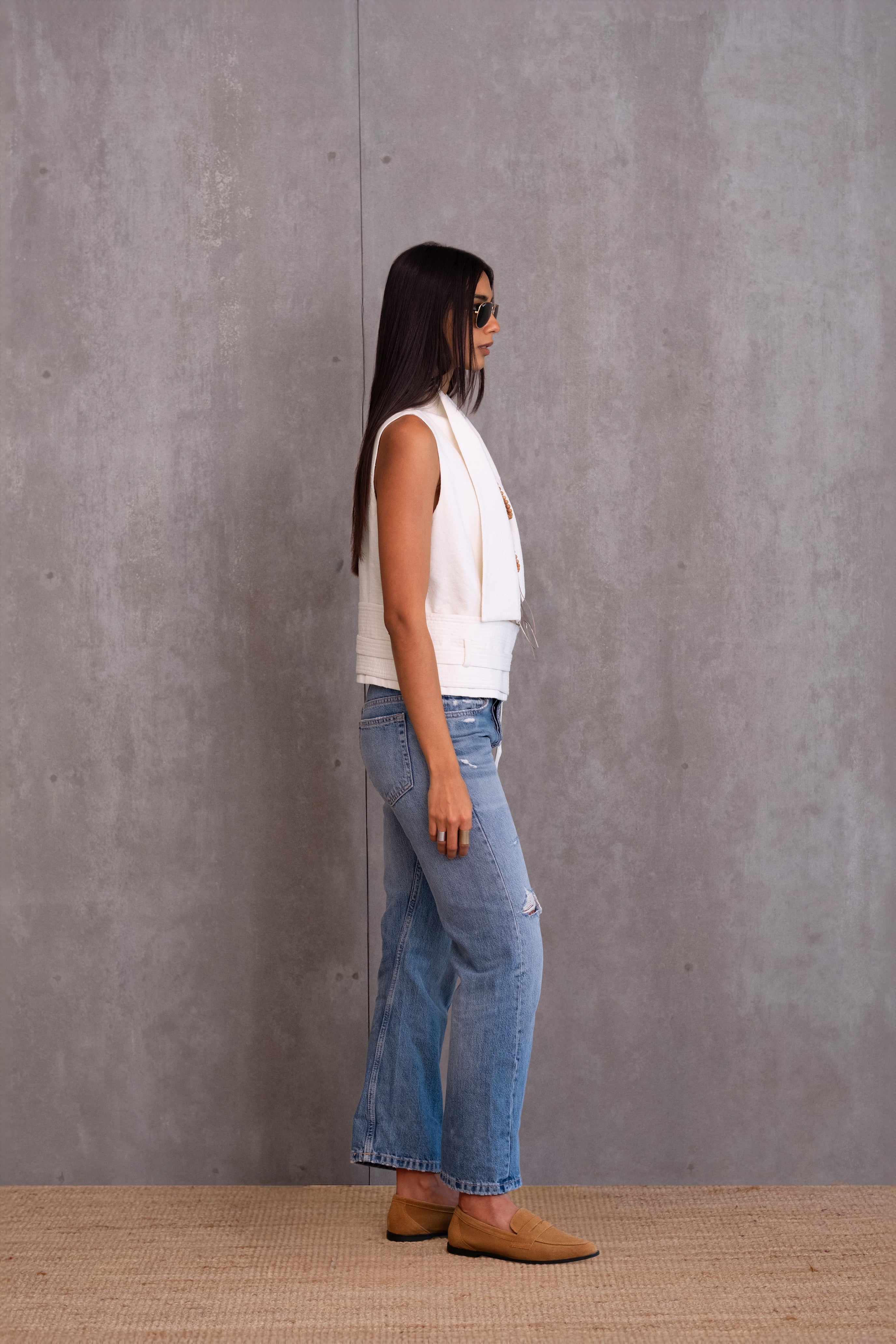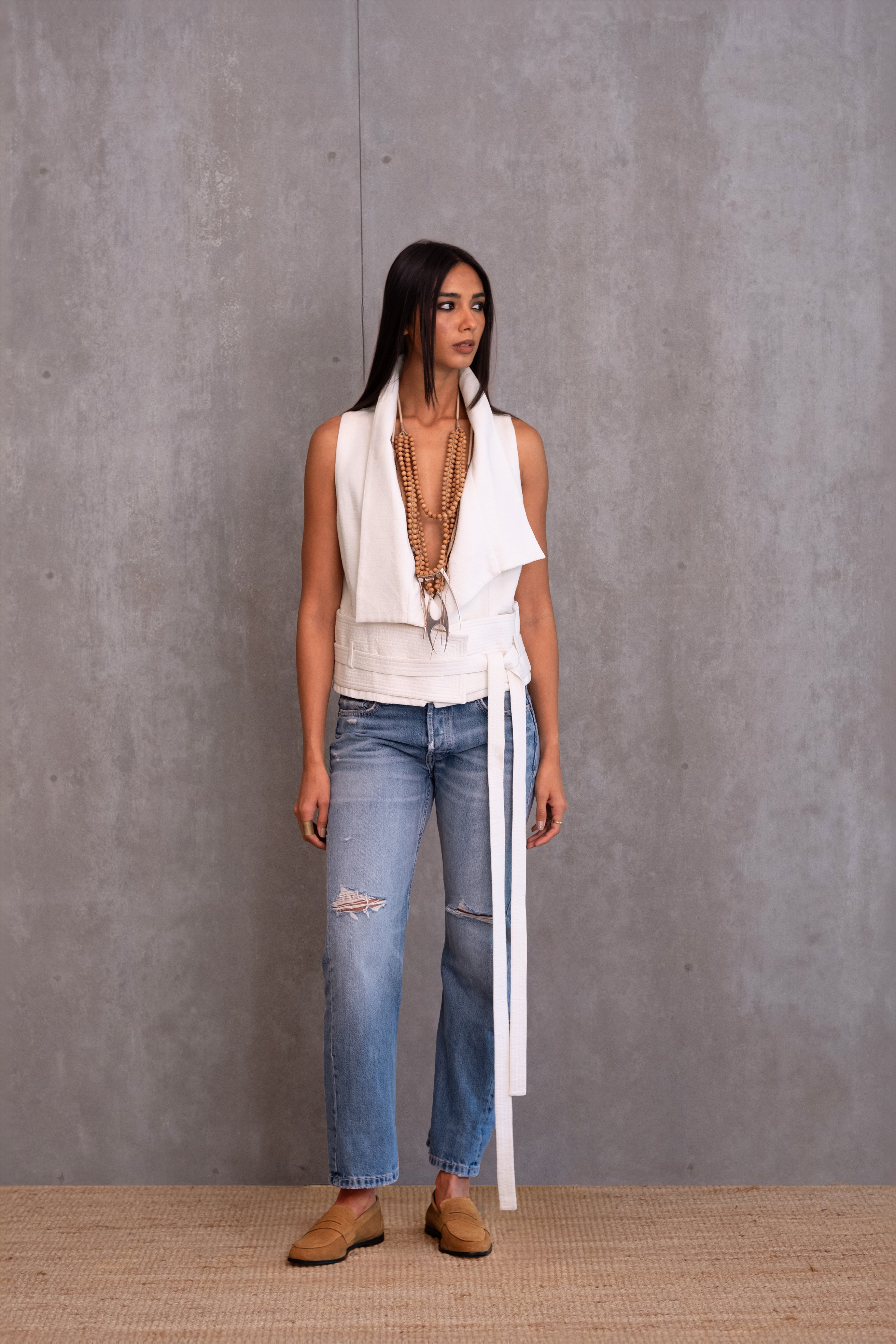 Offering a modern twist on a classic silhouette, this handwoven waistcoat features a structured collar and a Japanese-inspired obi belt, lending it a distinct architectural edge.