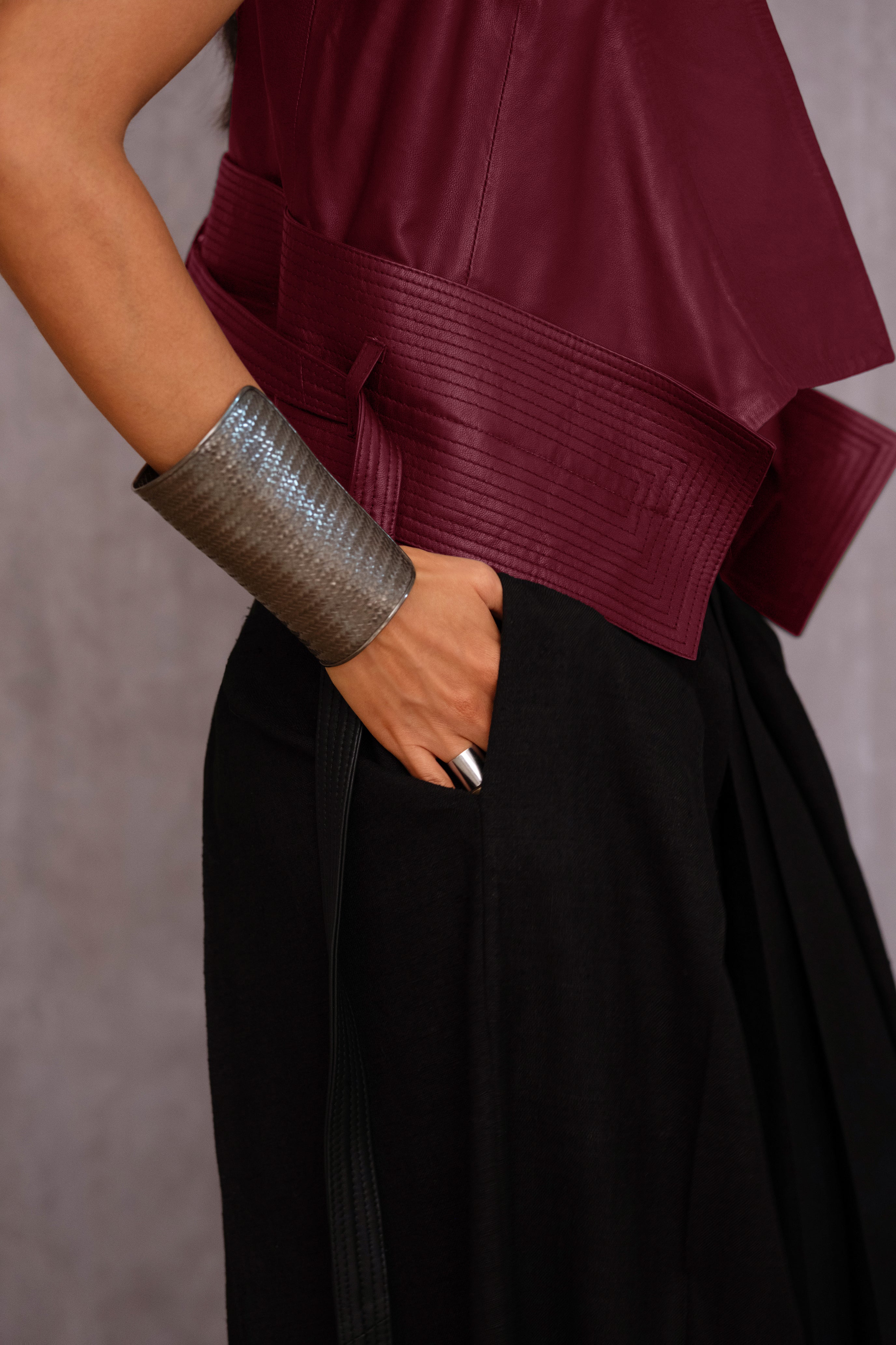 Crafted in the finest Nappa leather, this waistcoat features our signature draped collar and an obi belt, making it a wardrobe classic. Built for layering, it can be worn open or closed for versatile styling.