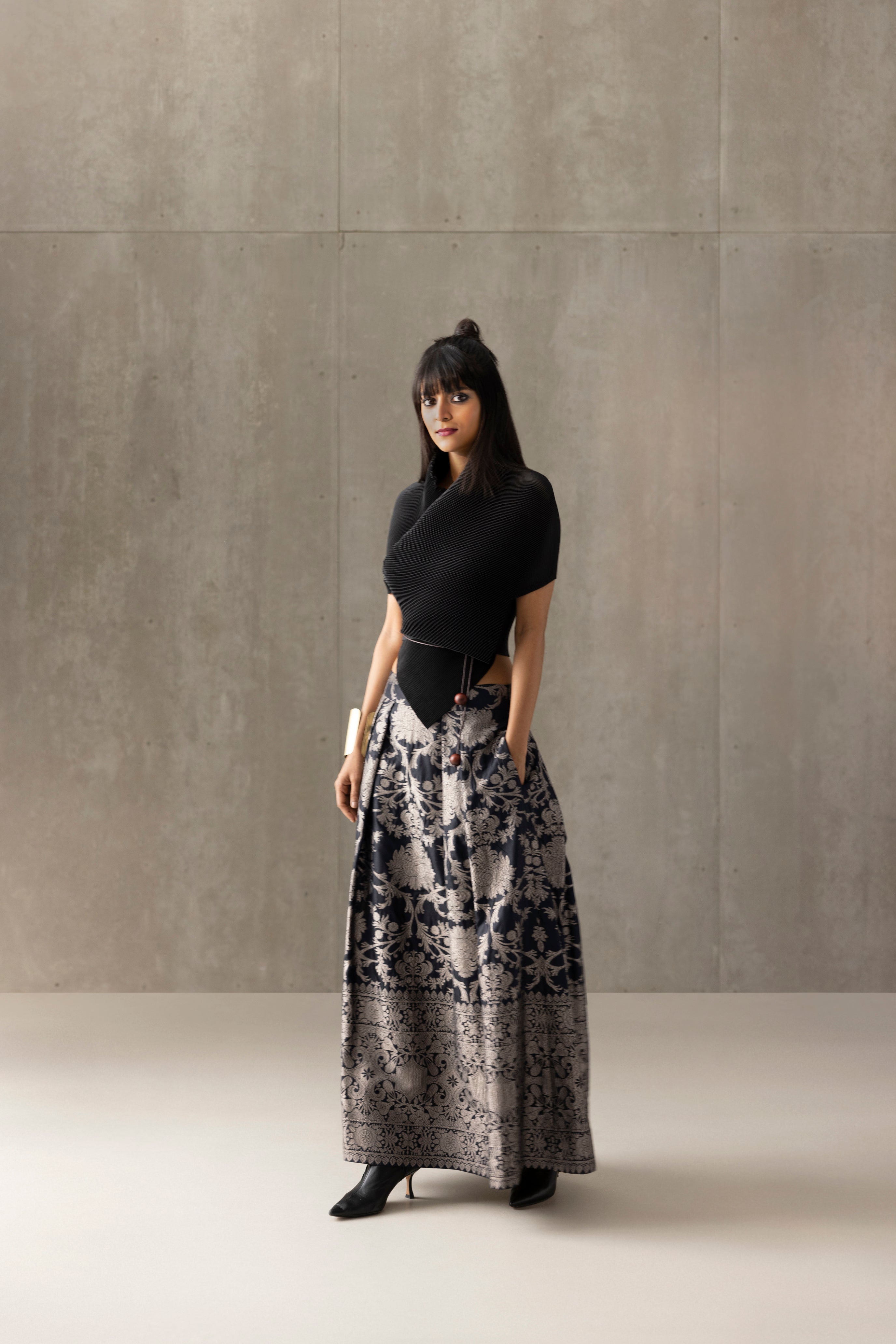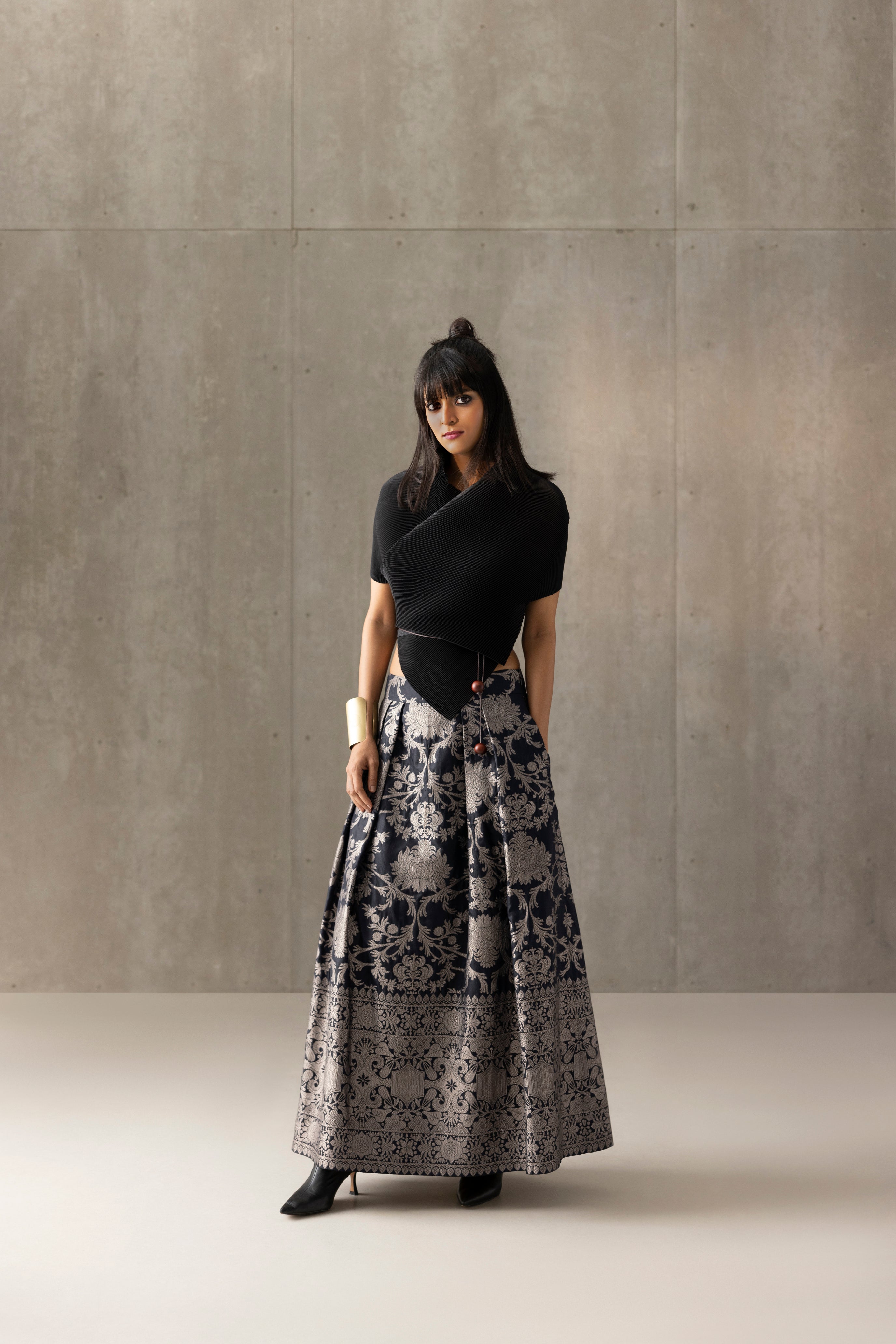 A pleated top designed to be worn in multiple ways, by wrapping, twisting, and tying.