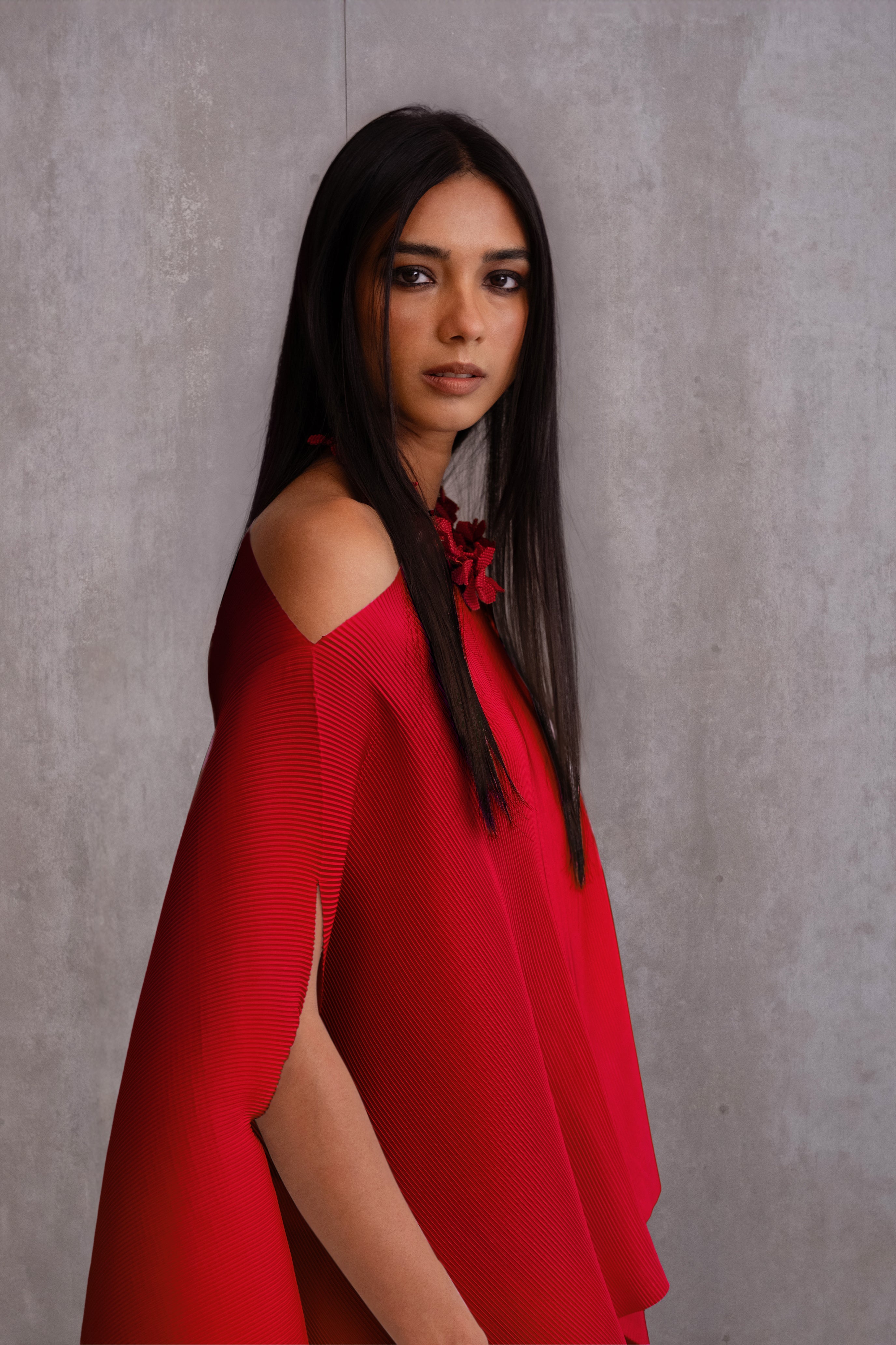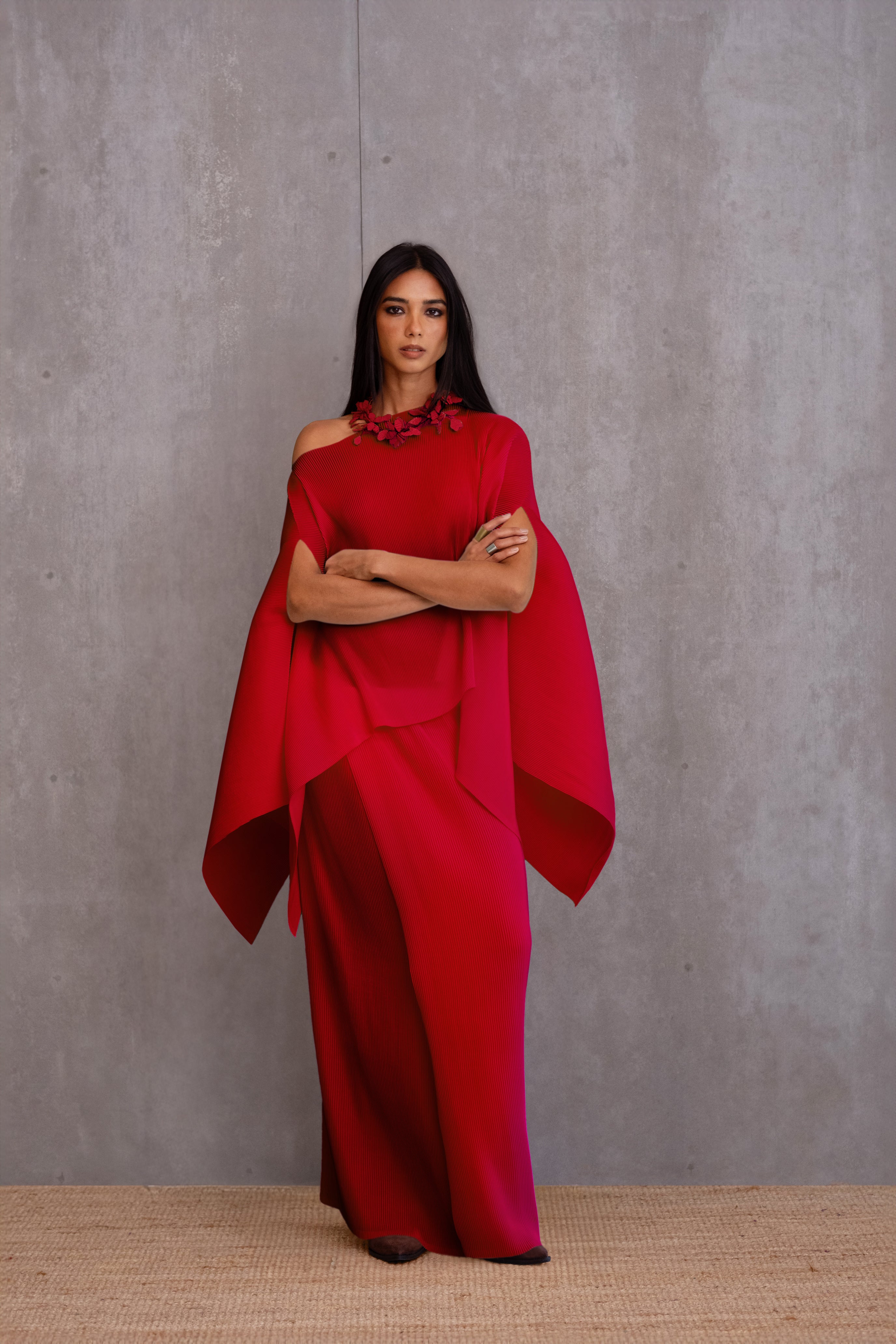 Sizing: The model is 5'10” (178 cms) and wears sample size F. The garment available for purchase is designed for height 5’4” (163 cms).