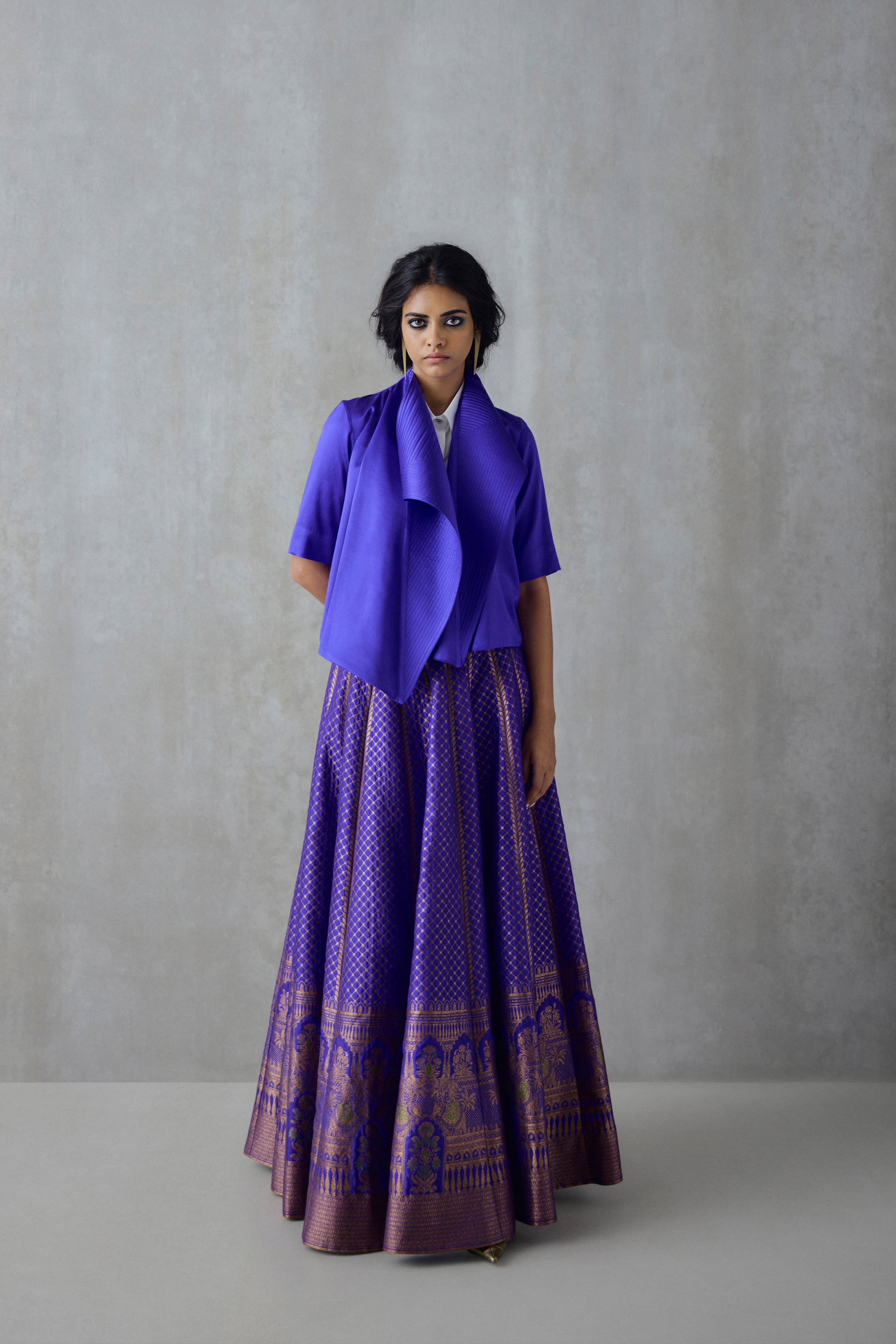 Crafted from handwoven silk, our cropped jacket is designed with a draped lapel, offering an architectural silhouette. It makes for an easy layer for cooler evenings while also adding subtle drama to the look.