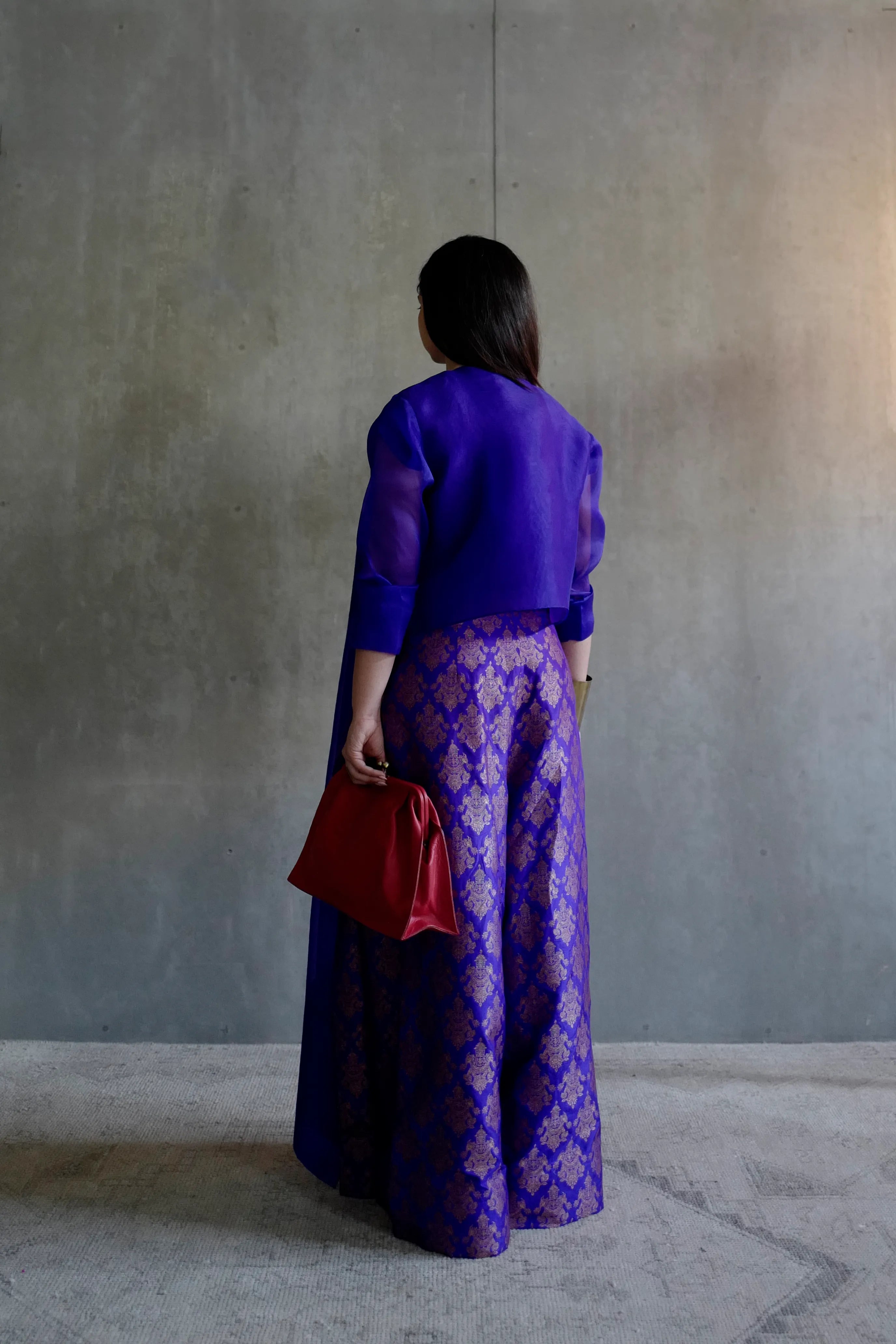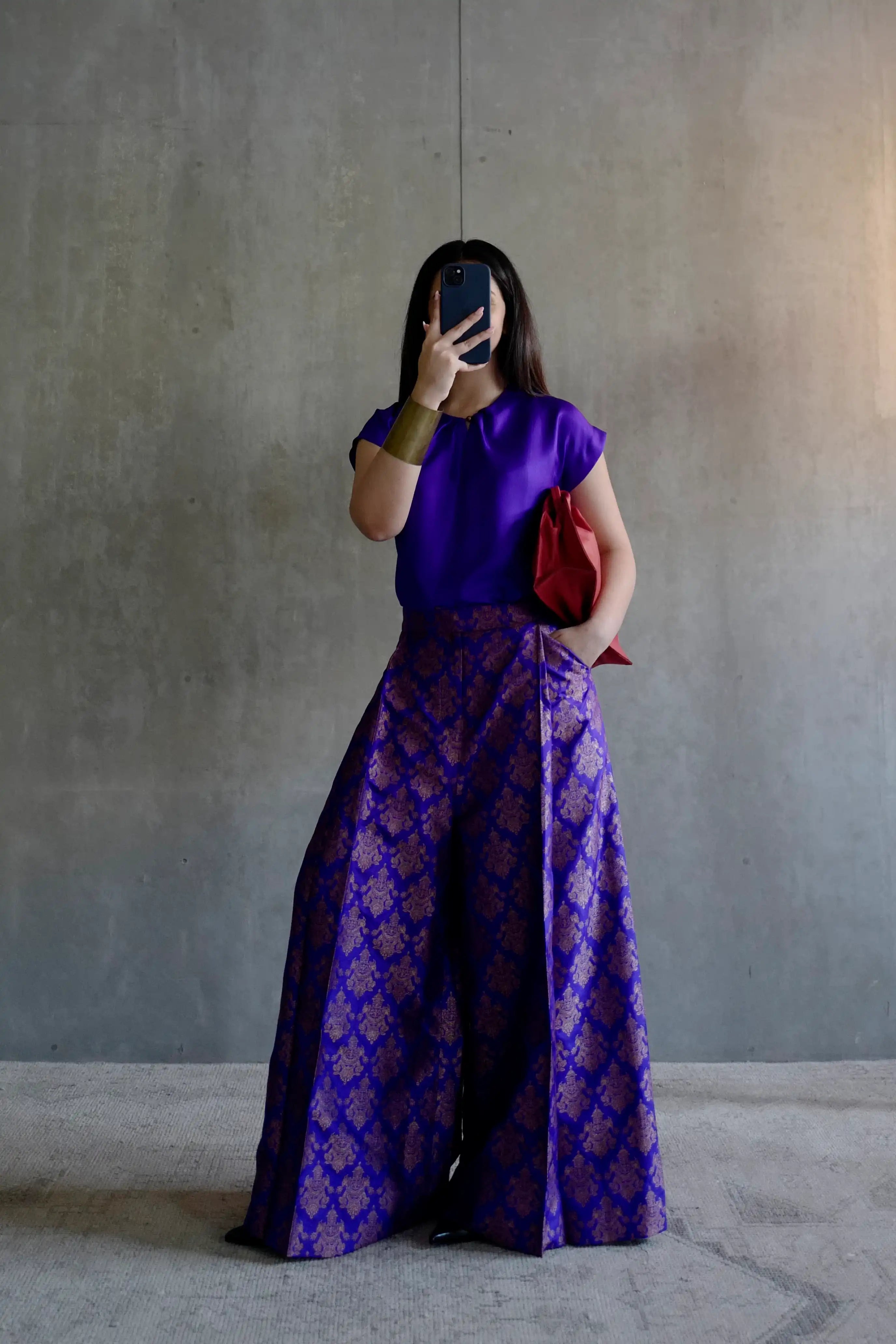 Designed with our signature motifs in silk brocade, this handwoven palazzo combines the comfort of trousers with the finesse of a lehenga, completed with pockets for utility.