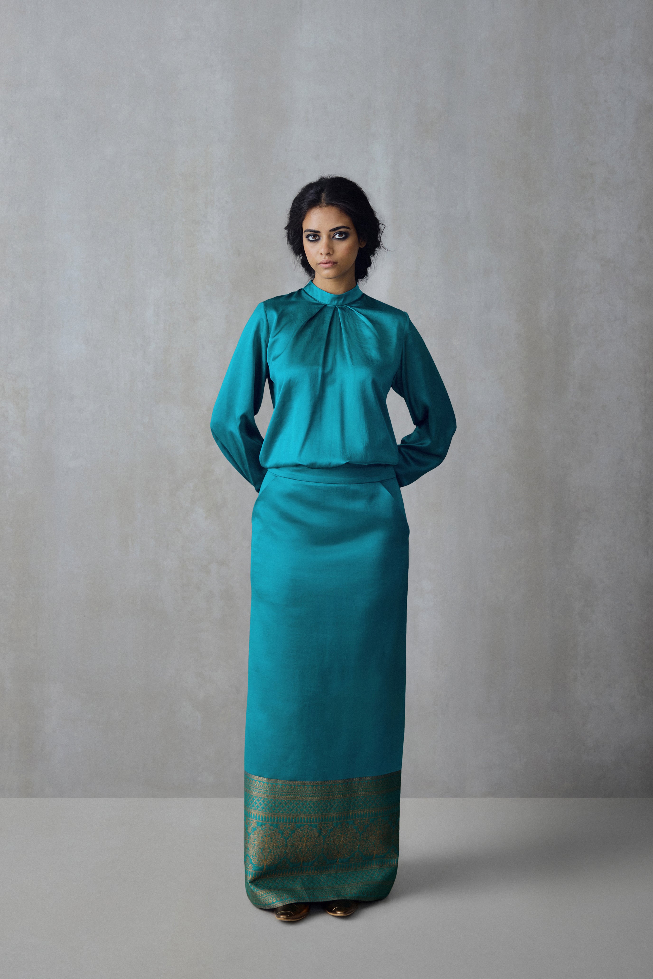 A slim line skirt, handwoven in silk satin, featuring brocade details at the hem. It is finished with a contrast lining, pockets for comfort and a slit at the center back for ease of movement.