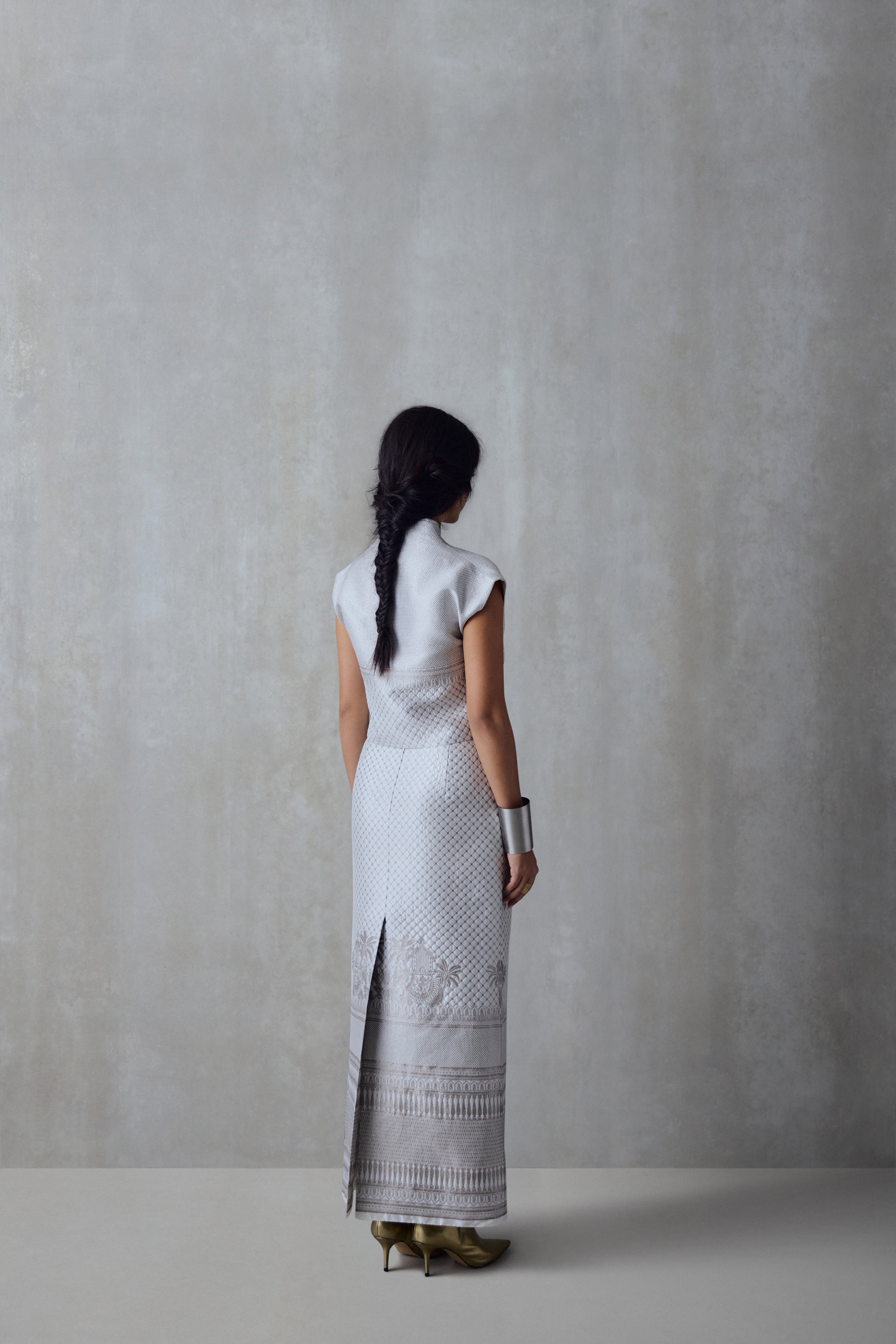 This slim line skirt, handwoven in silk brocade, features our signature motifs, pockets for functionality and a slit at the center back to ensure ease of movement.