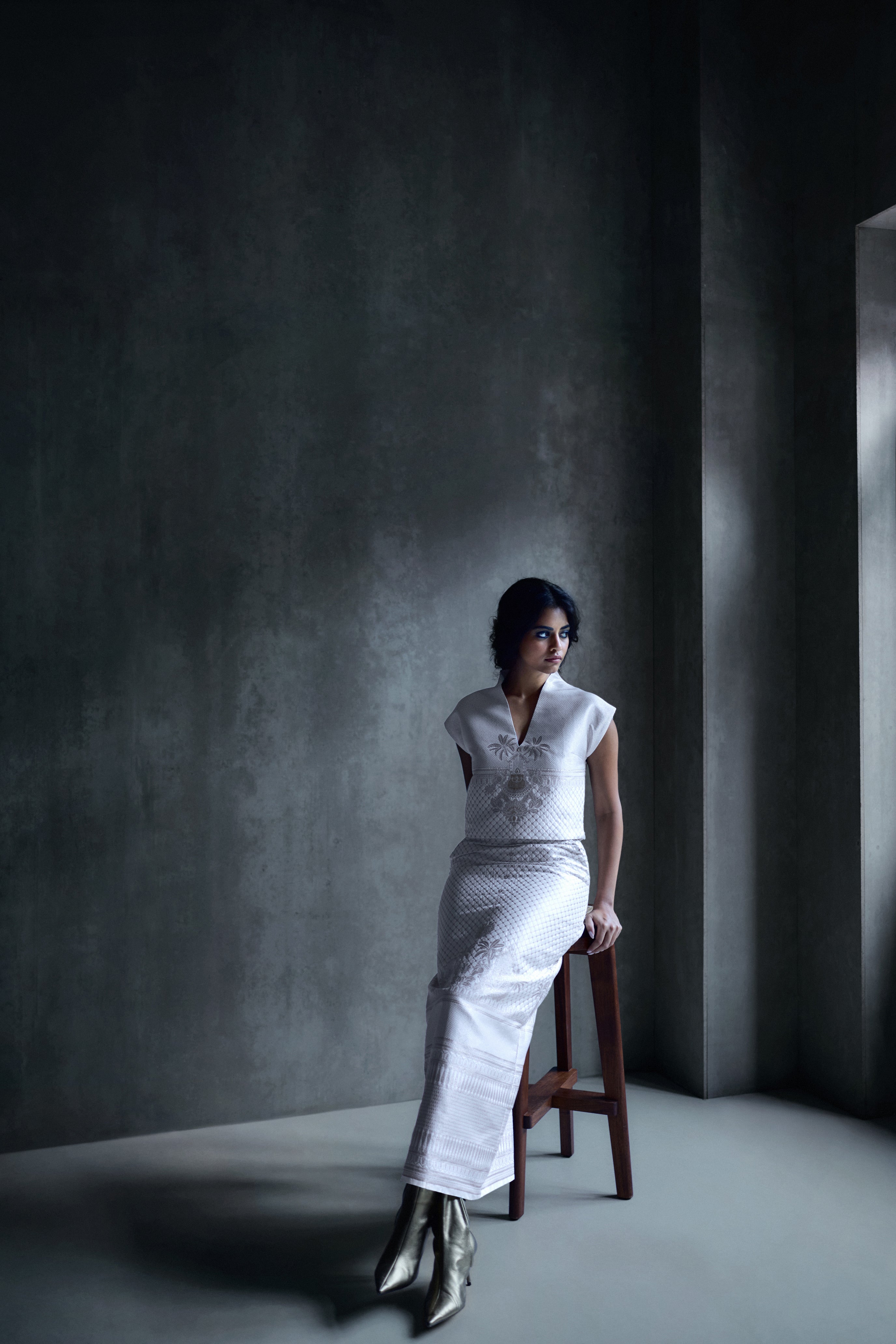 Model: The model is 5'8" (173 cms) and is wearing a small size skirt. The garment available for purchase is designed for a height of 5’4”.