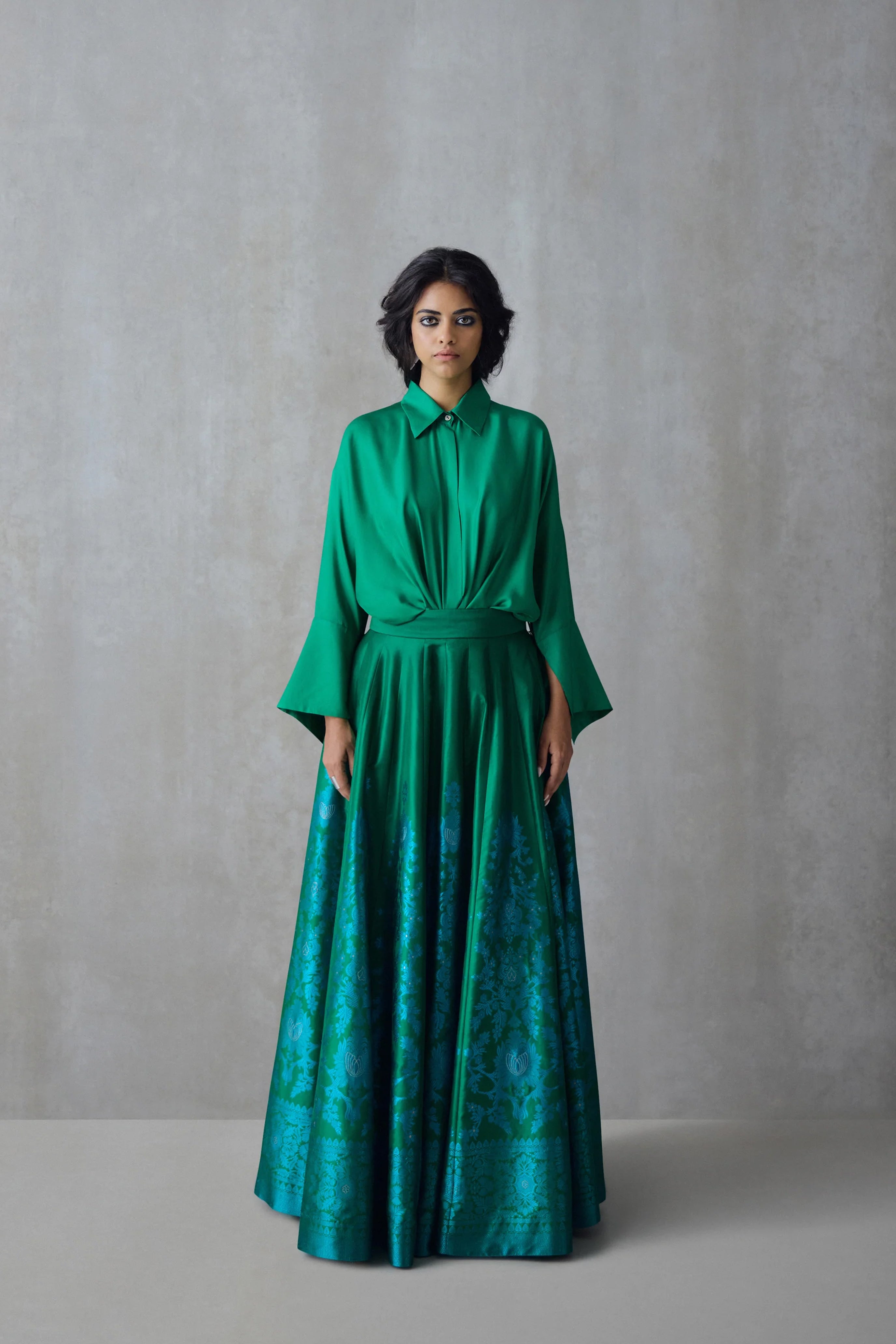 Handwoven in silk, this skirt is crafted with engineered brocade panels featuring our signature motifs, woven in coloured silk threads. Its lightweight construction and deep pockets ensure all-day comfort, making it ideal for wedding celebrations. It is finished with a contrast lining.