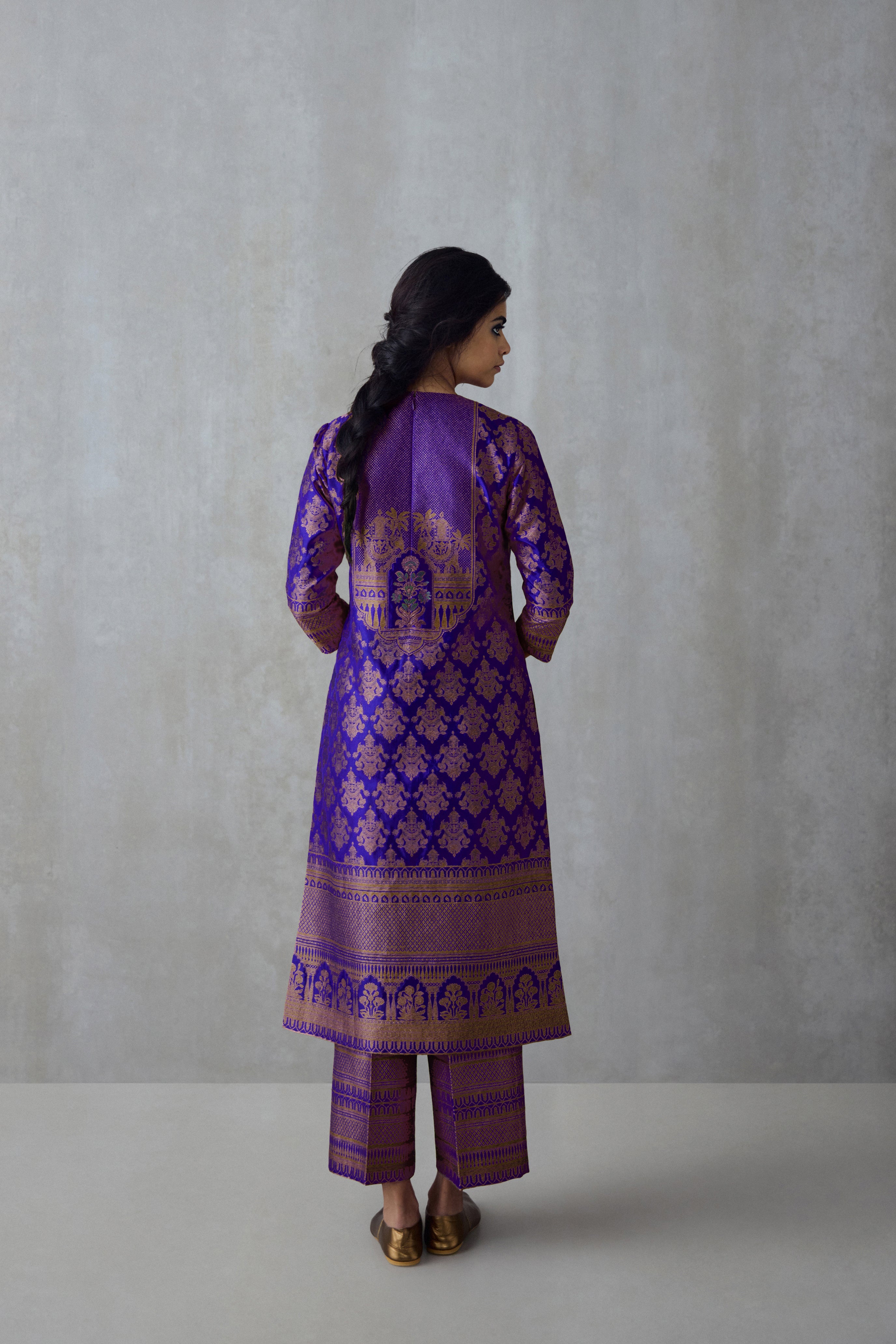 This ensemble pairs a handwoven silk brocade tunic with a complementing lounge pant. The tunic features a sleek silhouette, side slits and a contrast lining, while the pant is finished with deep pockets and brocade details at the hem.