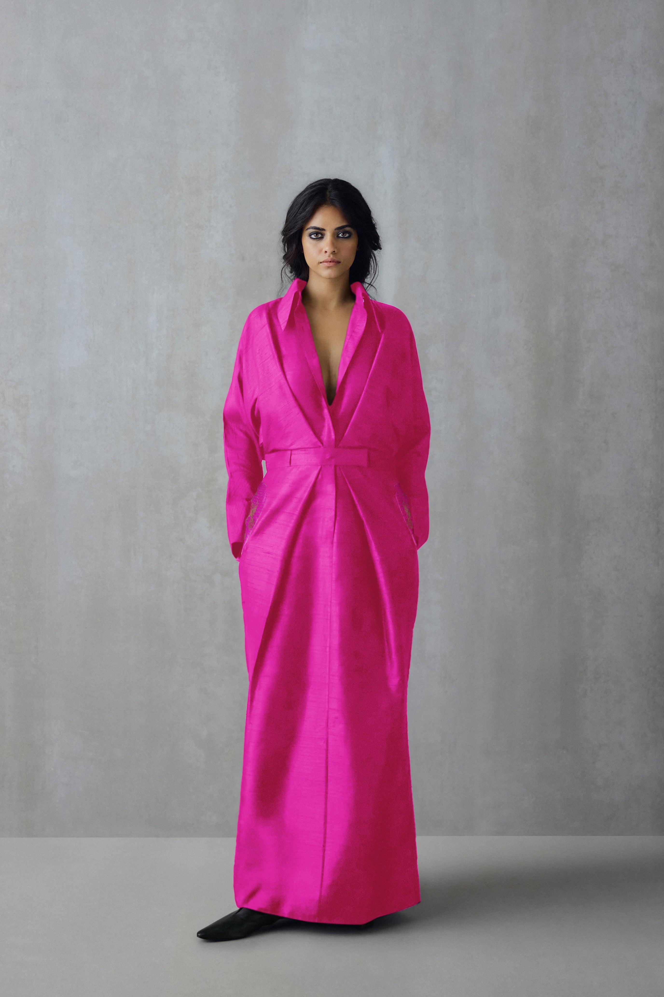 Crafted in silk, this maxi dress features angled pleats that add a modern edge to the silhouette. The brocade details at the pockets offer subtle visual interest, elevating an otherwise muted garment. It is finished with a classic shirt collar and a back slit for ease of movement.