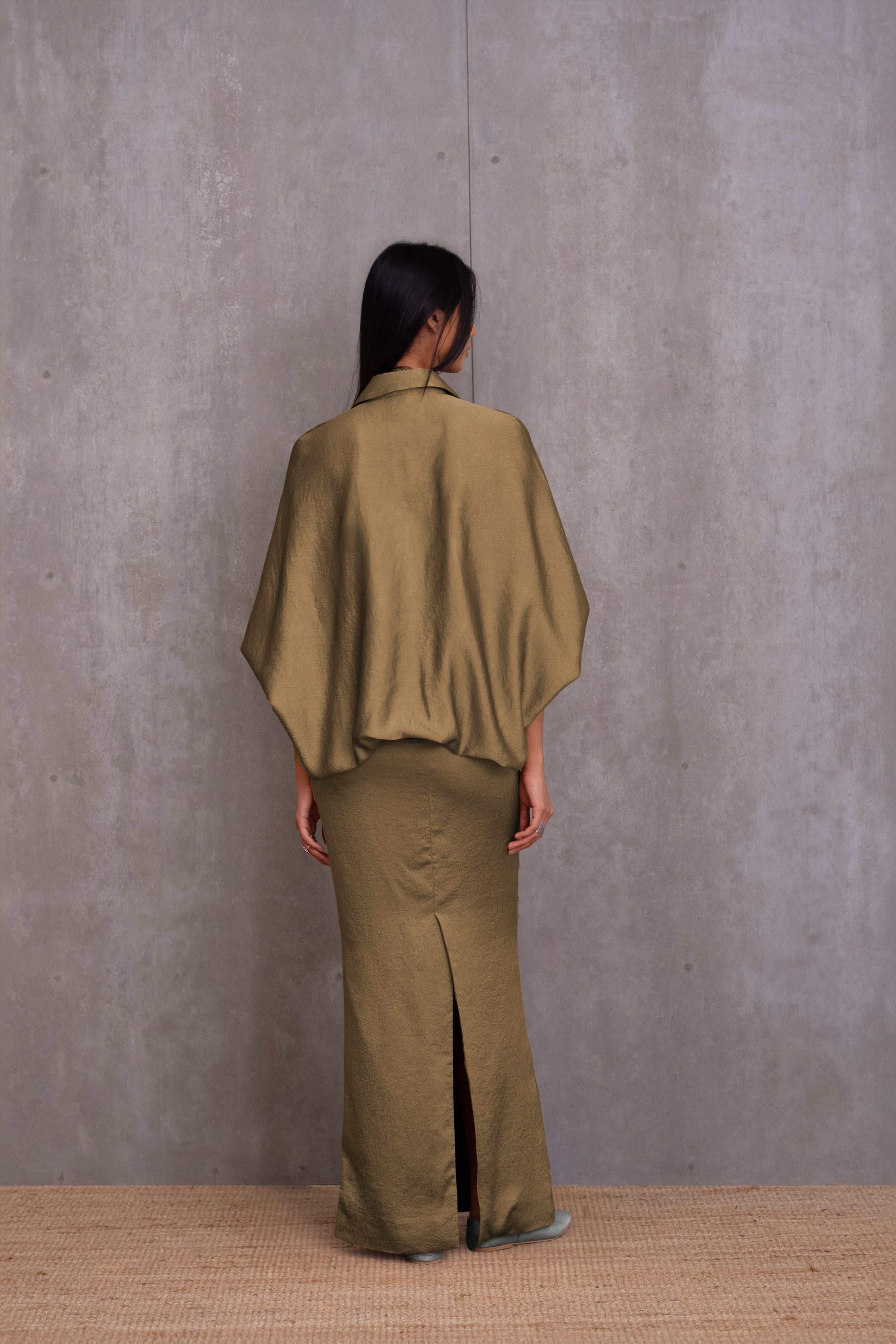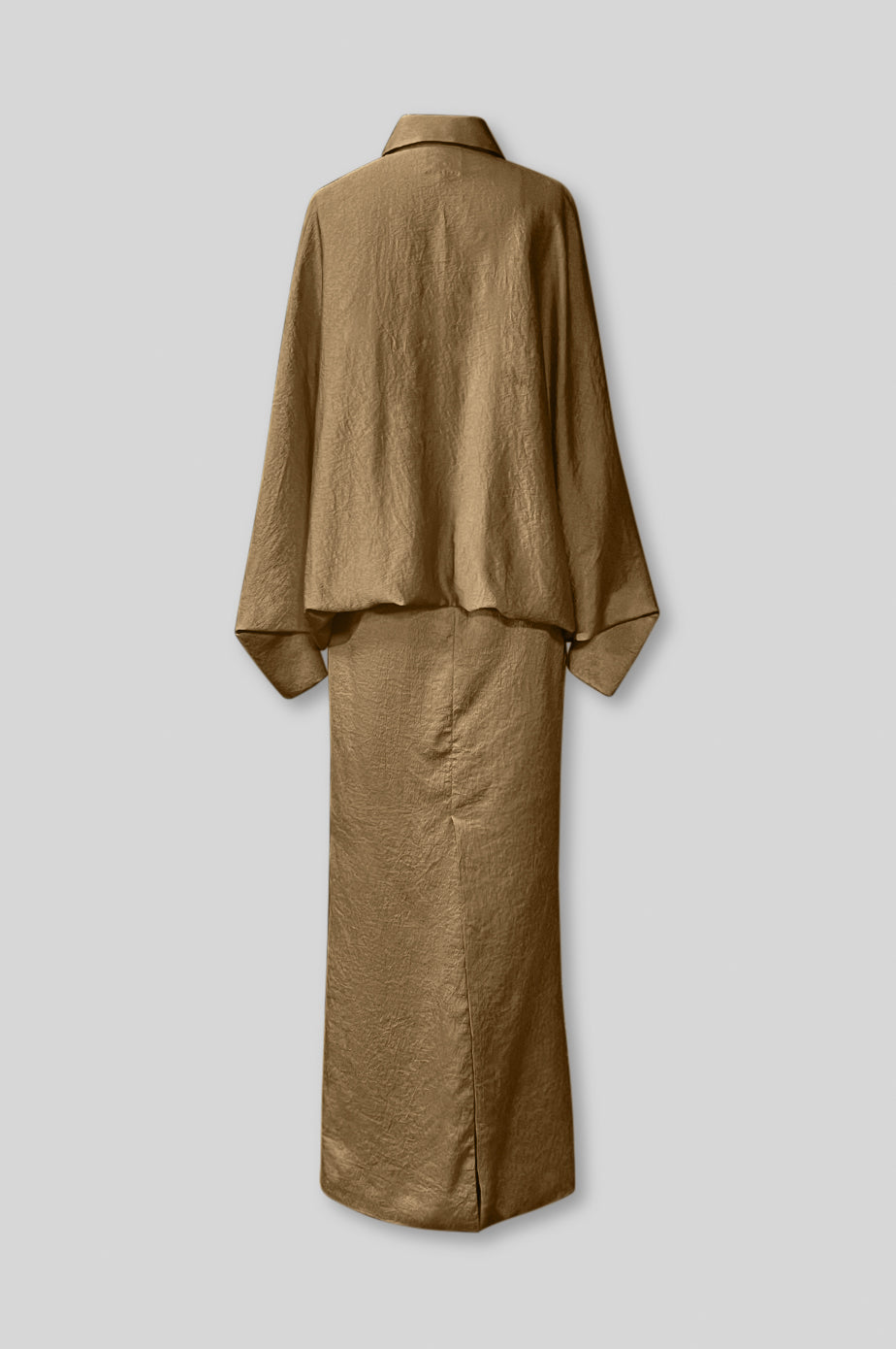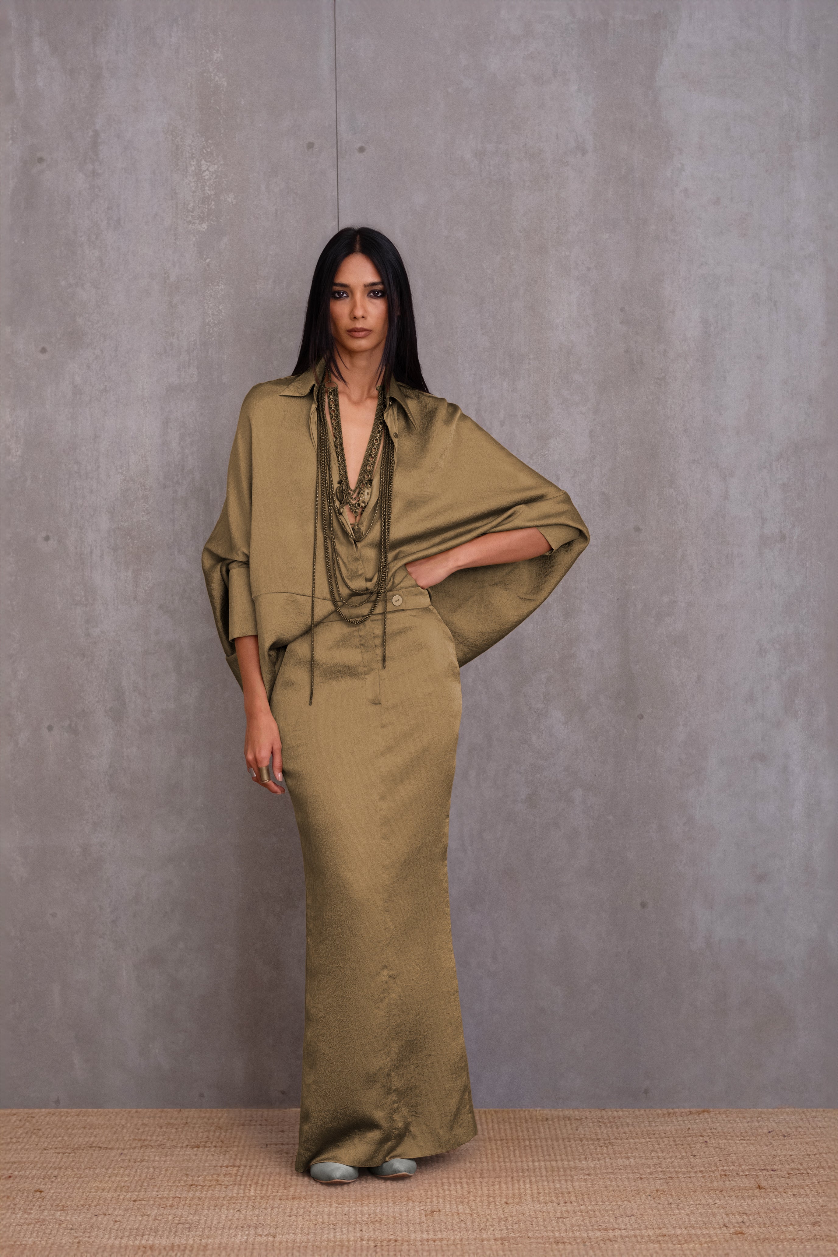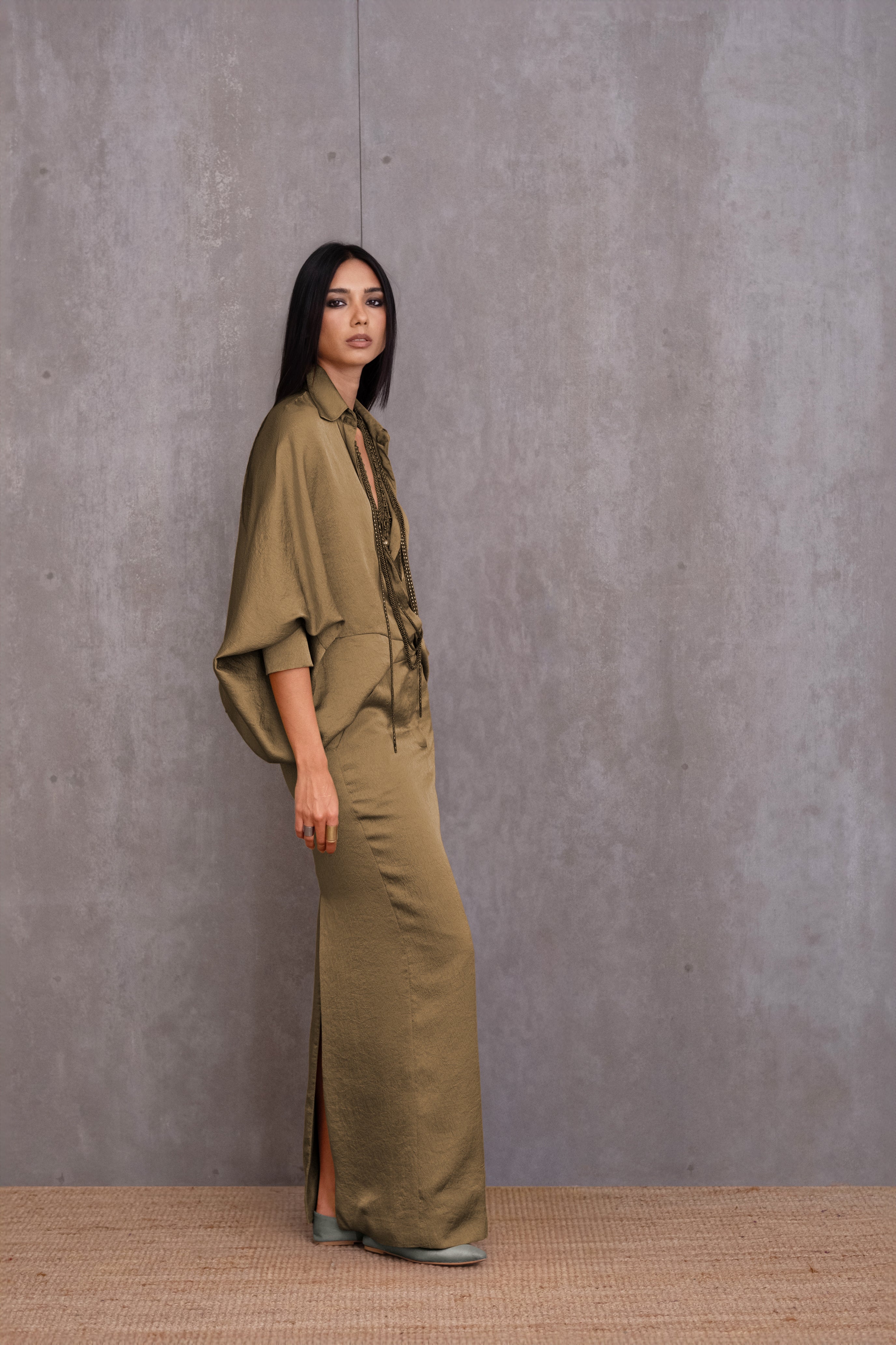 Designed with a zero-waste approach, this dress combines two square pieces of fabric, folded like origami to create a sculptural silhouette that mimics the form of a shirt and skirt. Its considered construction lends both shape and ease of movement, and it is finished with a centre-back slit, functional pockets and a concealed buttoned placket.