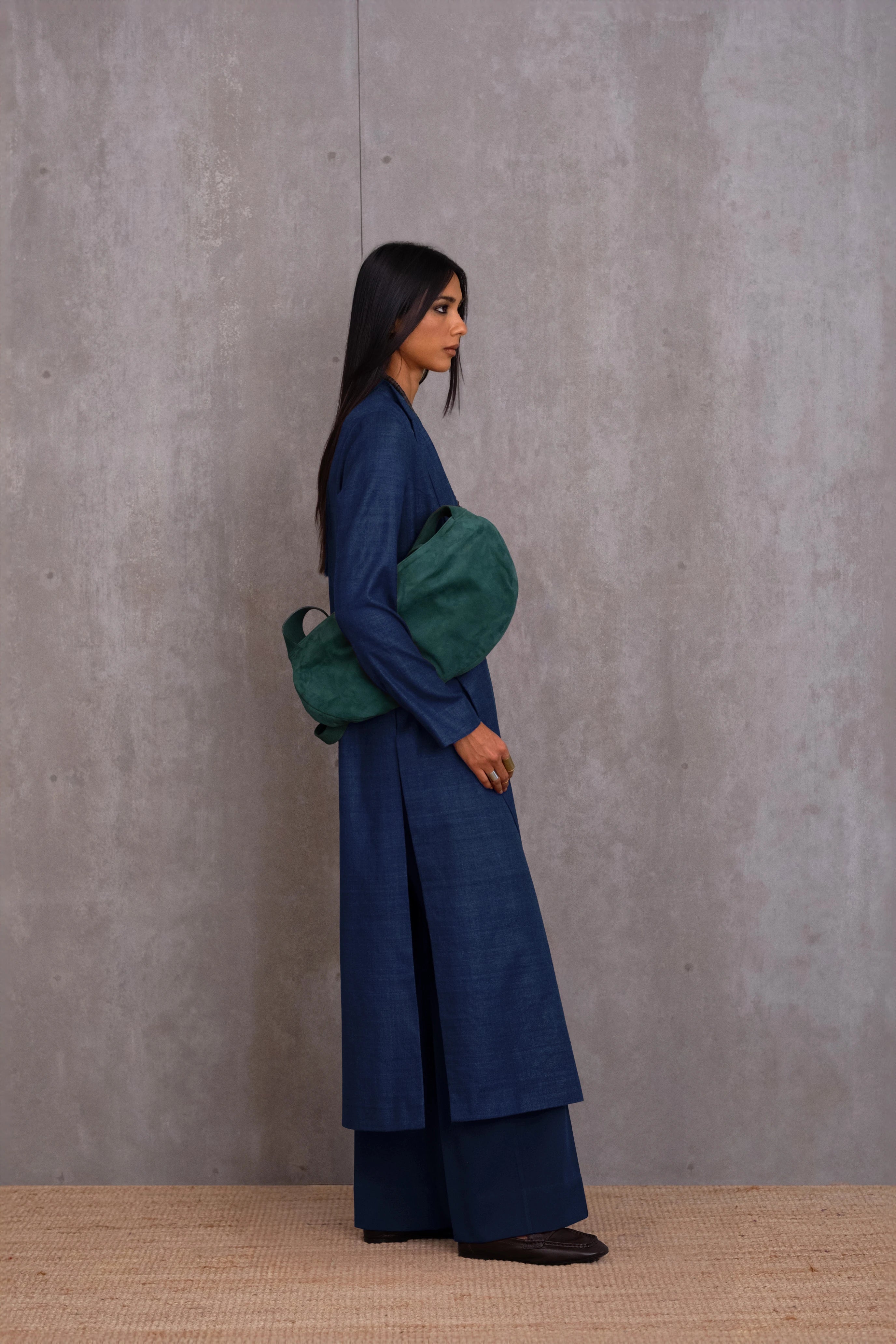 A handwoven silk jacket featuring a mandarin collar and deep side slits.