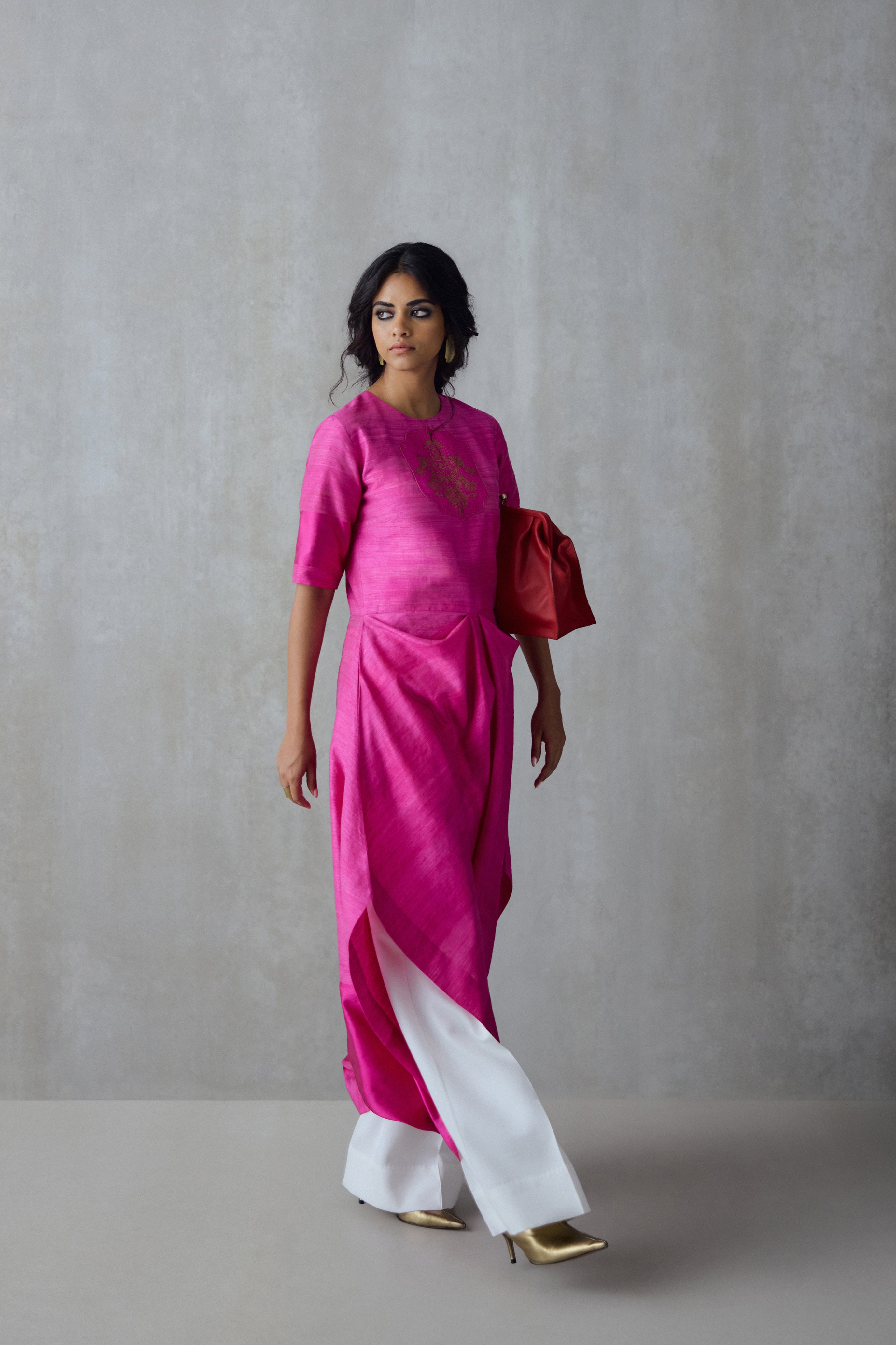 This jumpsuit balances structure with fluidity in a contemporary silhouette. The draped detail enhances ease of movement, while the pockets add comfort. Handwoven to create subtle shifts in texture, it is finished with brocade details at the yoke and a concealed zipper at the back.