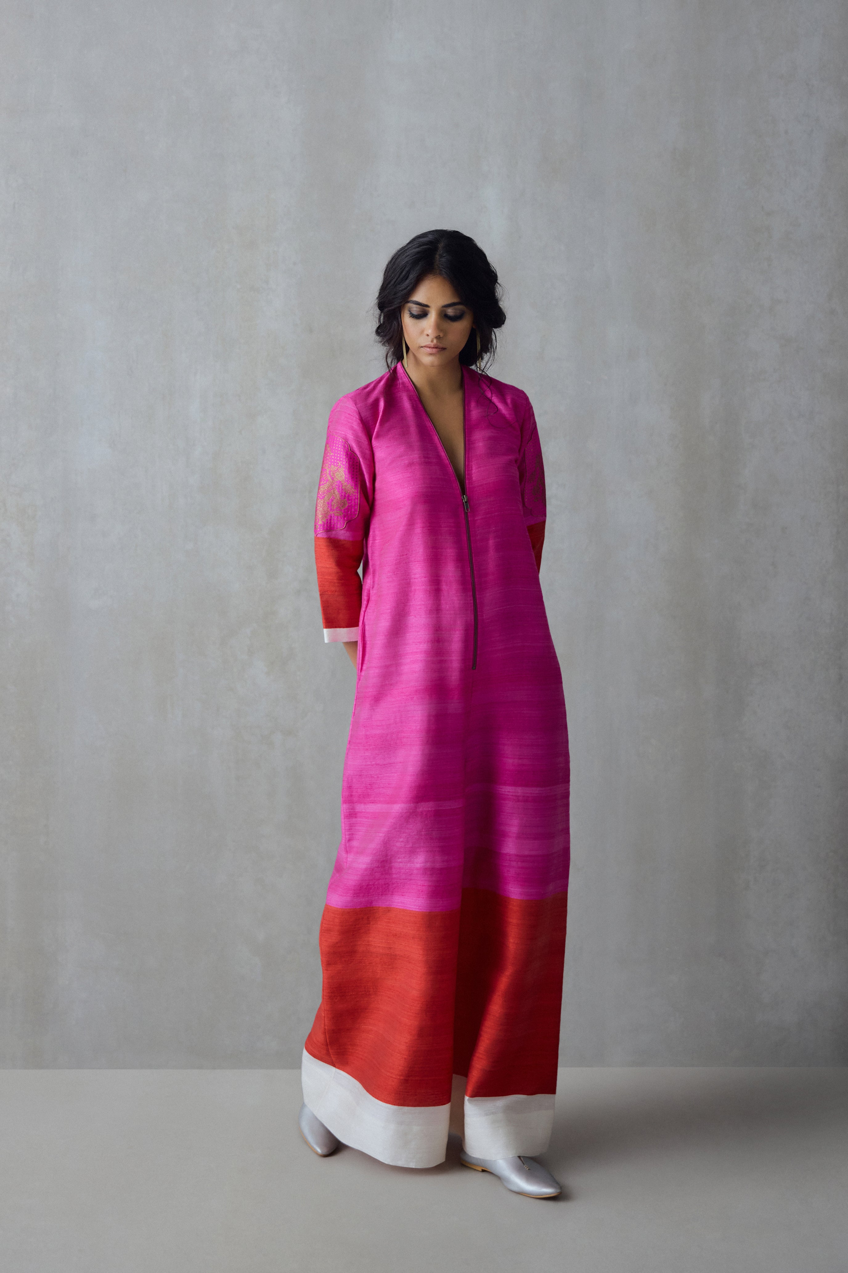Handwoven in silk, this wide-legged jumpsuit balances structure with comfort, featuring functional pockets. With our signature colour-blocking, this garment is accentuated with a subtle brocade detail on the sleeves and an exposed zipper at the neckline.