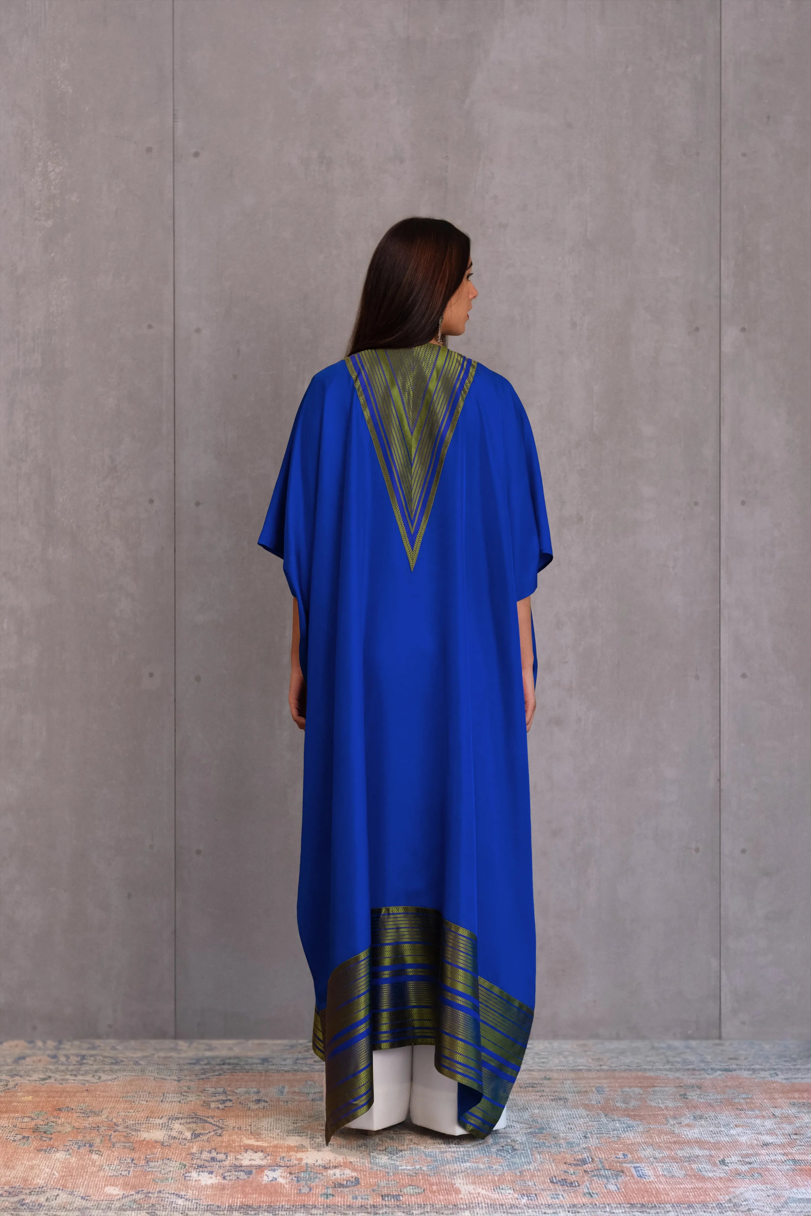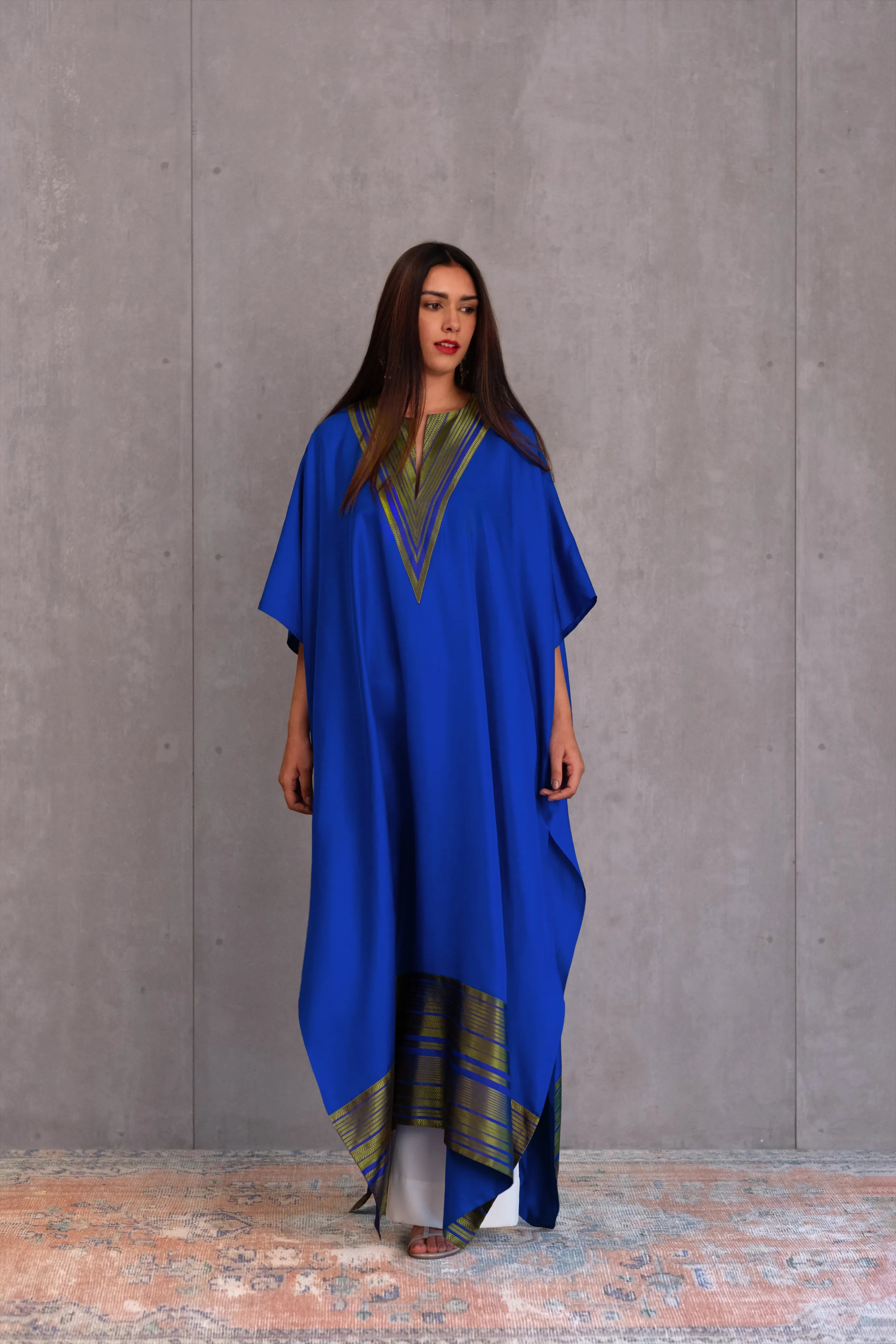 An effortless jewel-toned kaftan, crafted in lightweight silk, featuring brocade details at the yoke and hem and deep side slits.