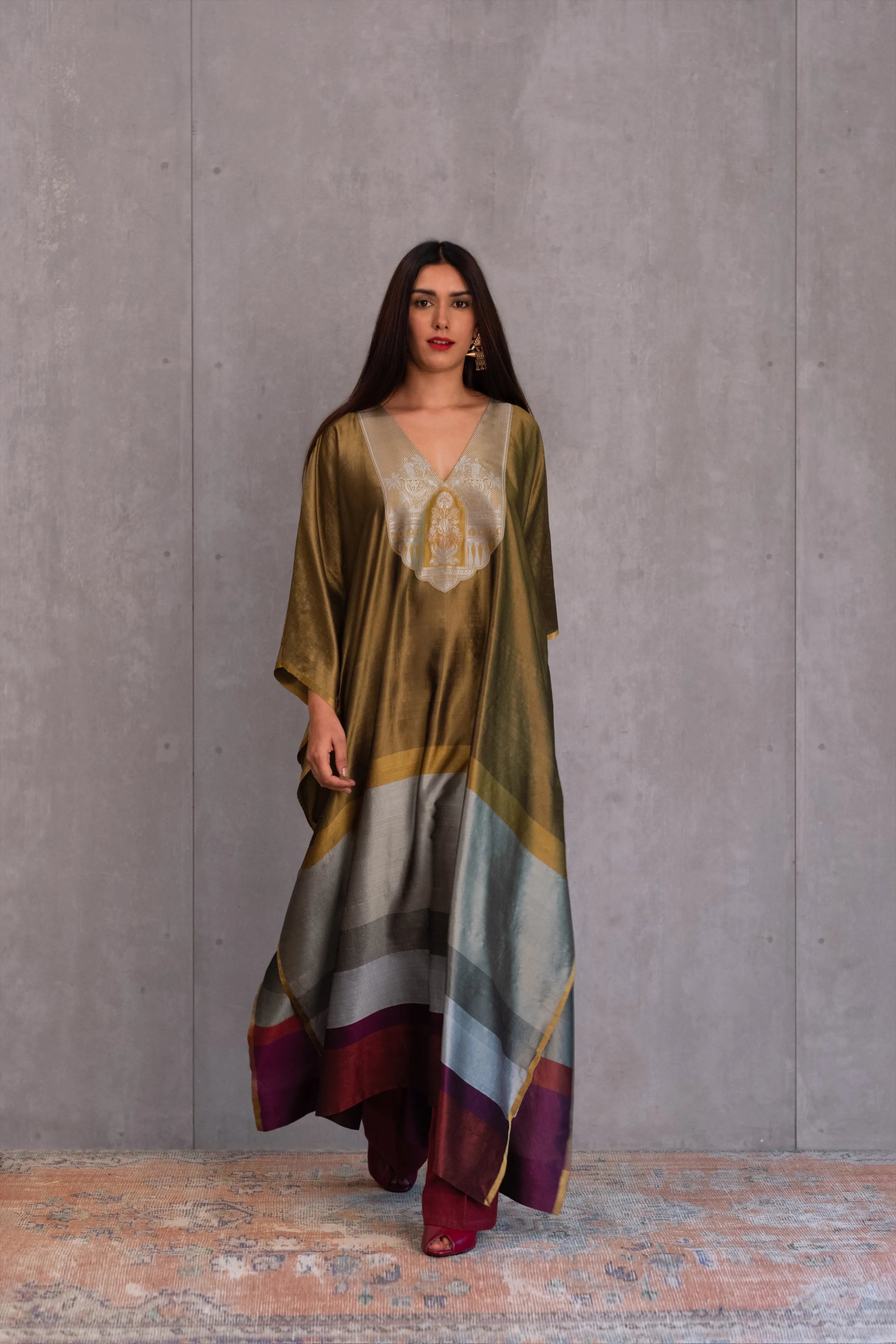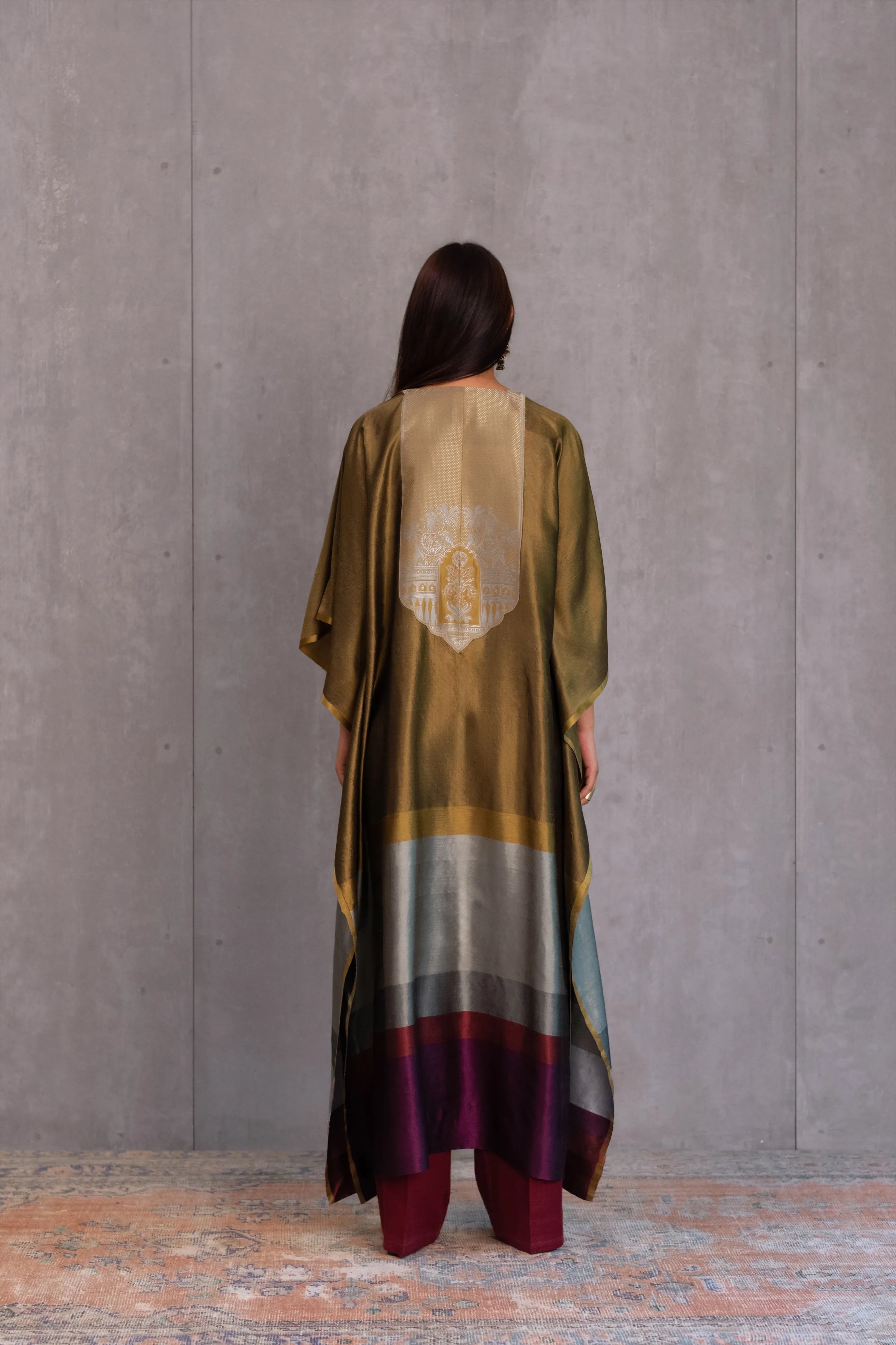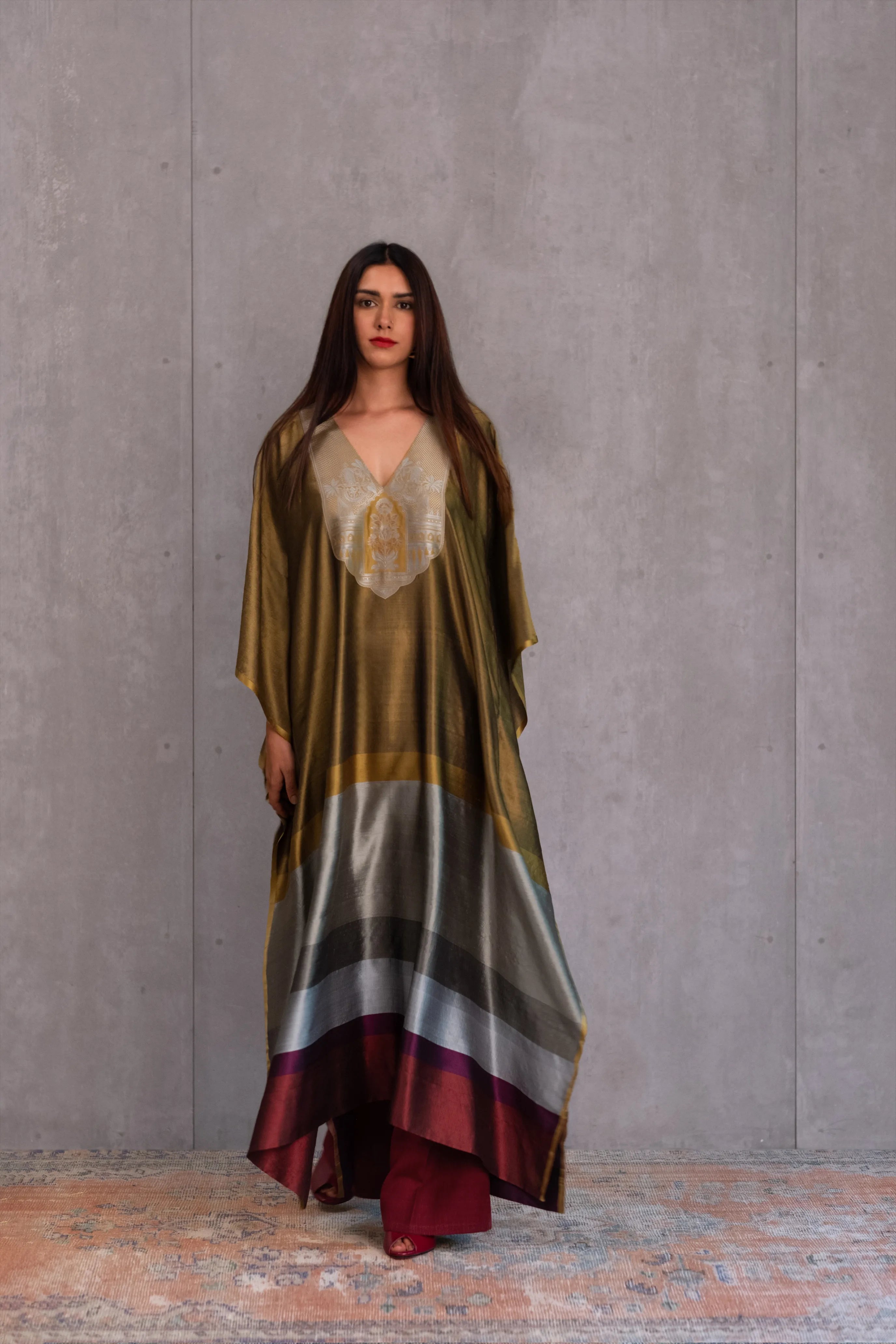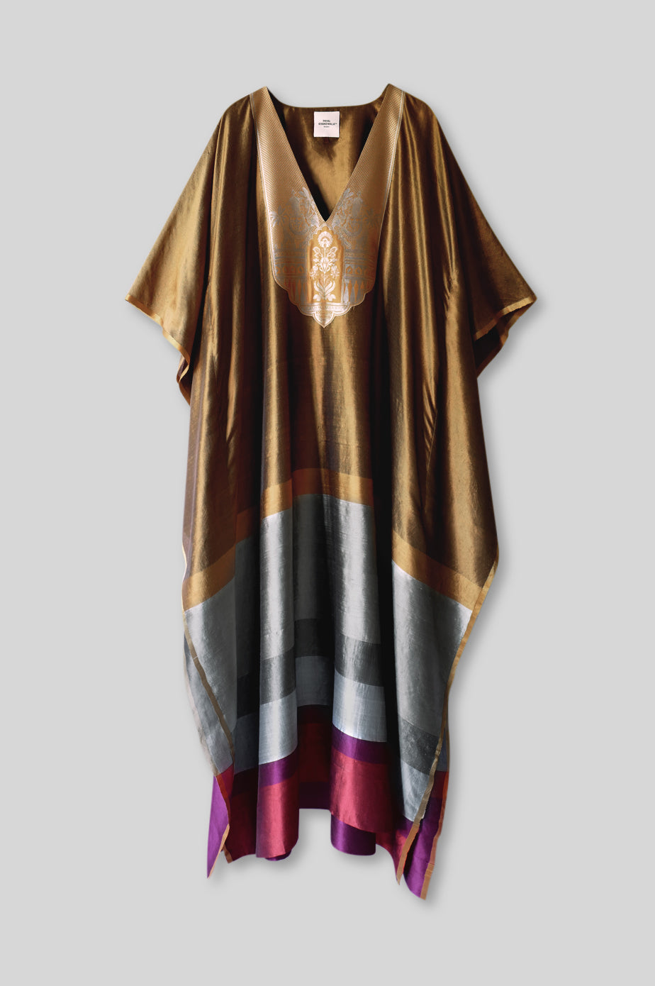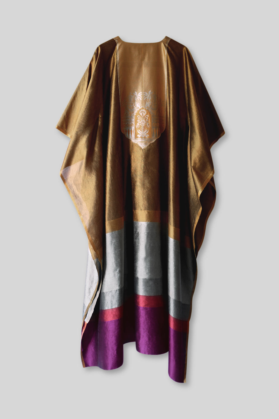 Our signature colour-blocked kaftan, featuring brocade details at the neckline and deep side slits. It is handwoven in silk to create shifts in texture and sheen.