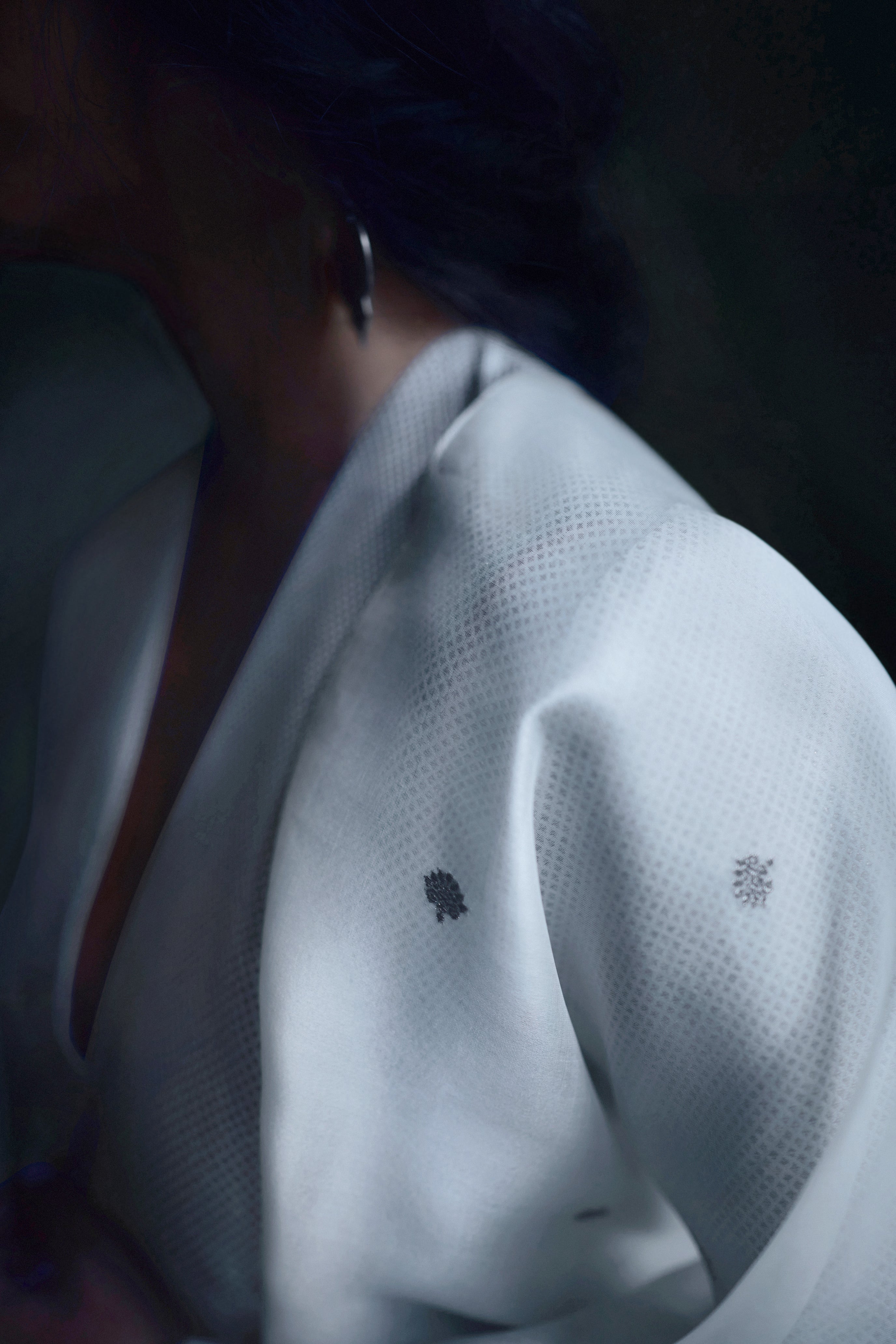 Lightweight and versatile, this kimono-style jacket allows for easy layering. It is handwoven in silk organza and features engineered brocade details.
