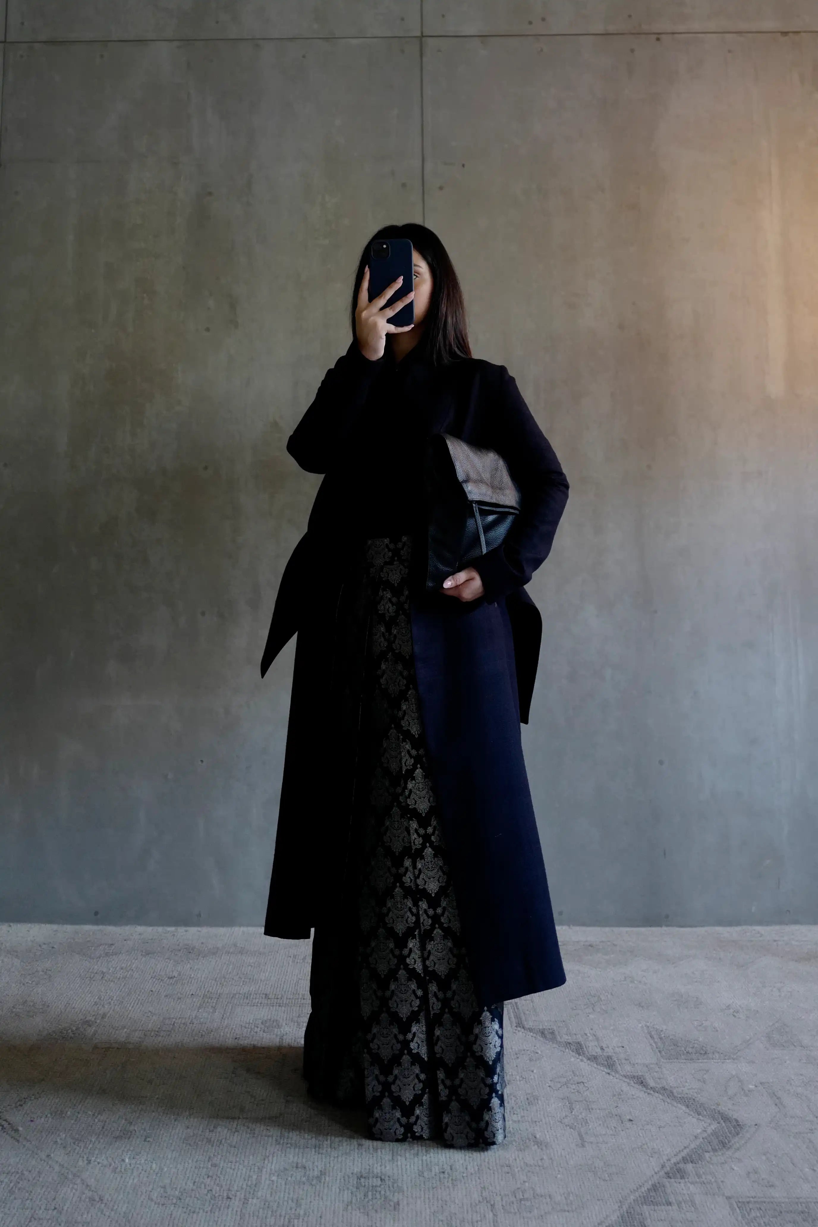 Handwoven in silk, our longline trench makes for a versatile layering piece and offers a clean and tailored finish. It features an architectural collar, an obi belt and deep pockets, and is finished with a slit at the centre back.