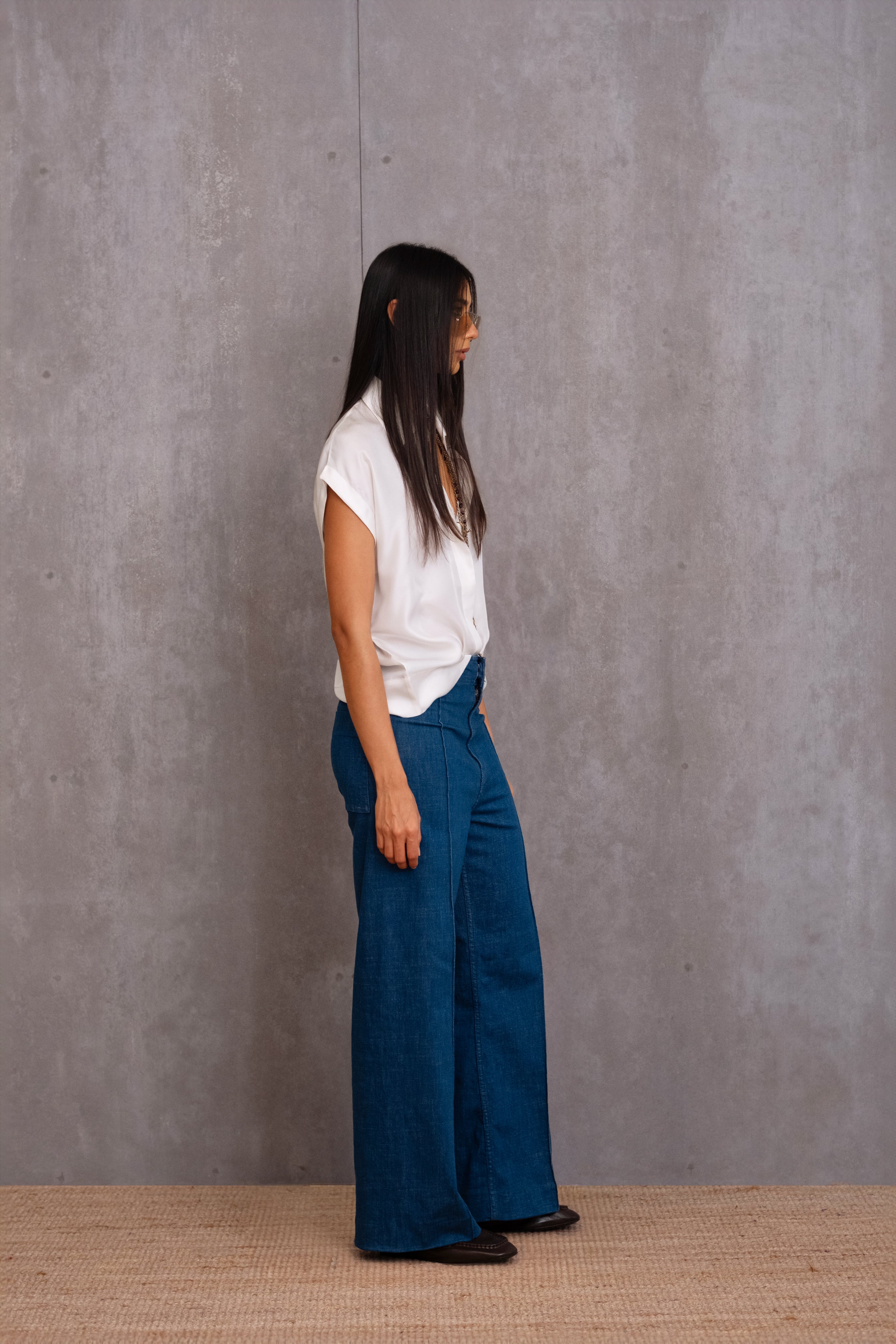 The sharp shirt collar and concealed button placket echo the garment’s clean lines, making it perfect to pair with a variety of bottoms.