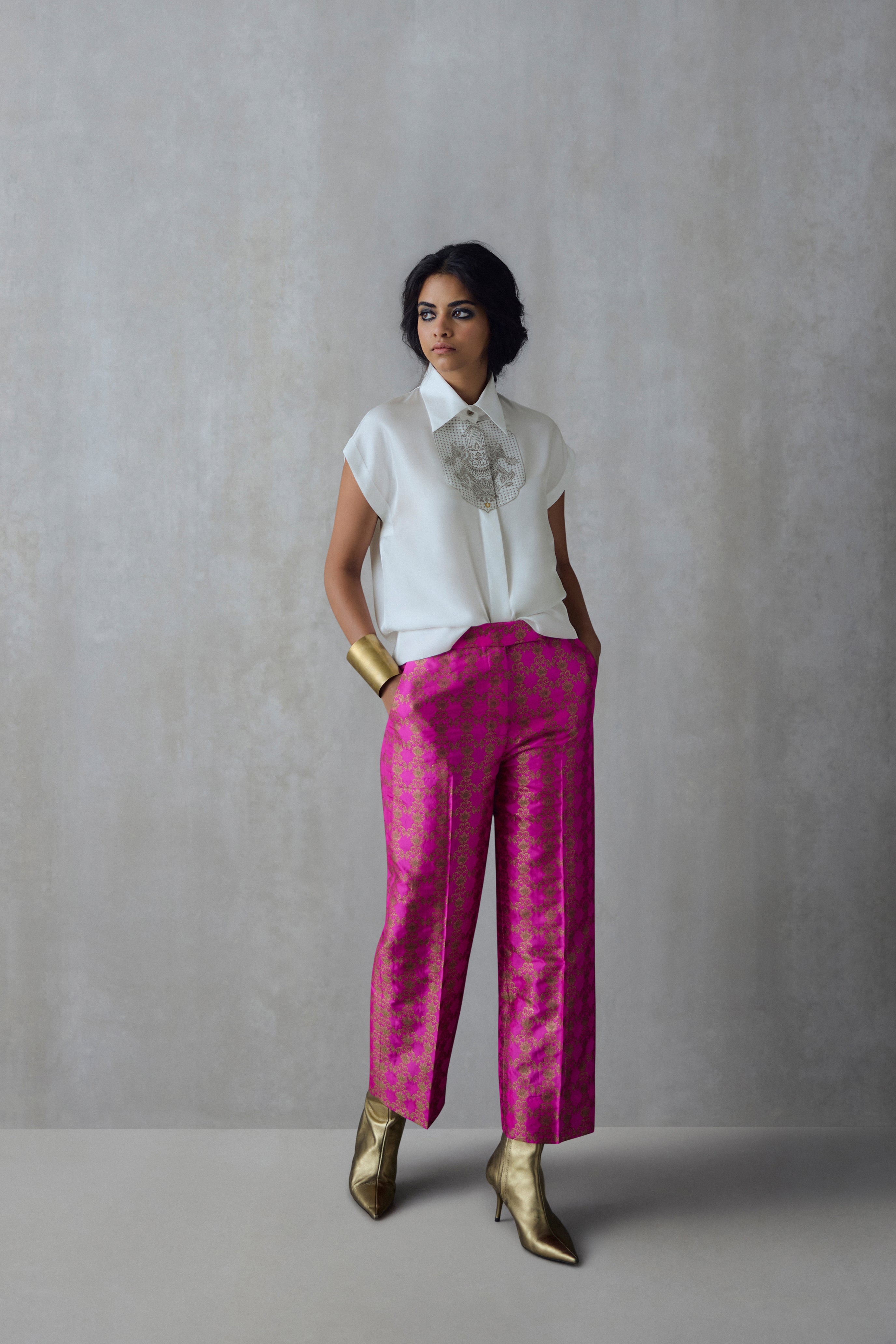 A versatile silk shirt that can be effortlessly paired with separates from your existing wardrobe. It features brocade details at the neckline, a drop-shoulder and a concealed button placket.