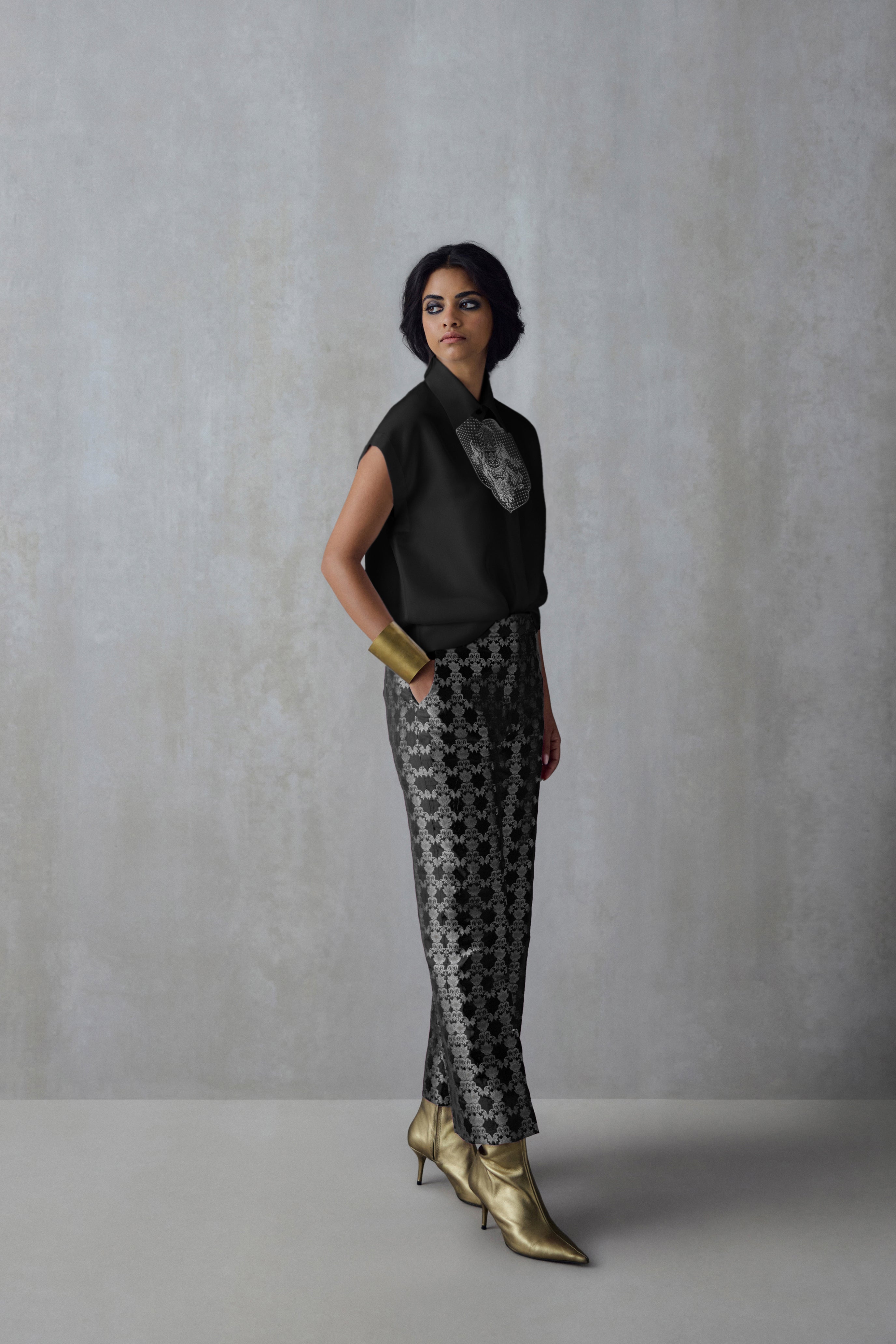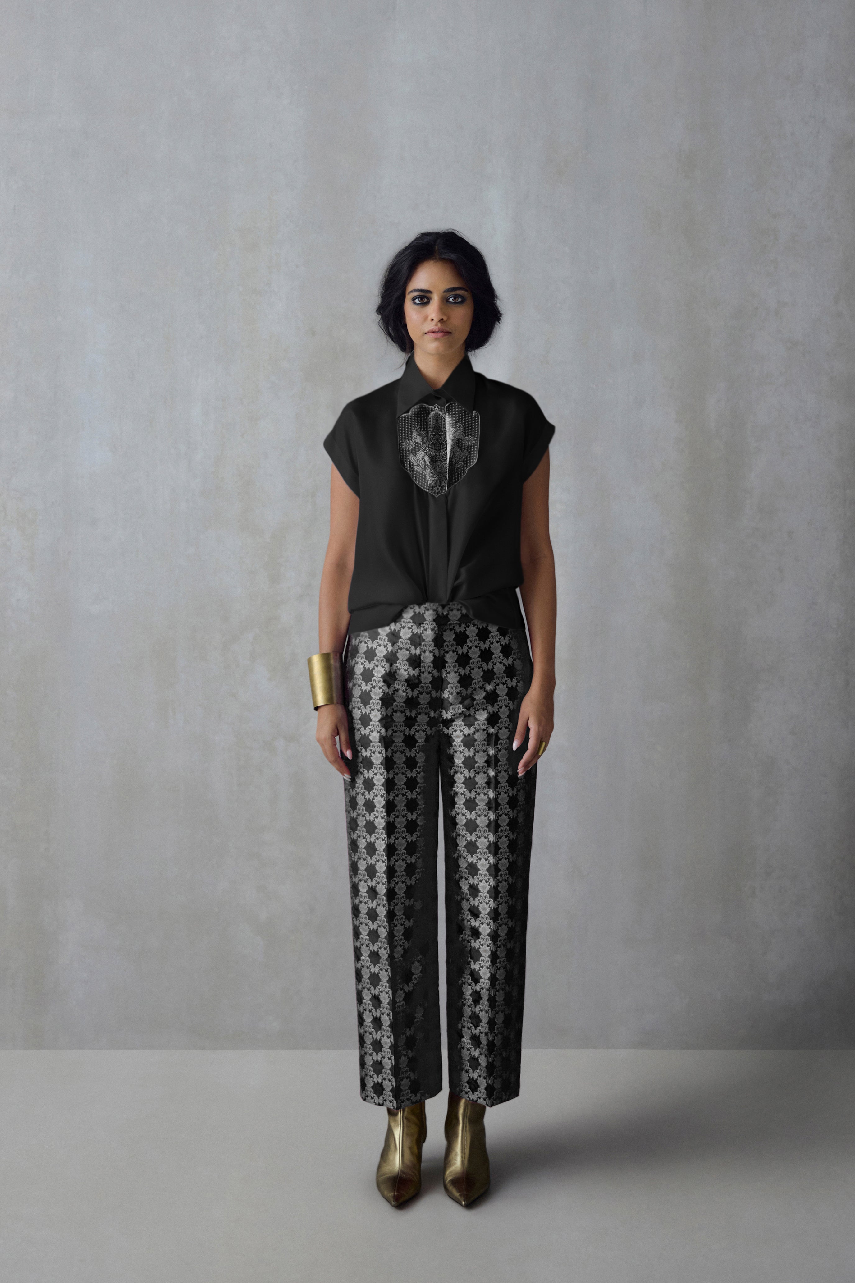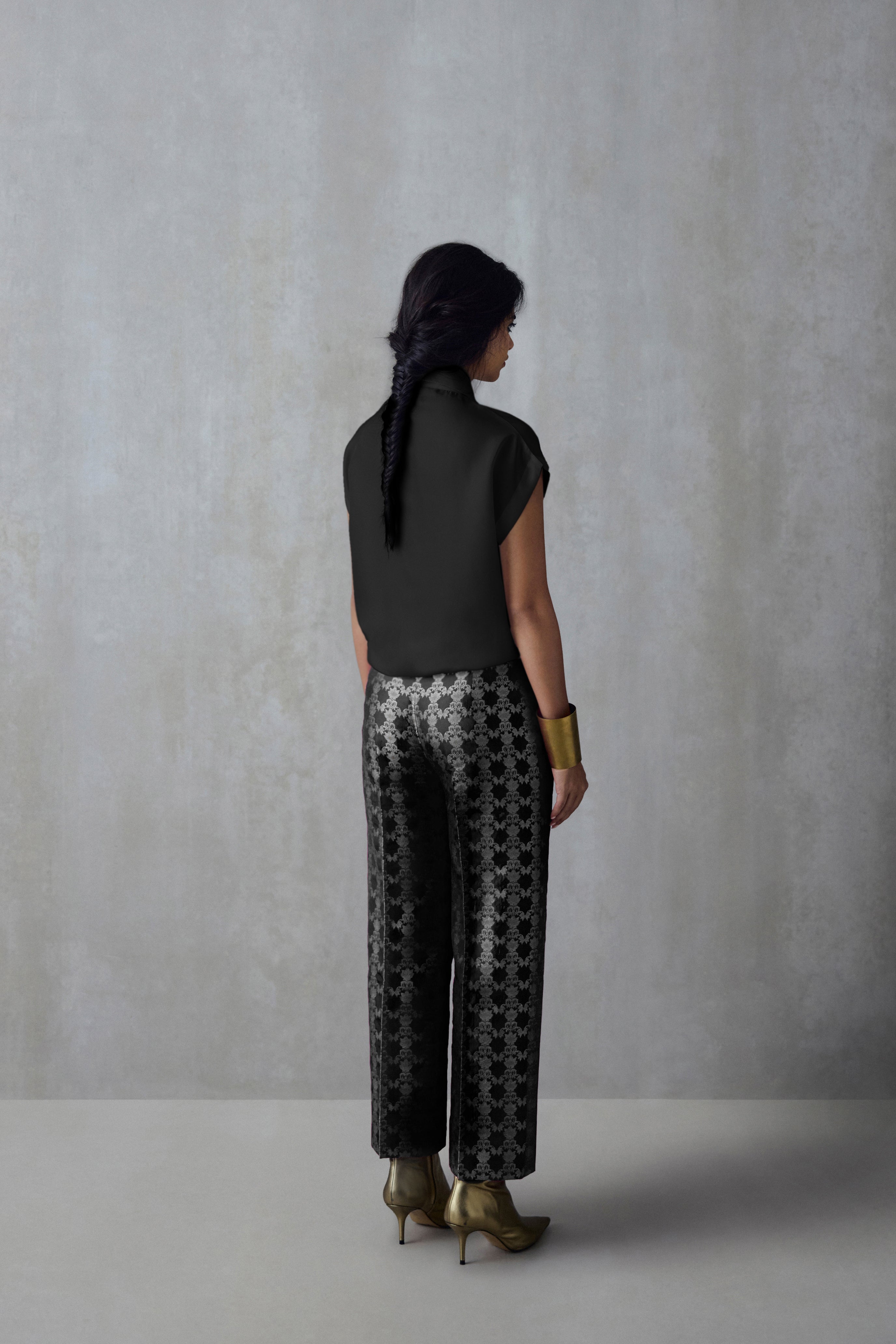 A versatile silk shirt that can be effortlessly paired with separates from your existing wardrobe. It features brocade details at the neckline, a drop-shoulder and a concealed button placket.