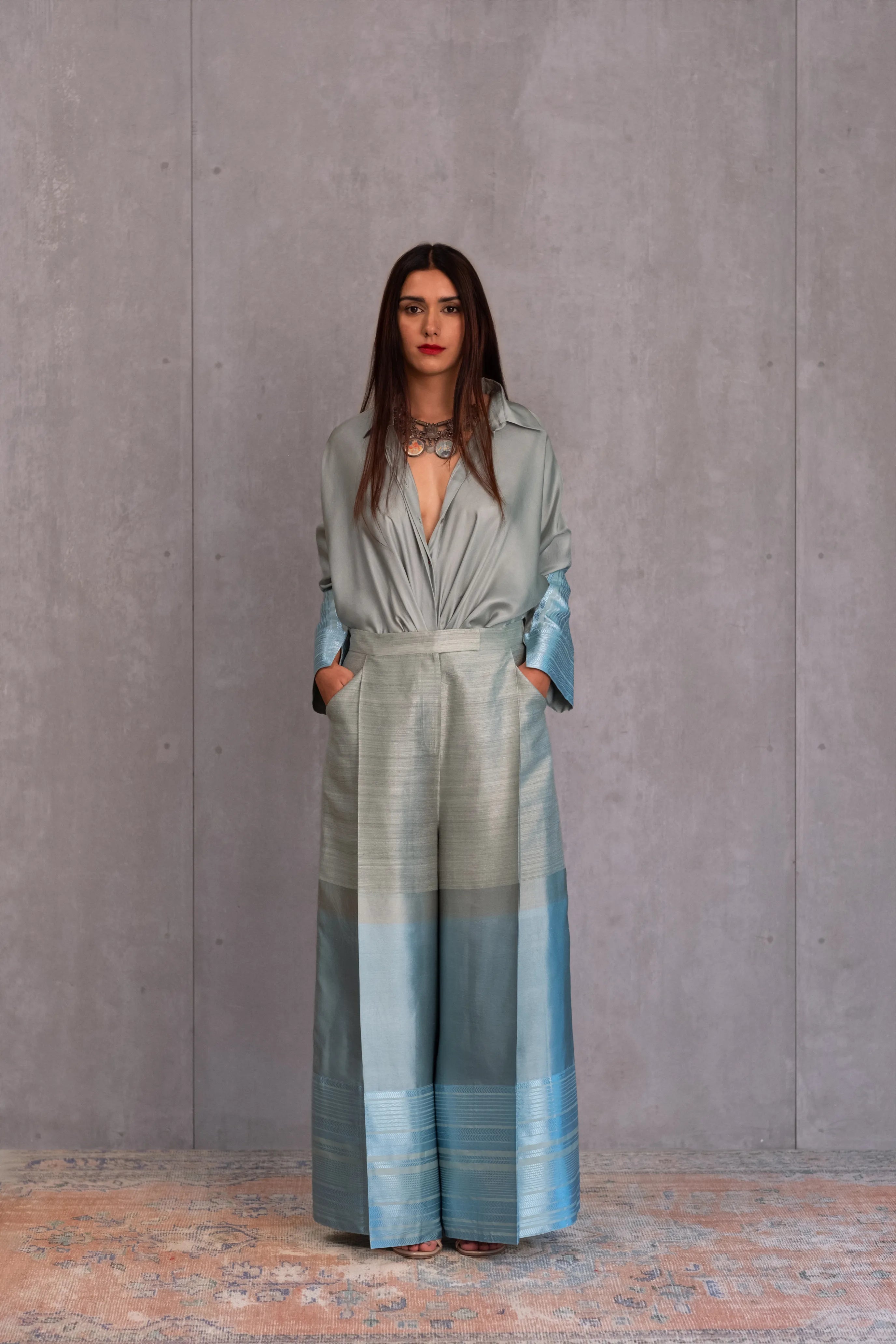 Sizing: The model is 5'8” (176 cms) and wears size M. The garment available for purchase is designed for height 5’4” (163 cms).