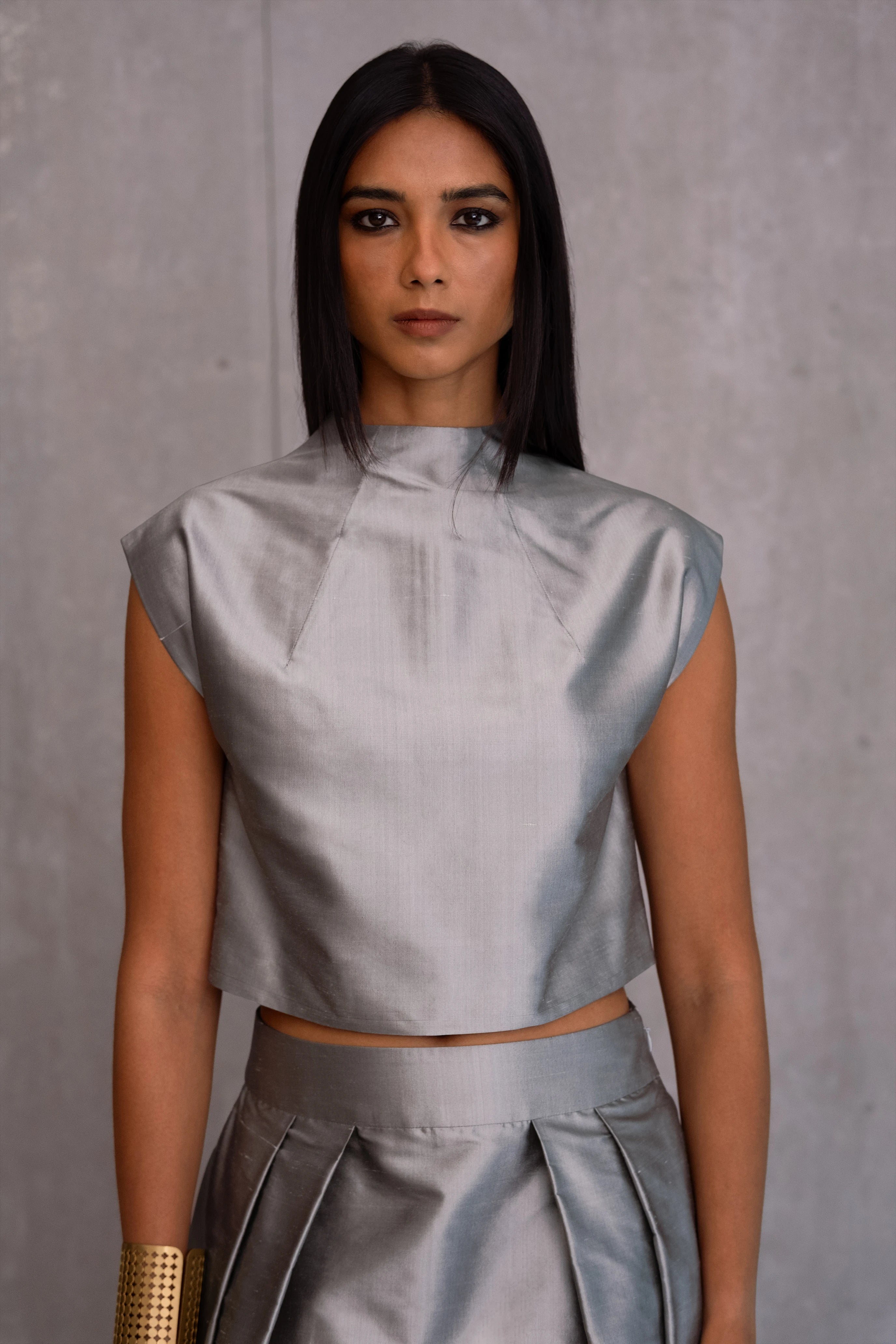 A handwoven silk top with a mock neck and darted details.