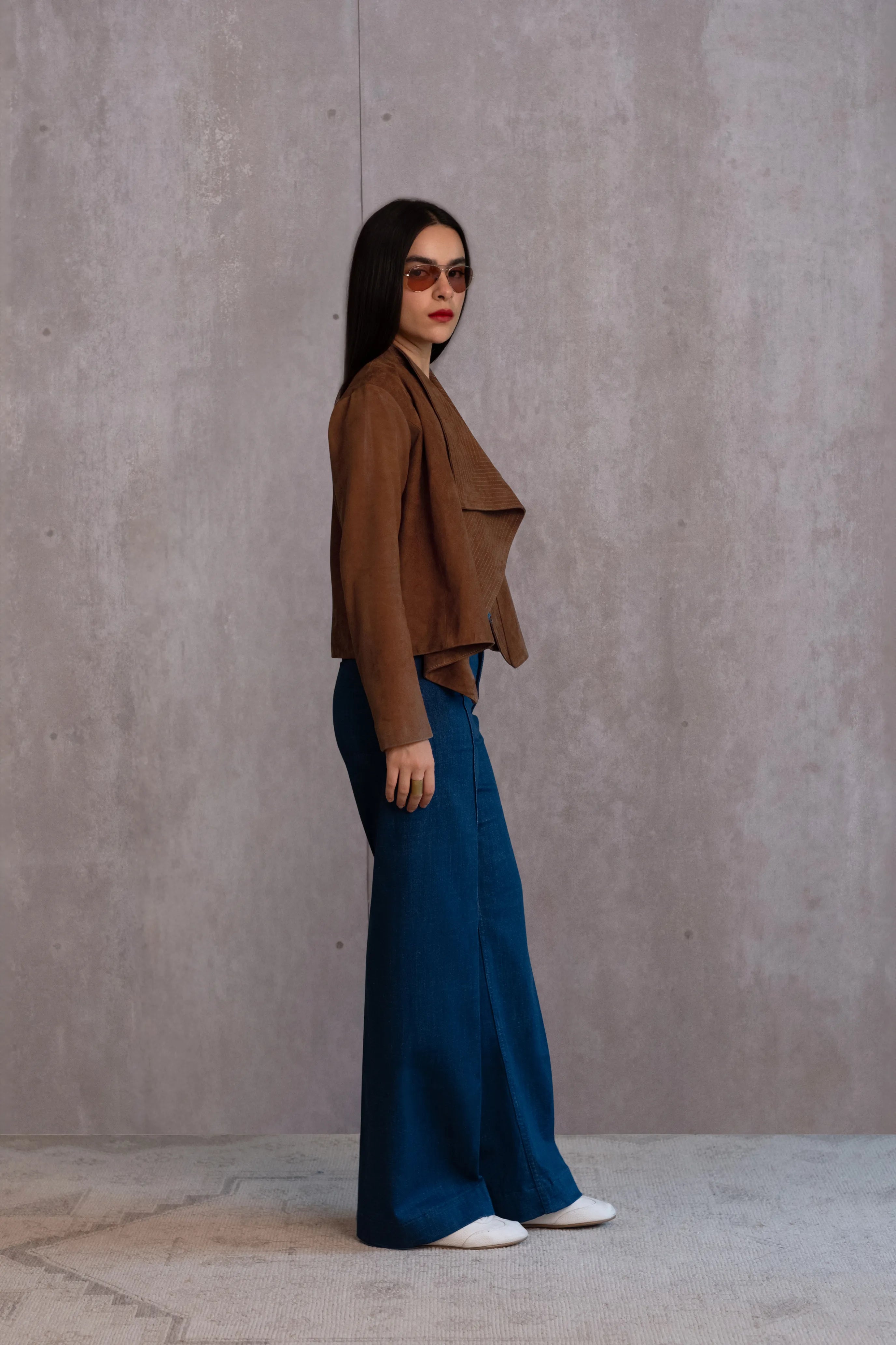 Our signature cropped jacket, handcrafted in suede, is designed with a draped lapel, offering an architectural silhouette. Featuring a contrast lining, it can be worn open or closed and makes for an easy layering option.